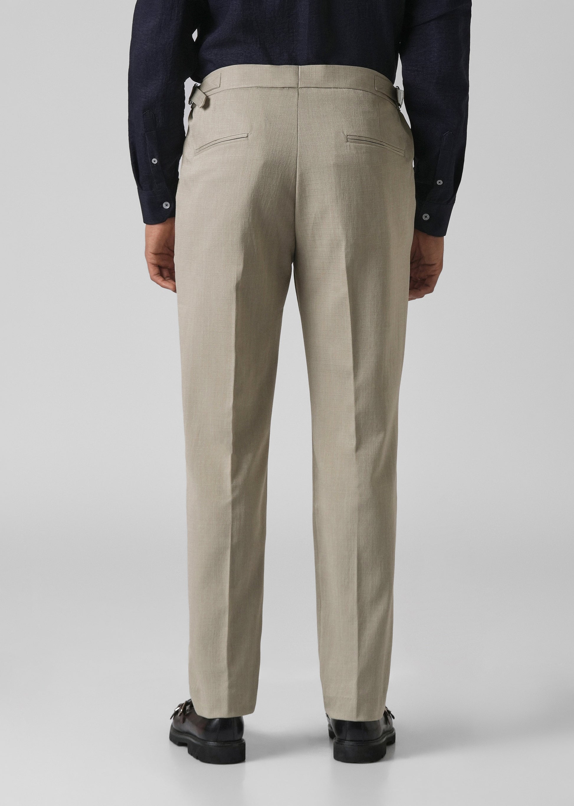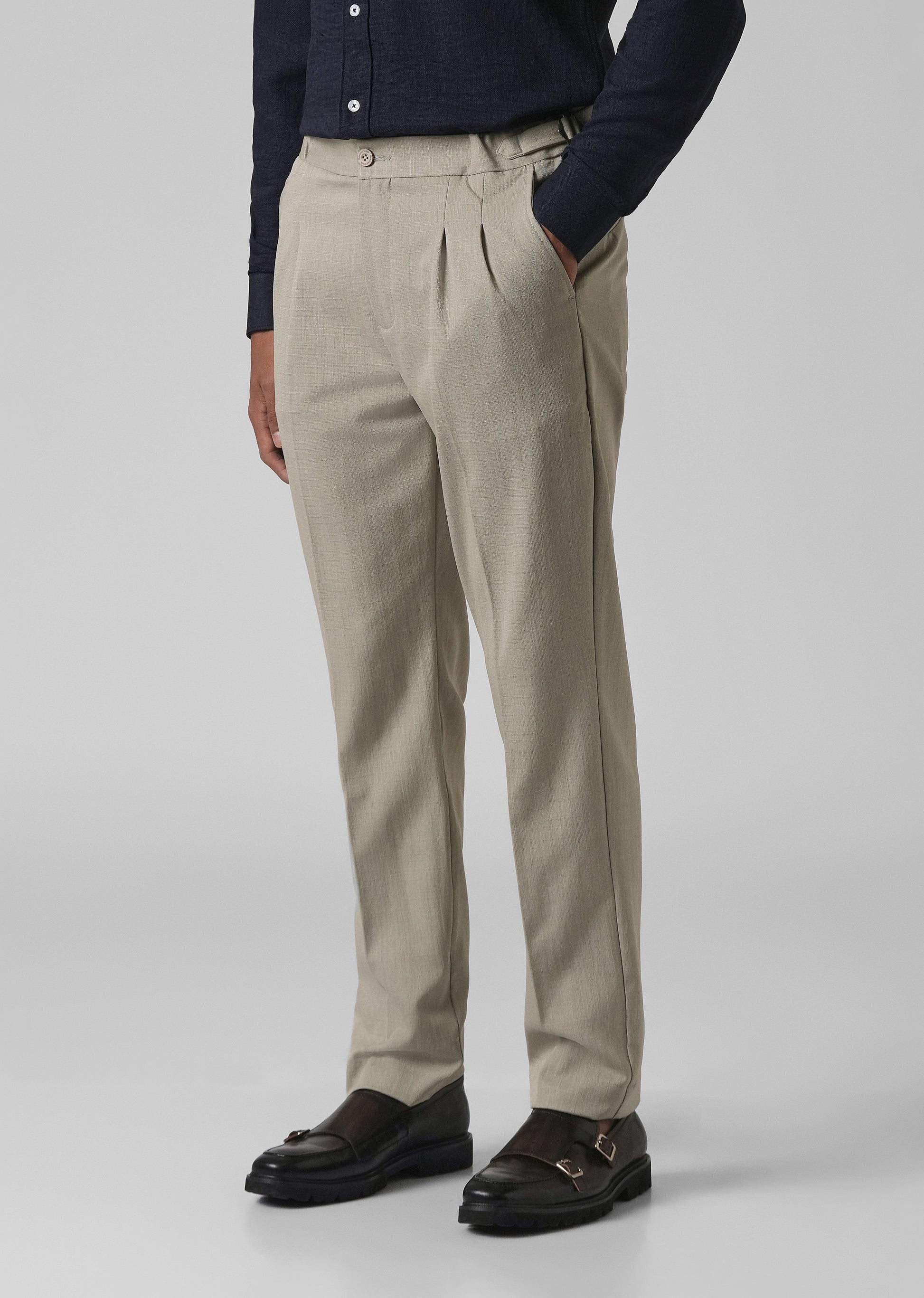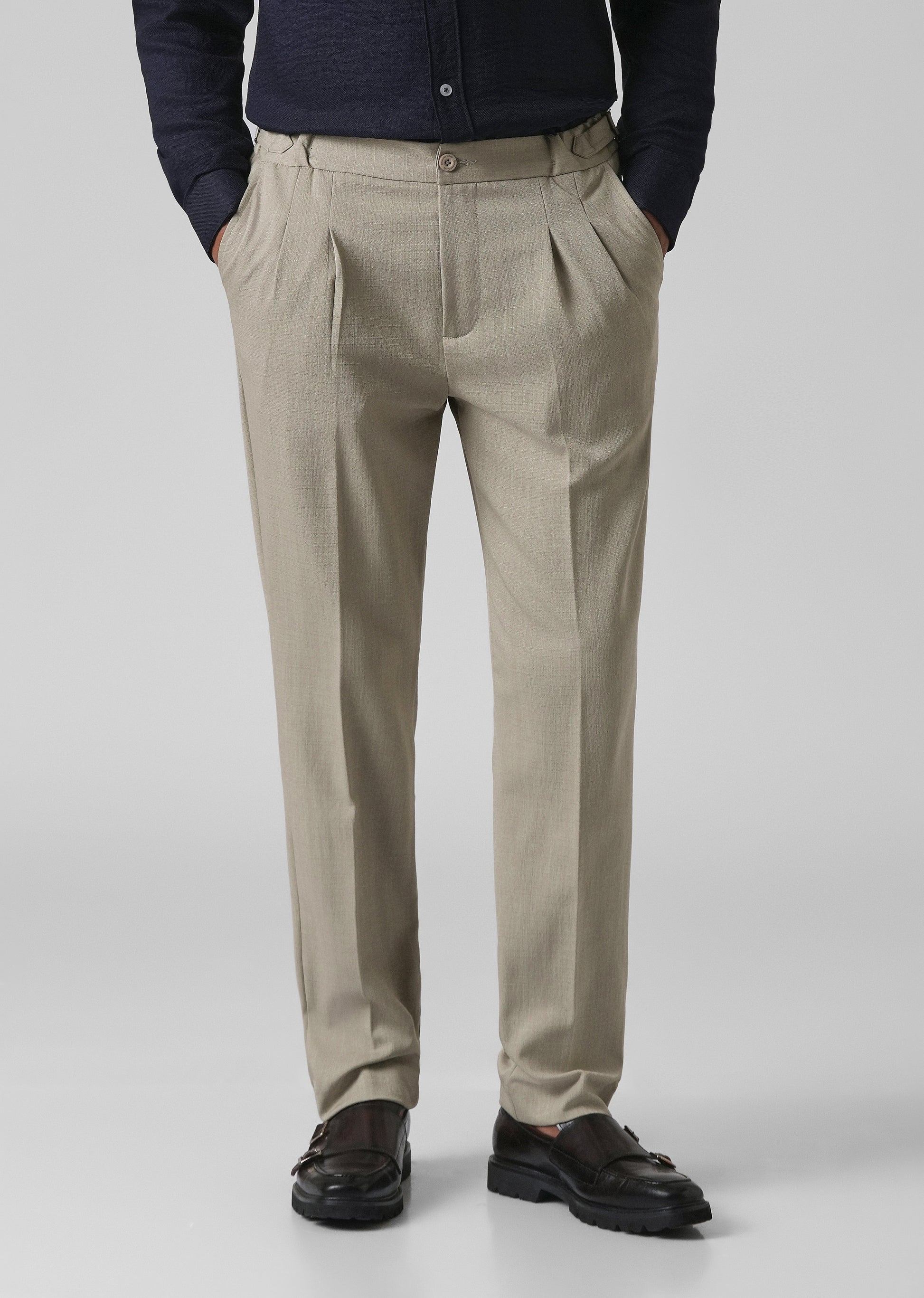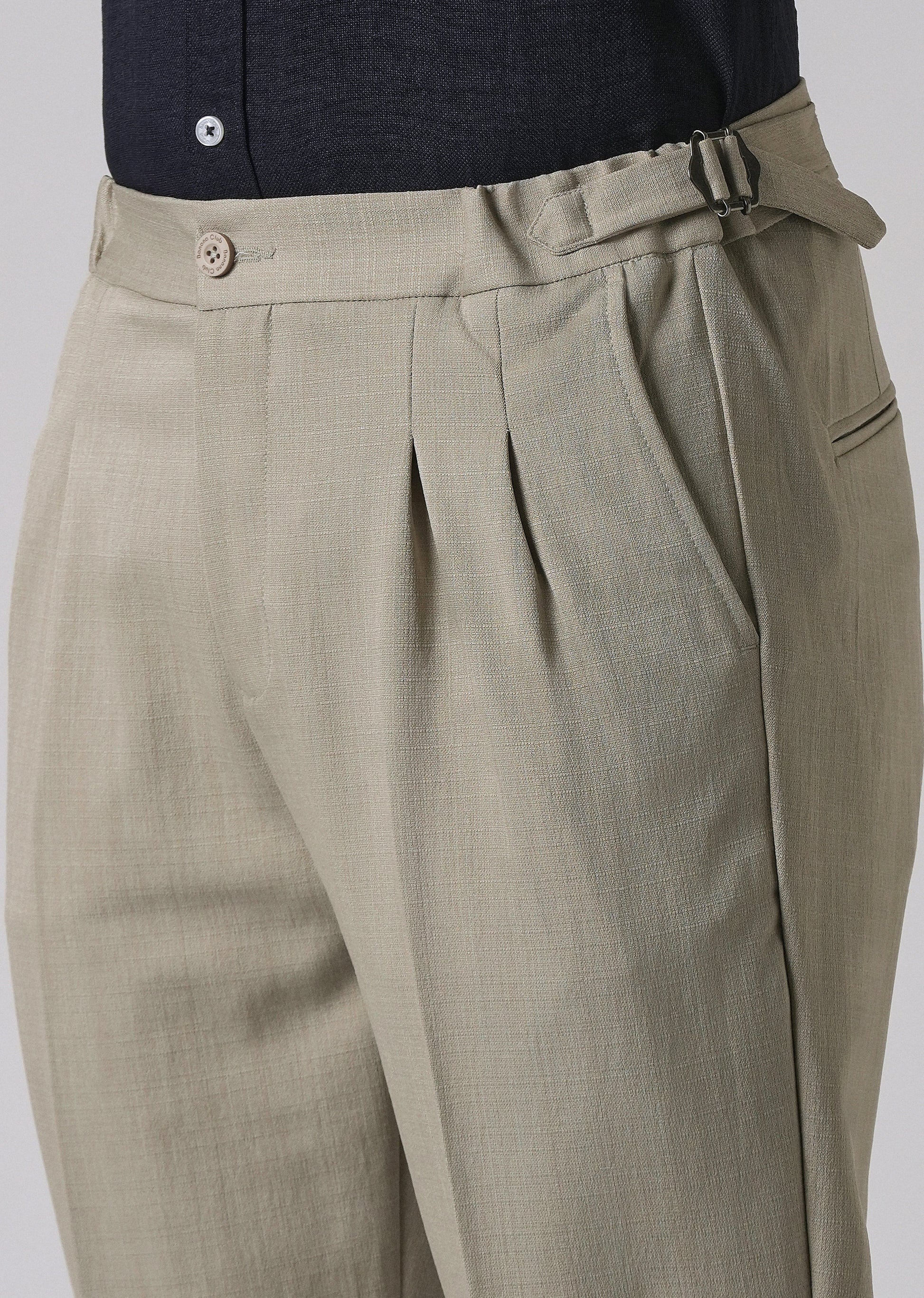 Upgrade your style with this gurkha trouser. Designed with a mid-rise waist and side buckle adjustable, it offers a perfect fit and a sharp look. The double pleats in the front give it a tailored, elegant touch, while the narrow legs keep the silhouette modern and clean. Made from lightweight fabric, it’s comfortable for all-day wear whether you’re heading to work, an event, or a weekend outing.