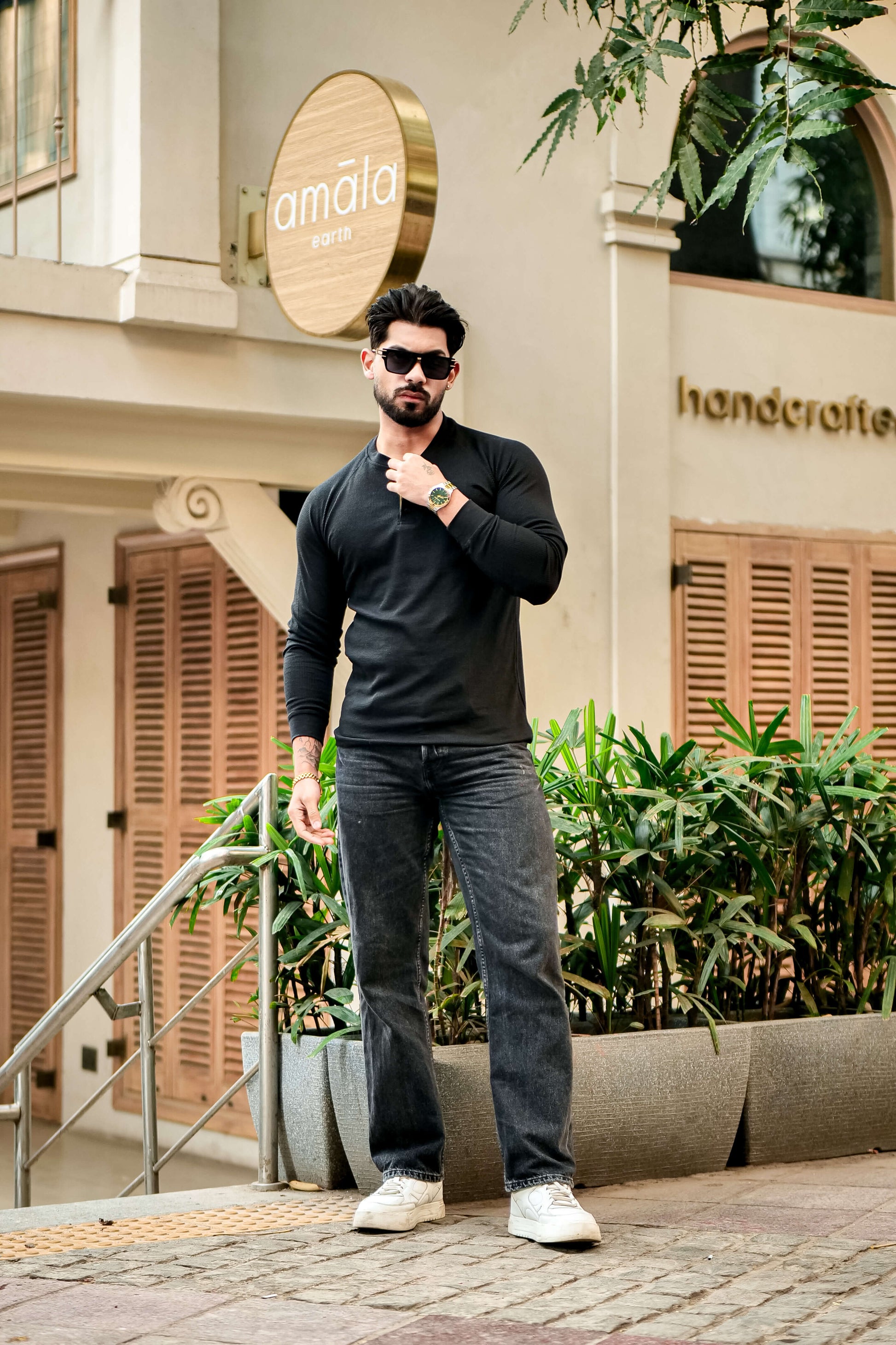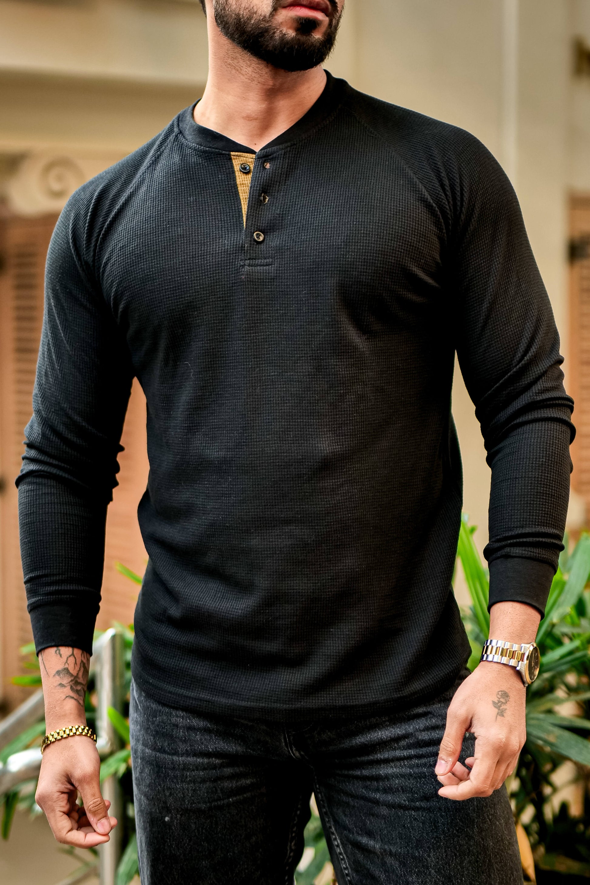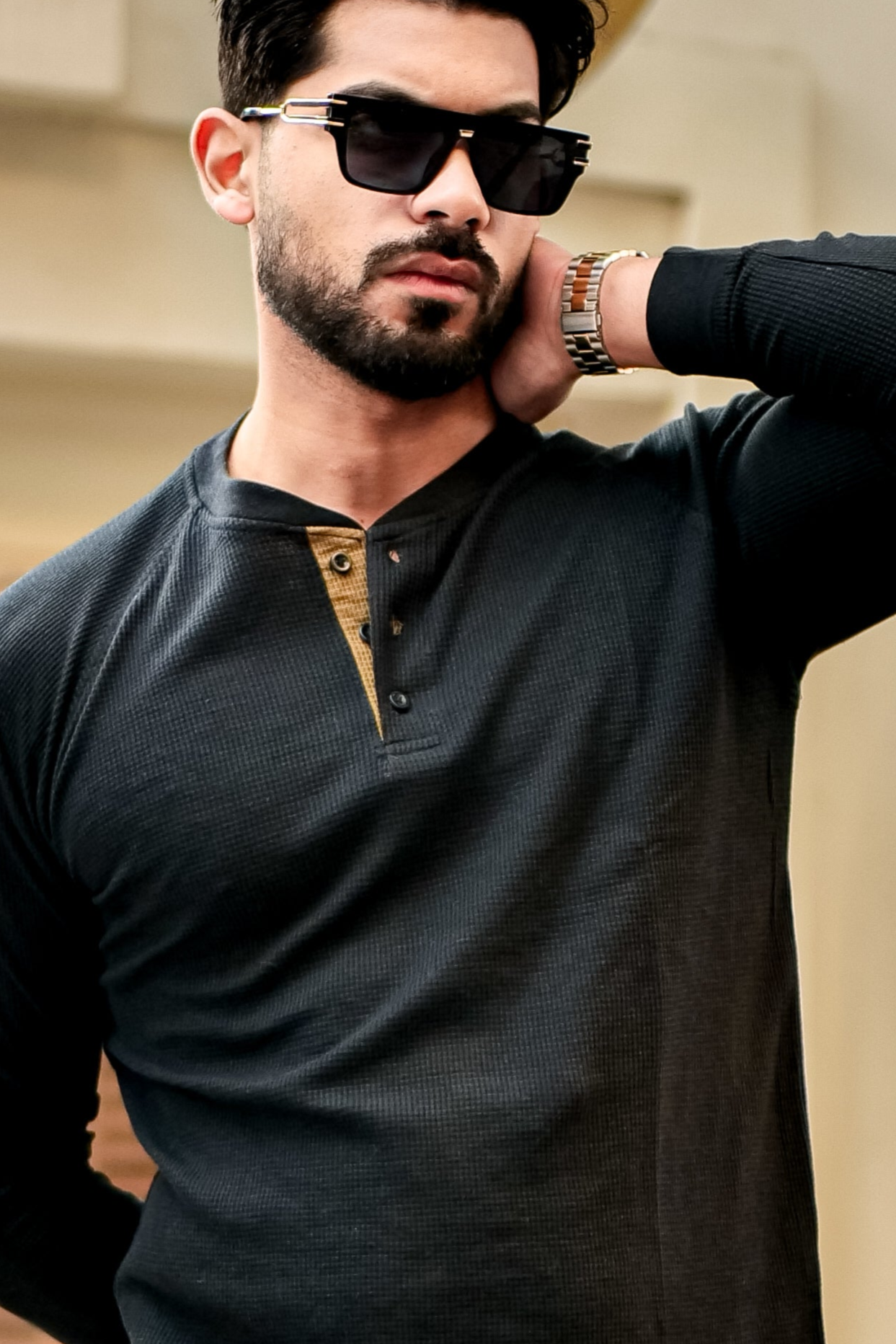 This regular henley fit t-shirt from Gritstones is made in 100% cotton fabric and comes with unique black self design pattern. Featuring long sleeves and henley neck, it combines style and comfort effortlessly. Perfect for smart casual and streetwear looks, it's a must have for the fashion-forward men.