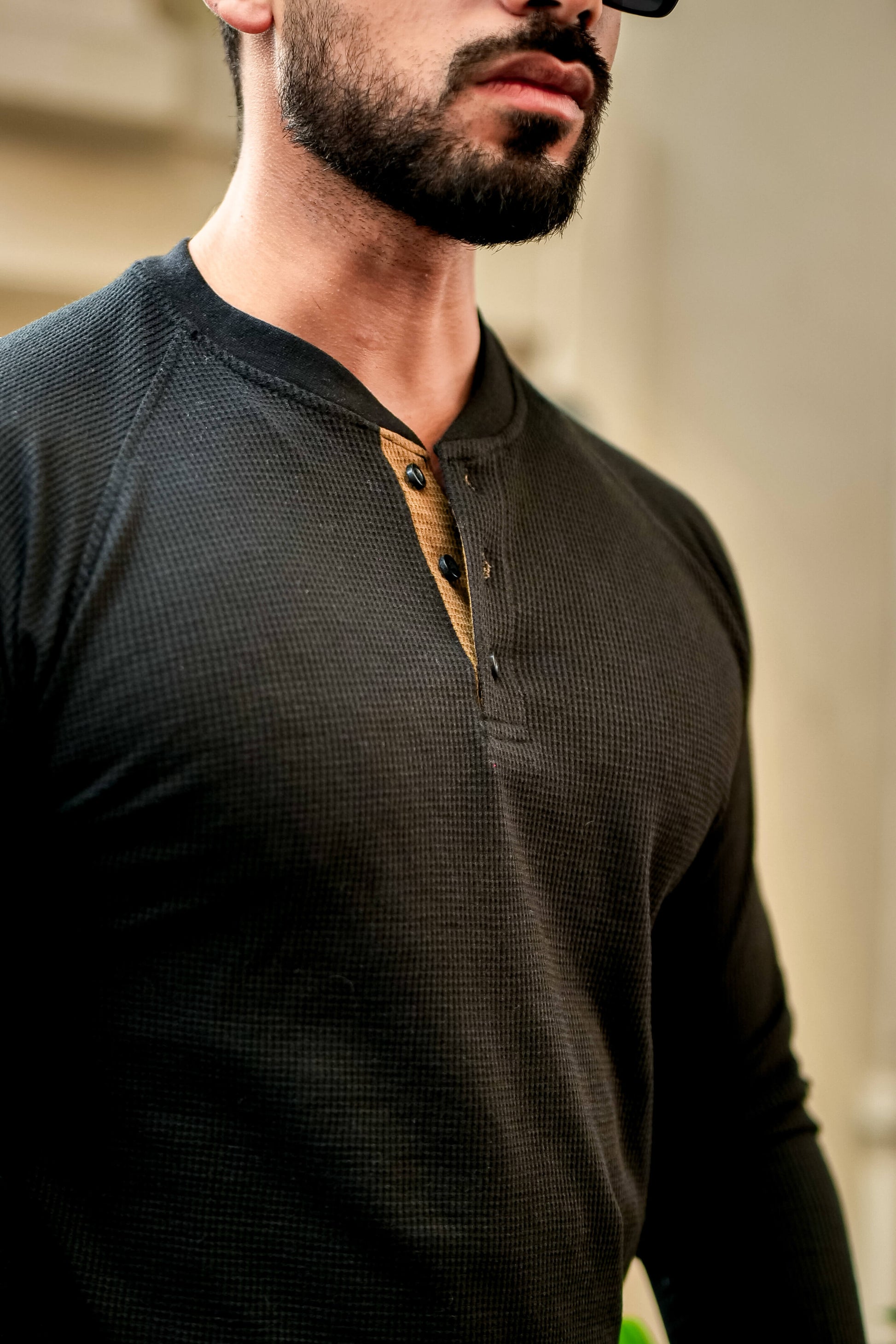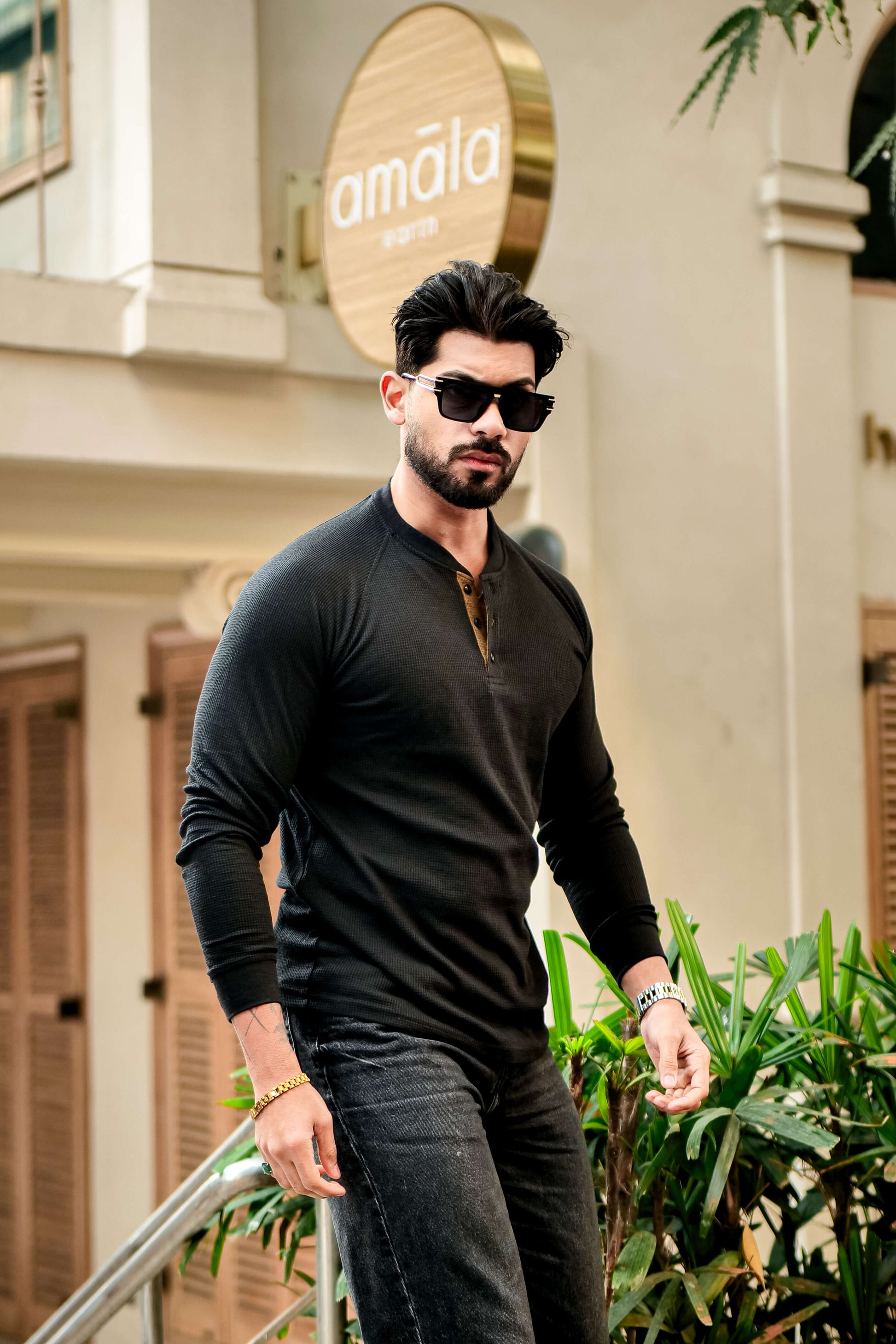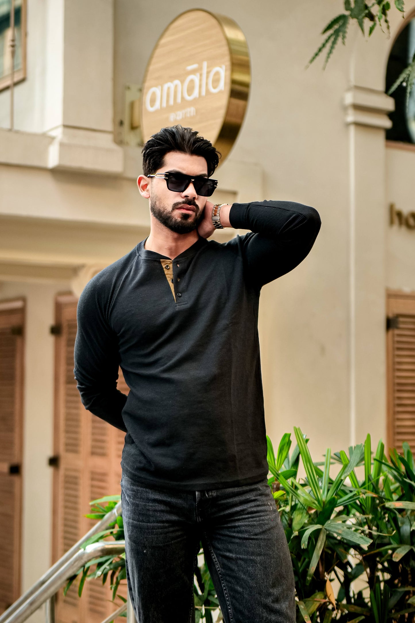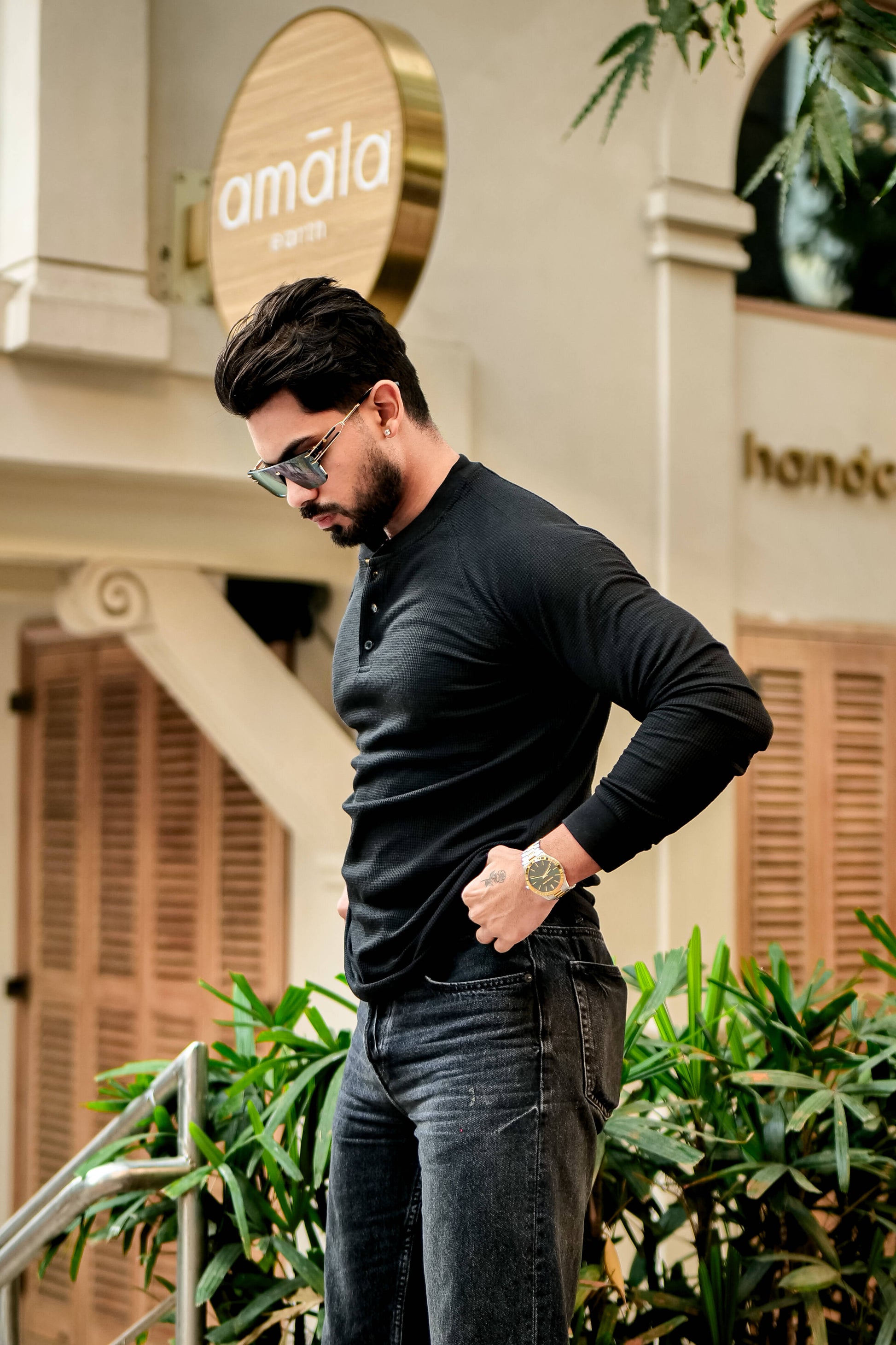 This regular henley fit t-shirt from Gritstones is made in 100% cotton fabric and comes with unique black self design pattern. Featuring long sleeves and henley neck, it combines style and comfort effortlessly. Perfect for smart casual and streetwear looks, it's a must have for the fashion-forward men.