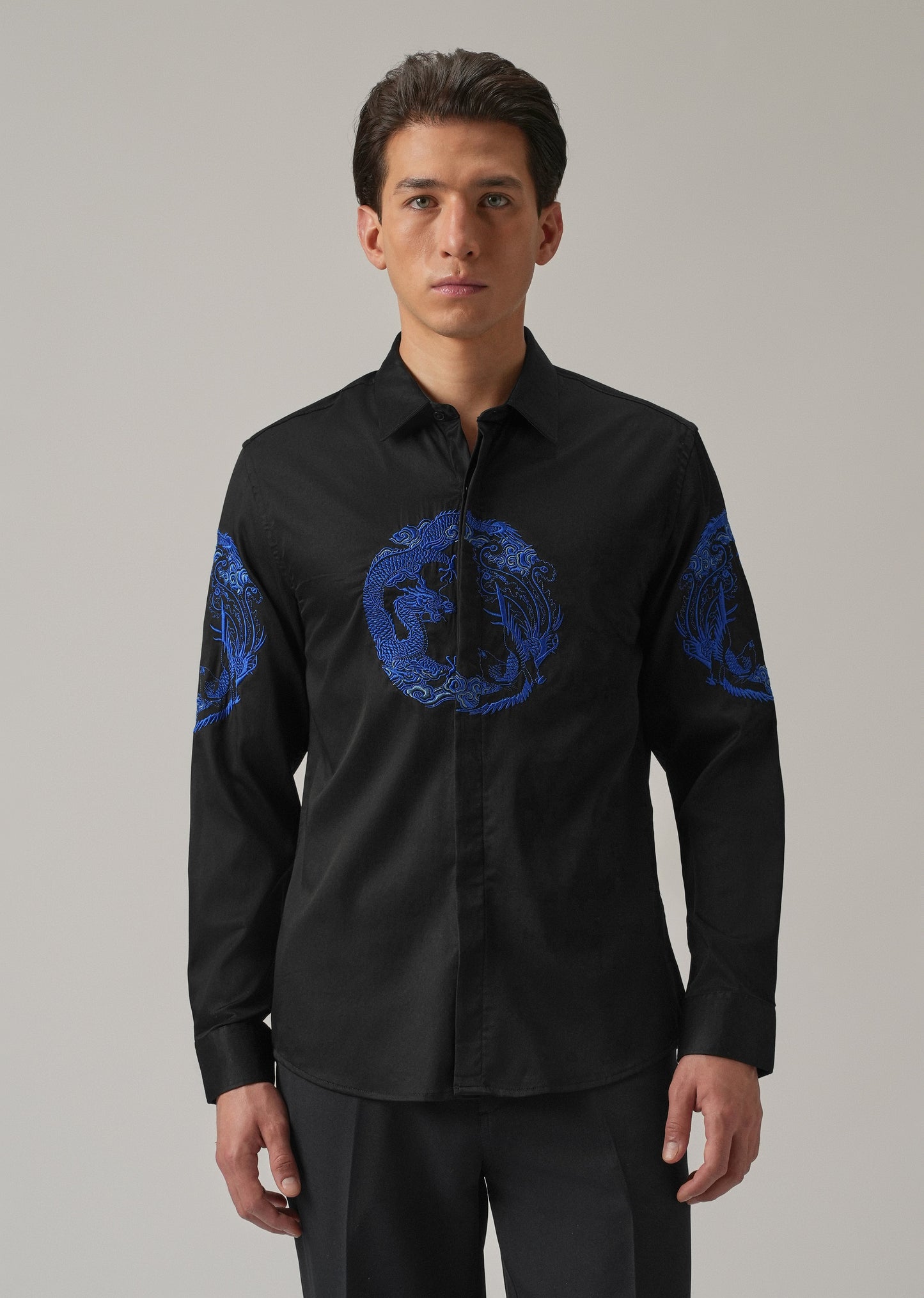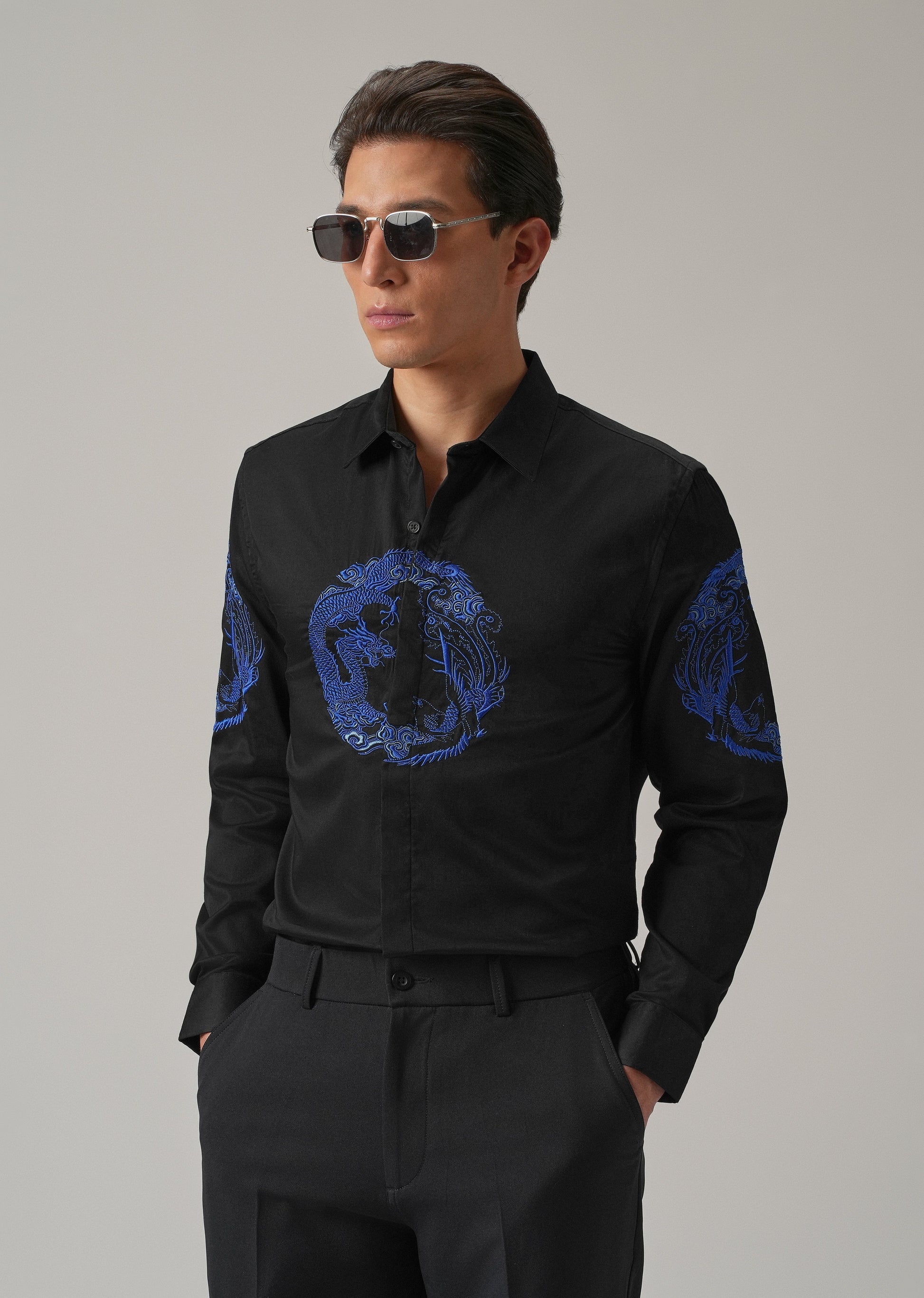 Black Dragon and Phoenix Embroidery Designer Shirt