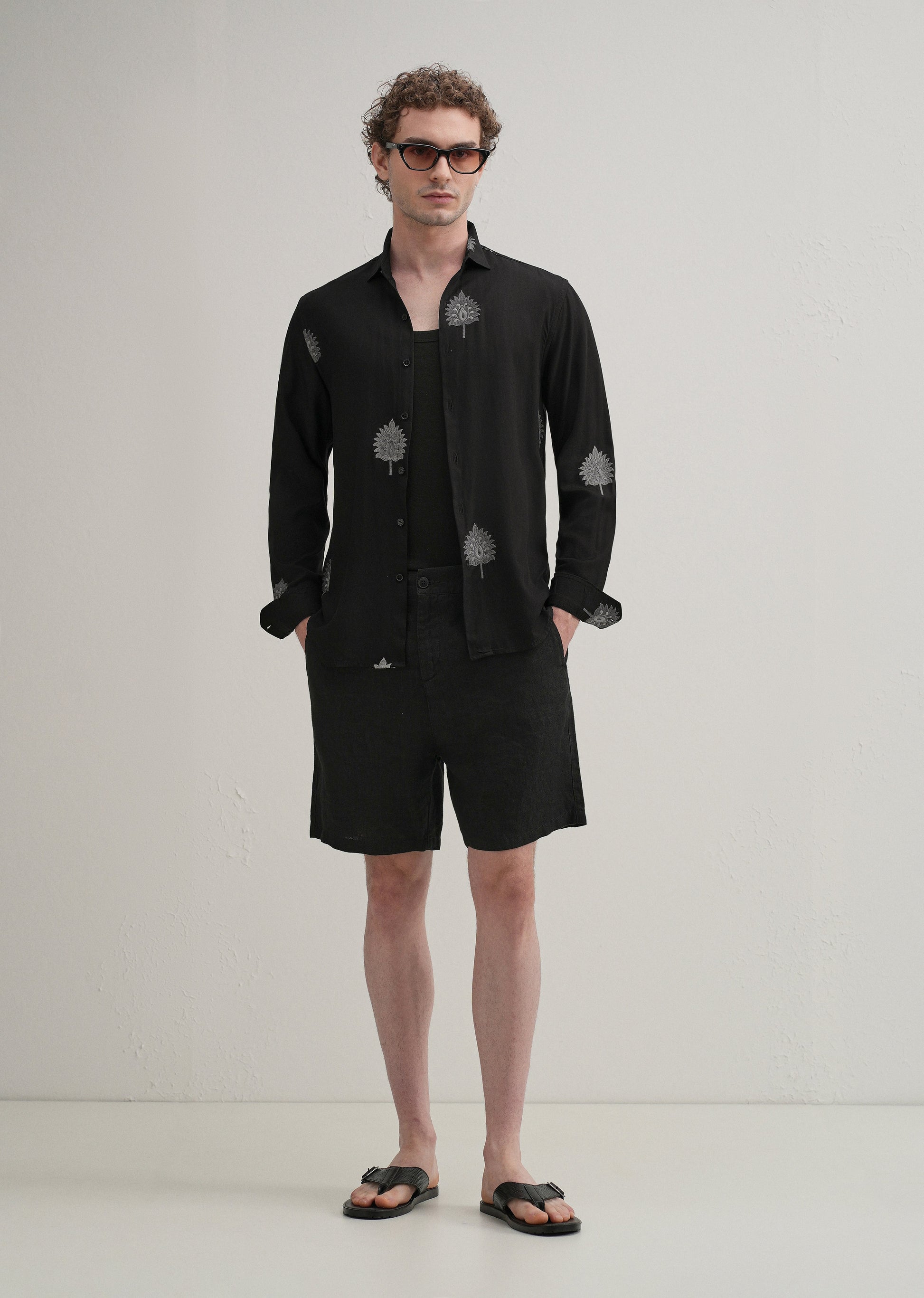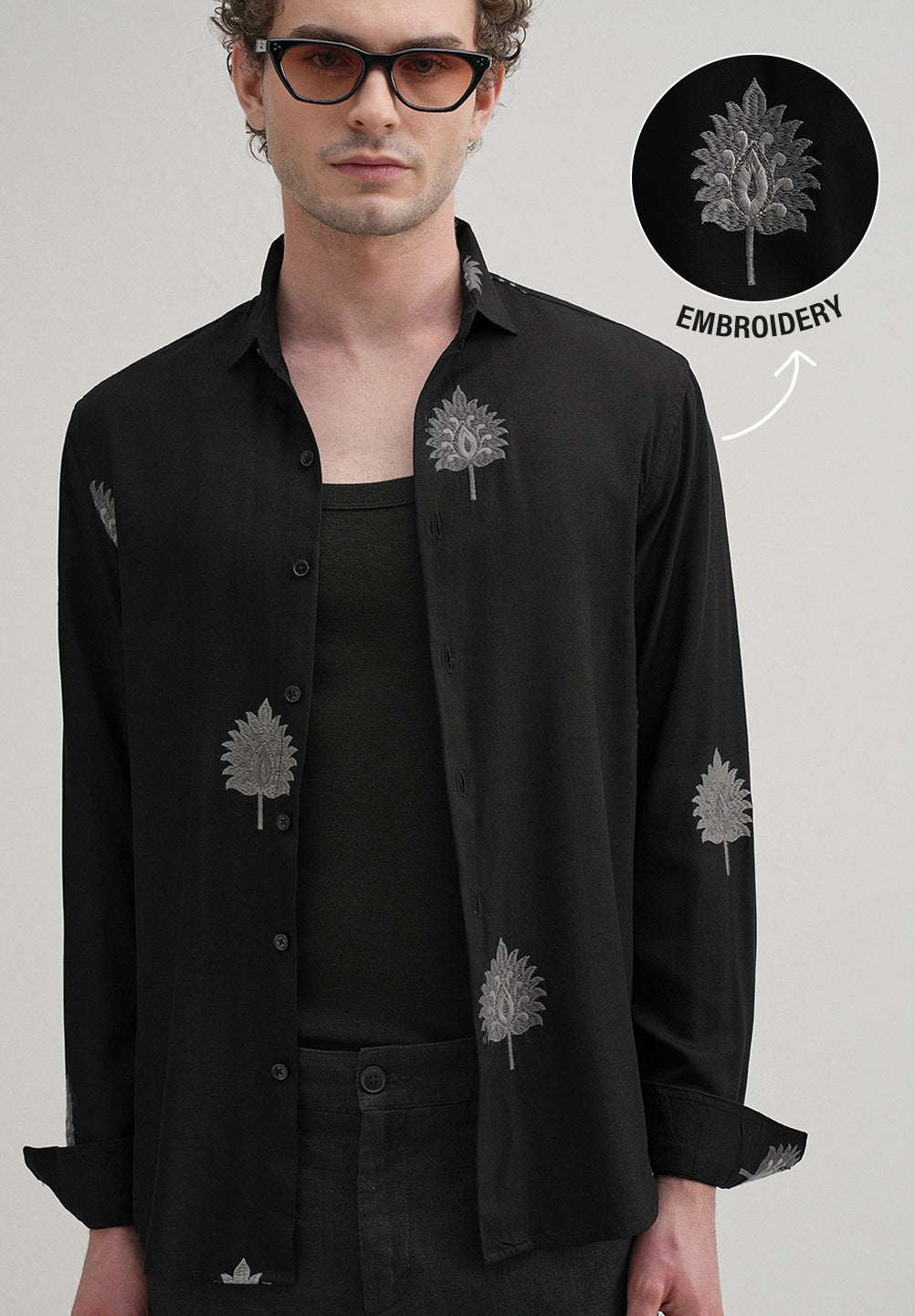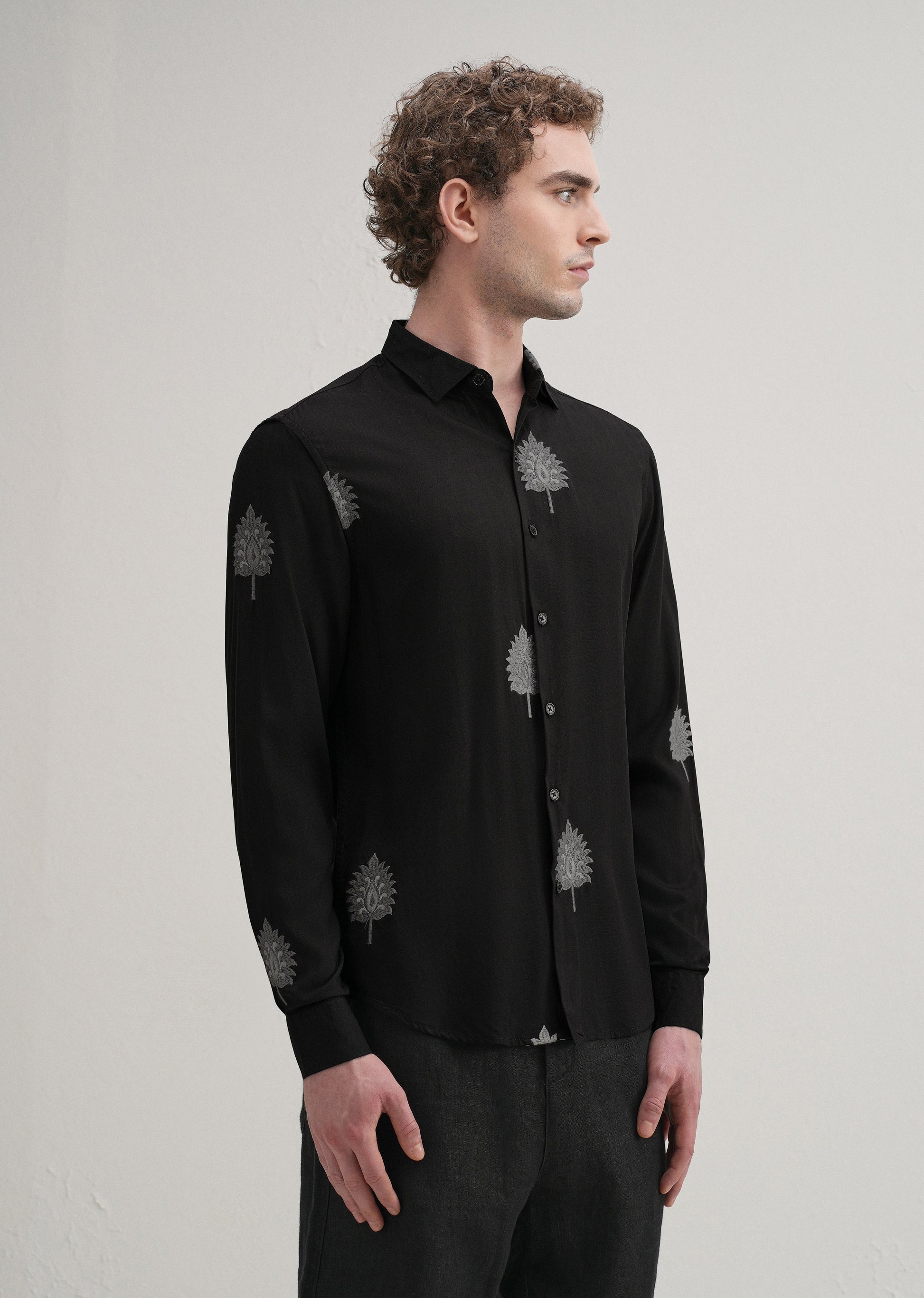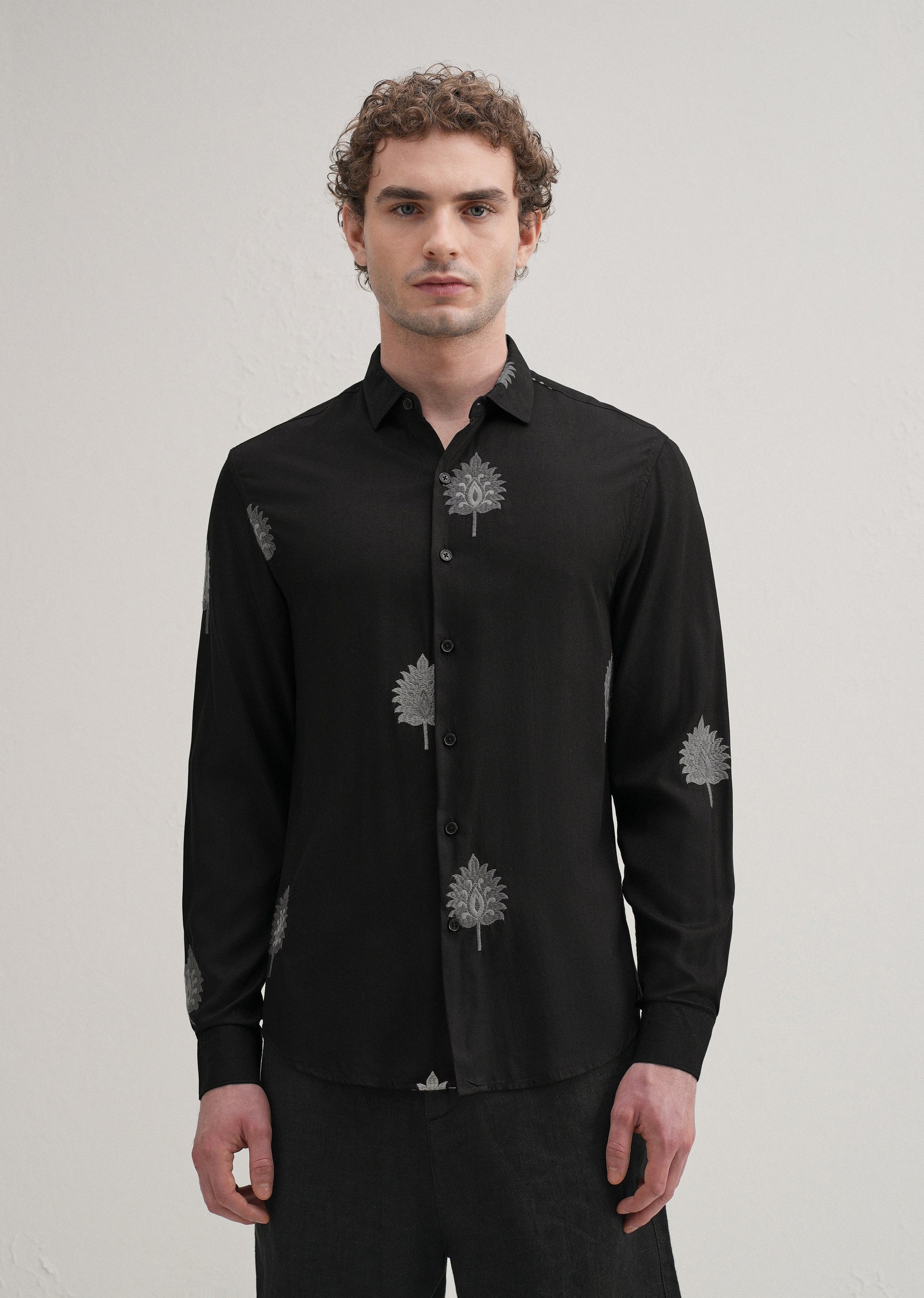 This long-sleeve button-up shirt features evenly spaced all-over embroidery and a classic pointed collar for a refined look. Crafted from a lightweight blend of 55% Tencel and 45% viscose, it offers a relaxed drape and breathable comfort. The curved hemline adds a casual touch, making it versatile for both laid-back and smart-casual outfits.