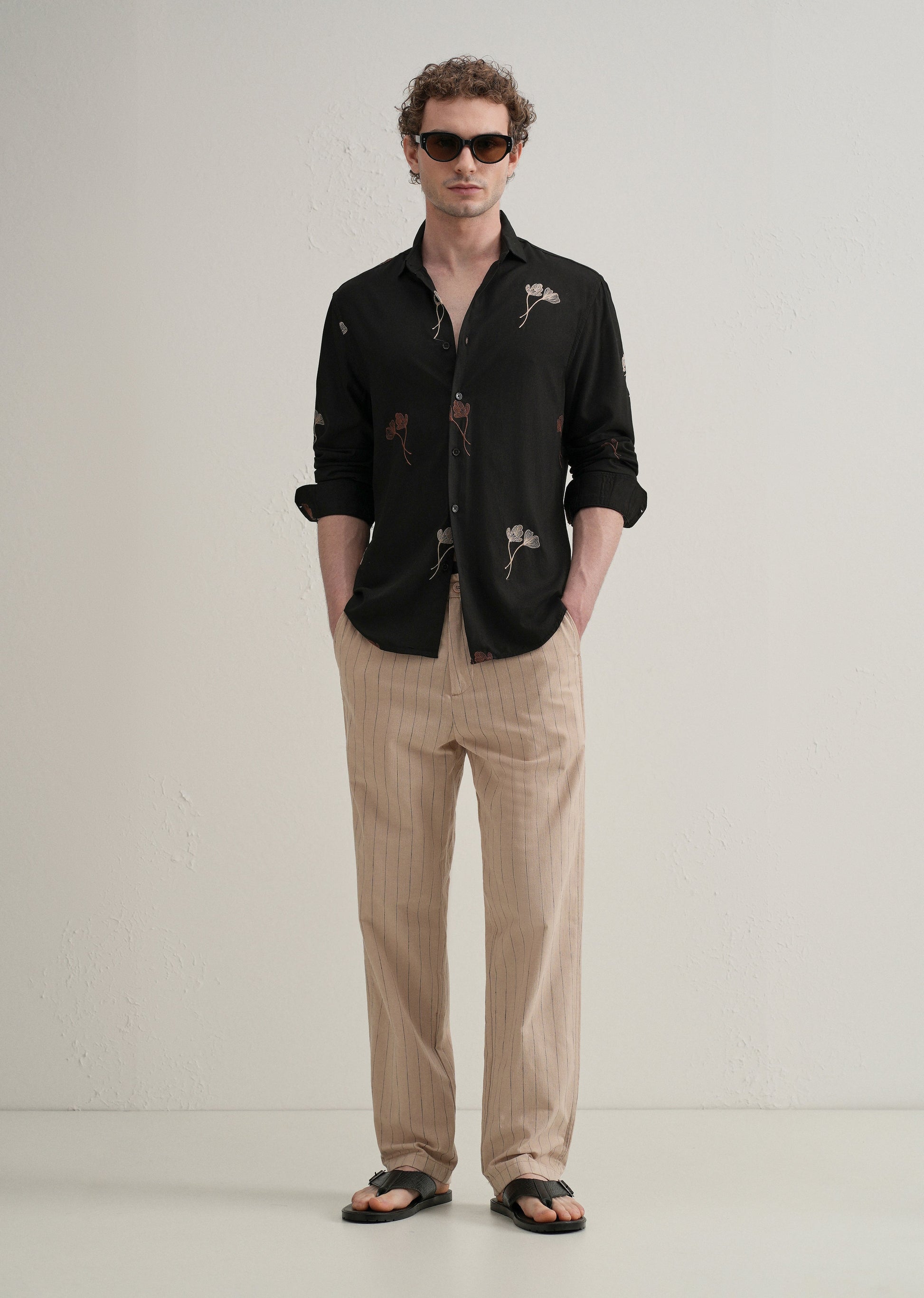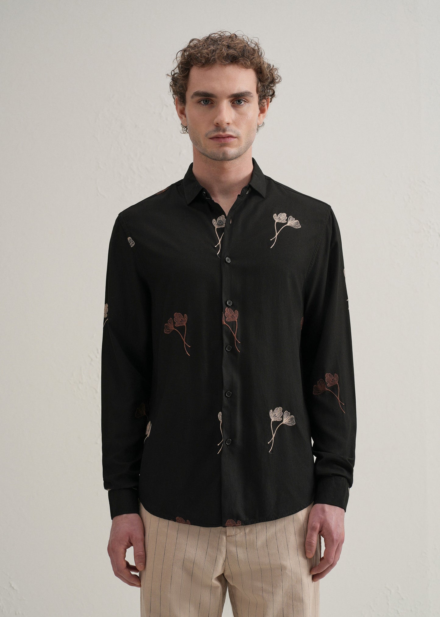 This long-sleeve button-up shirt features evenly spaced all-over embroidery and a classic pointed collar for a refined look. Crafted from a lightweight blend of 55% Tencel and 45% viscose, it offers a relaxed drape and breathable comfort. The curved hemline adds a casual touch, making it versatile for both laid-back and smart-casual outfits.
