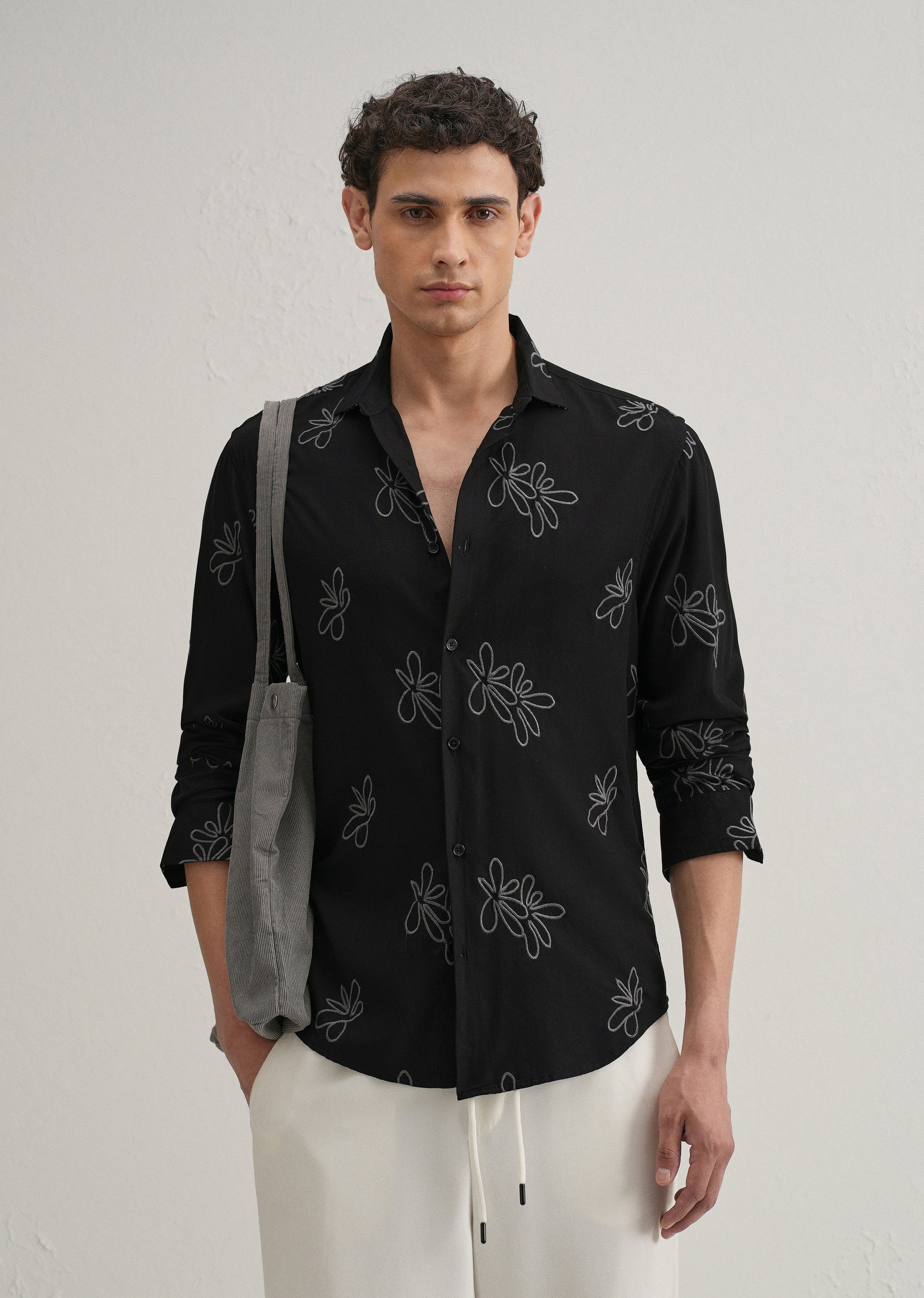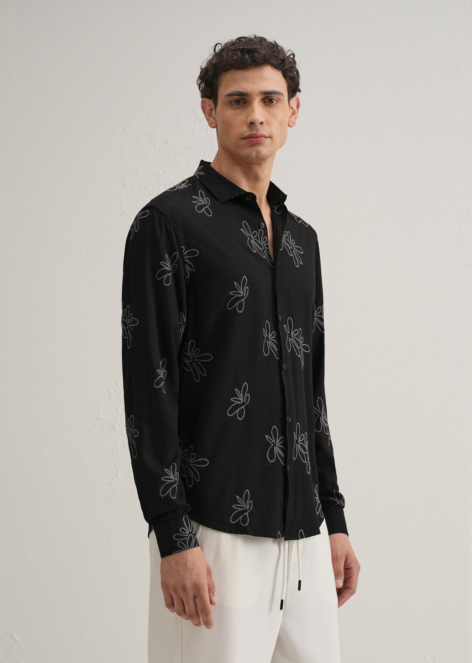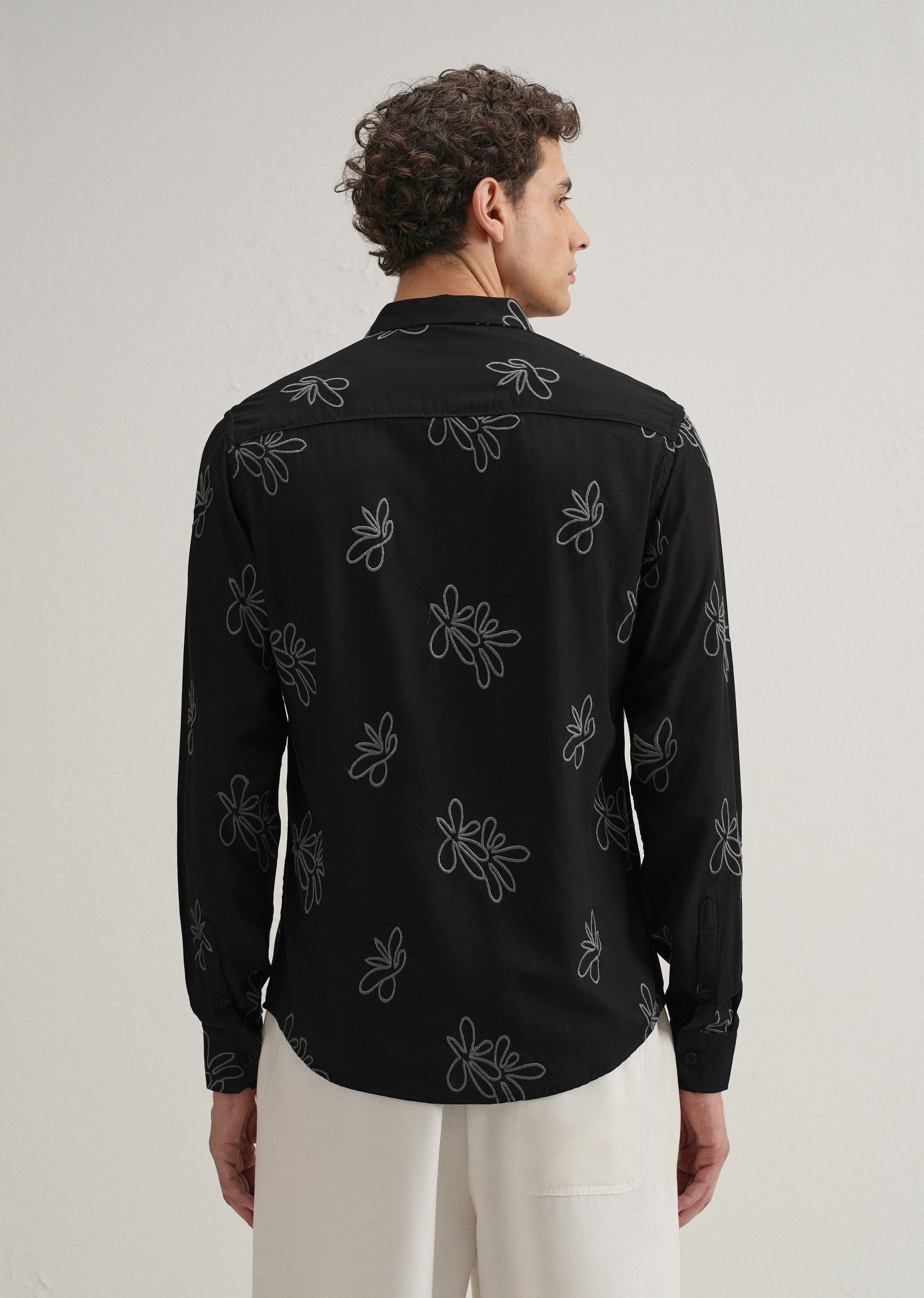 This long-sleeve button-up shirt features evenly spaced all-over embroidery and a classic pointed collar for a refined look. Crafted from a lightweight blend of 55% Tencel and 45% viscose, it offers a relaxed drape and breathable comfort. The curved hemline adds a casual touch, making it versatile for both laid-back and smart-casual outfits.