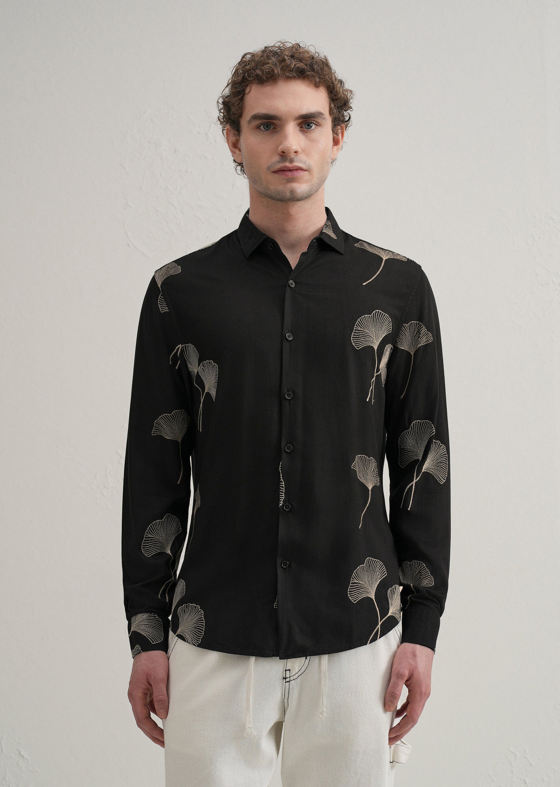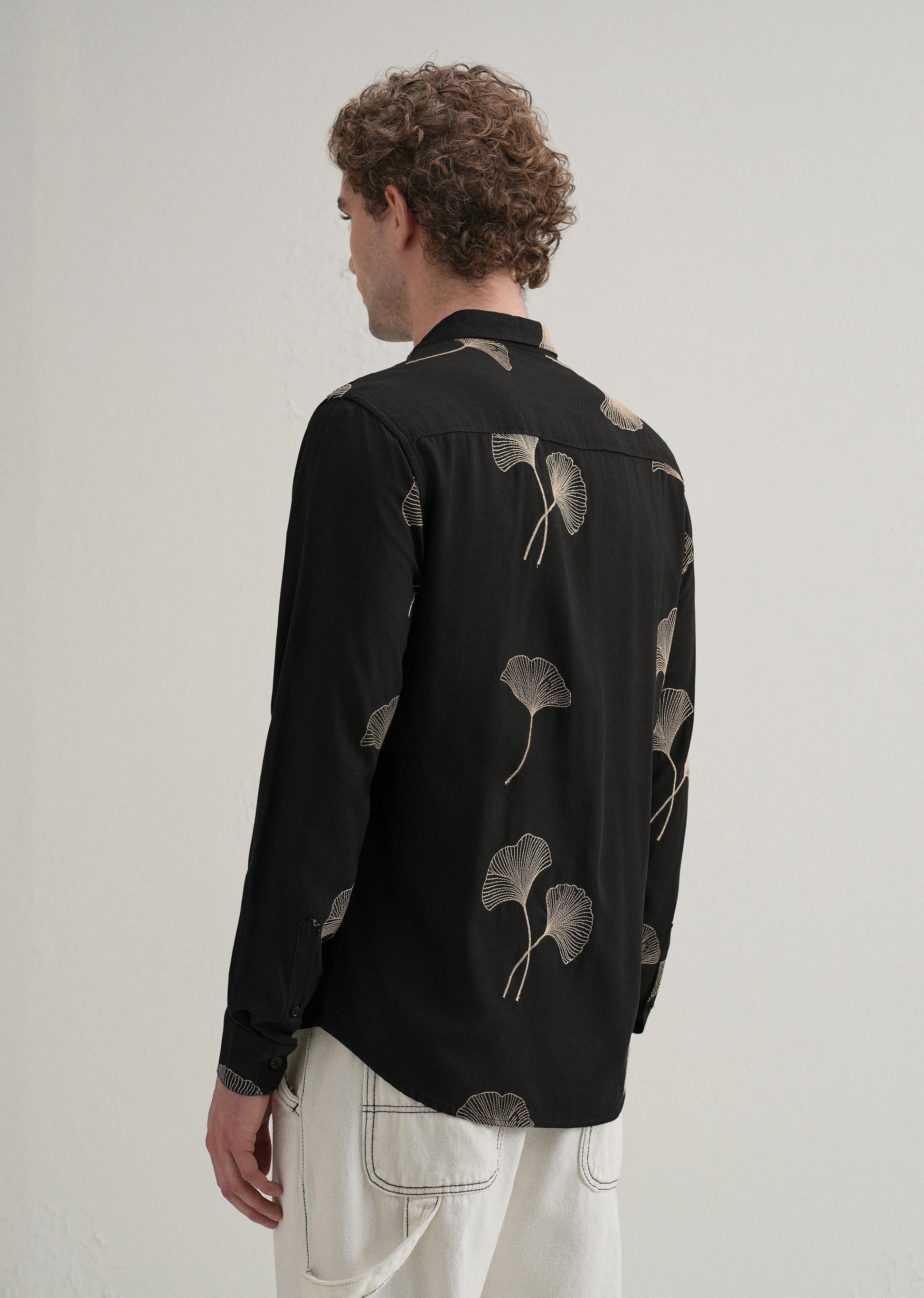This long-sleeve button-up shirt features evenly spaced all-over embroidery and a classic pointed collar for a refined look. Crafted from a lightweight blend of 55% Tencel and 45% viscose, it offers a relaxed drape and breathable comfort. The curved hemline adds a casual touch, making it versatile for both laid-back and smart-casual outfits.