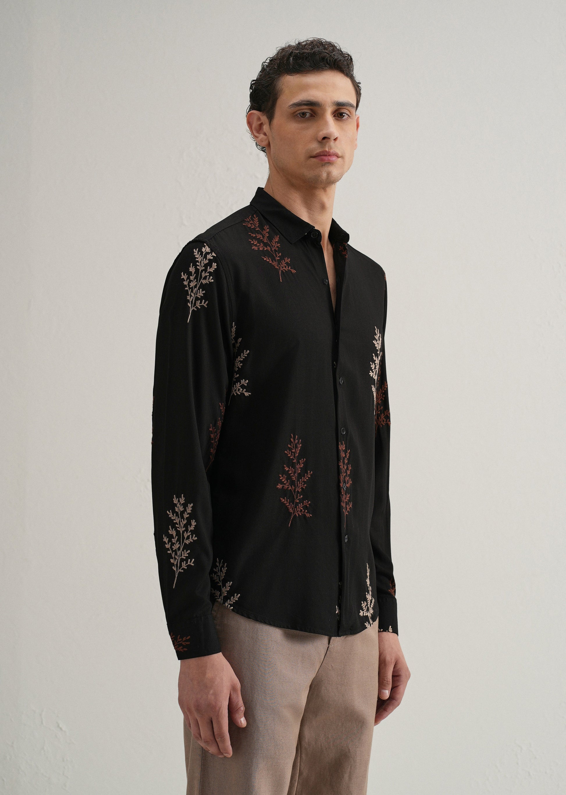This long-sleeve button-up shirt features evenly spaced all-over embroidery and a classic pointed collar for a refined look. Crafted from a lightweight blend of 55% Tencel and 45% viscose, it offers a relaxed drape and breathable comfort. The curved hemline adds a casual touch, making it versatile for both laid-back and smart-casual outfits.
