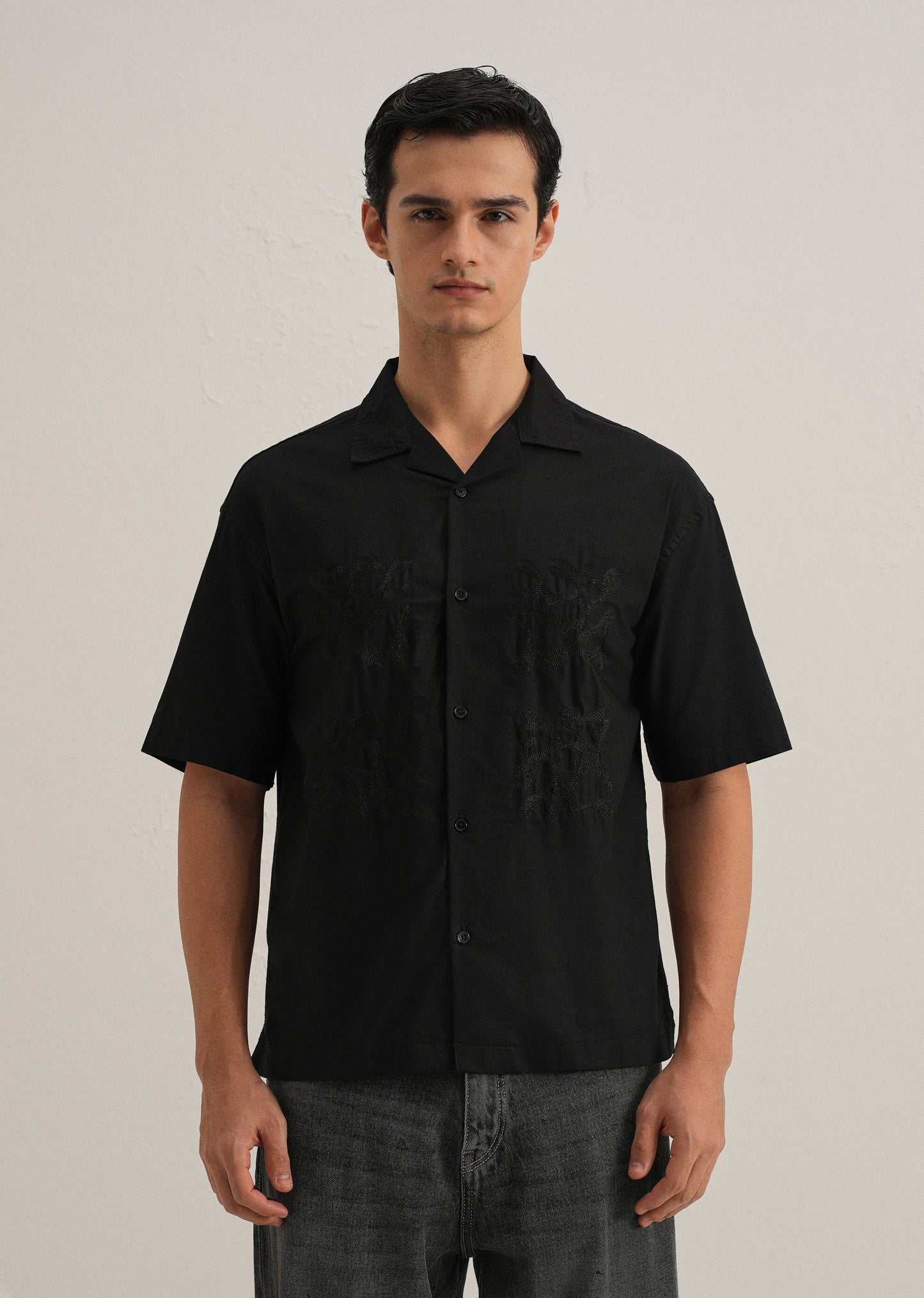 Elevated design with intricate detailing. This shirt features shine embroidery details on the front, adding a refined touch to a classic silhouette. The cuban collar and button-up front complete the look, while the boxy fit ensures a sharp and tailored appearance.
