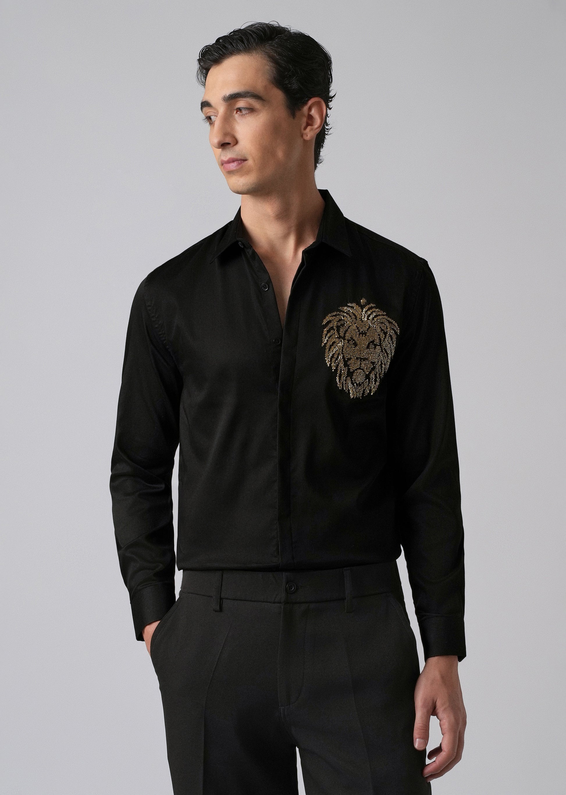 Black Handcrafted Lion Embroidery Designer Shirt