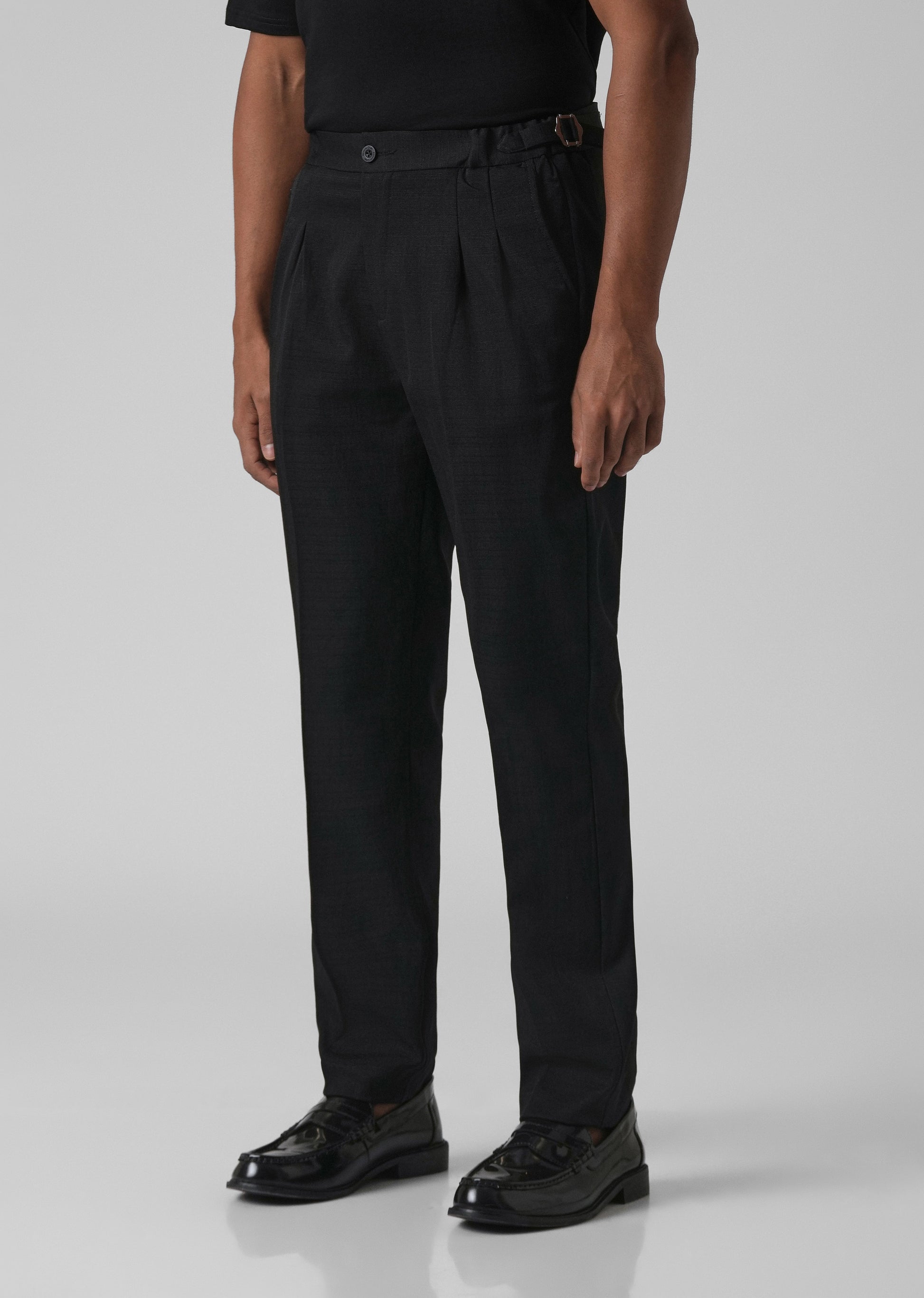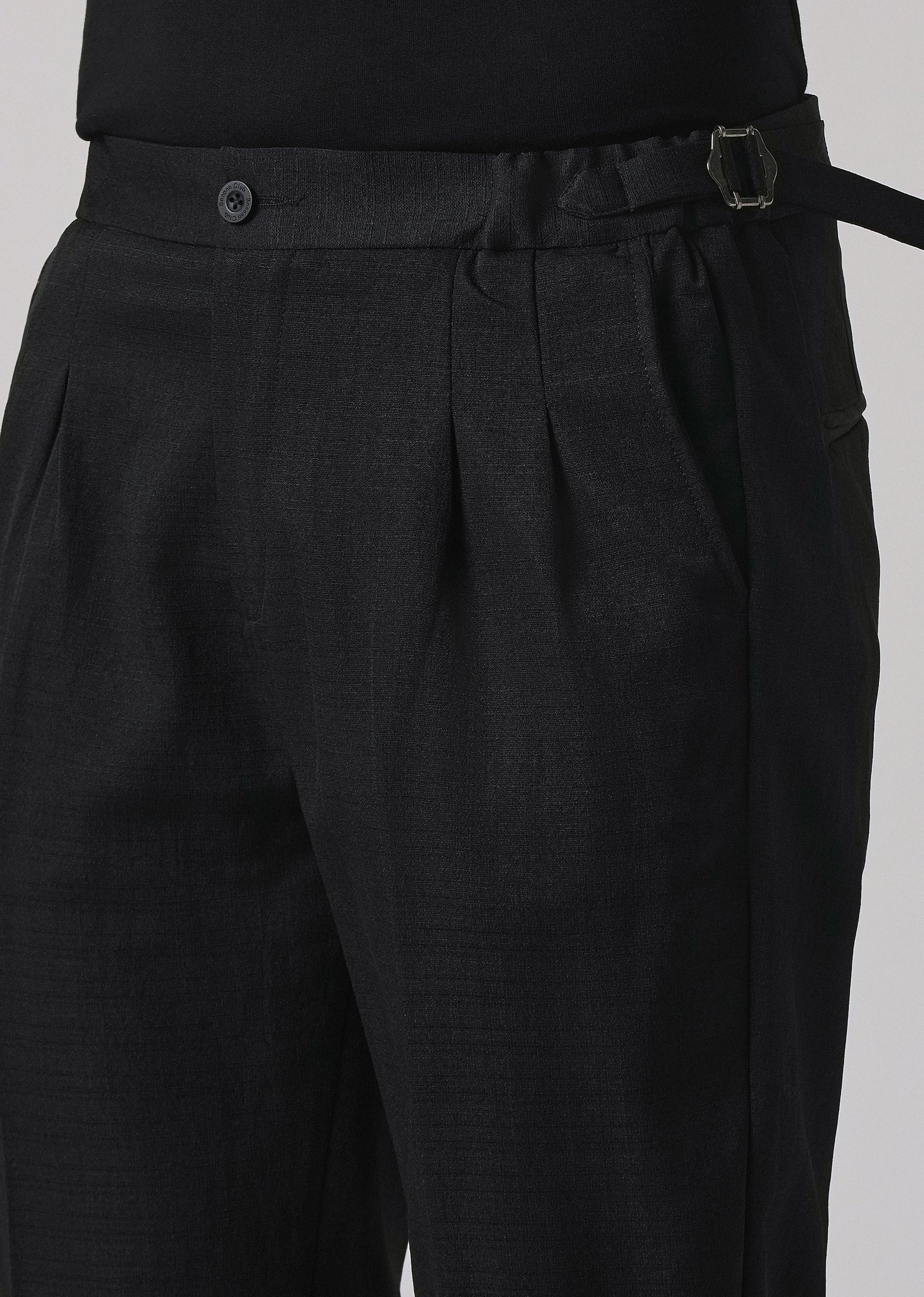 Upgrade your style with this gurkha trouser. Designed with a mid-rise waist and side buckle adjustable, it offers a perfect fit and a sharp look. The double pleats in the front give it a tailored, elegant touch, while the narrow legs keep the silhouette modern and clean. Made from lightweight fabric, it’s comfortable for all-day wear whether you’re heading to work, an event, or a weekend outing.