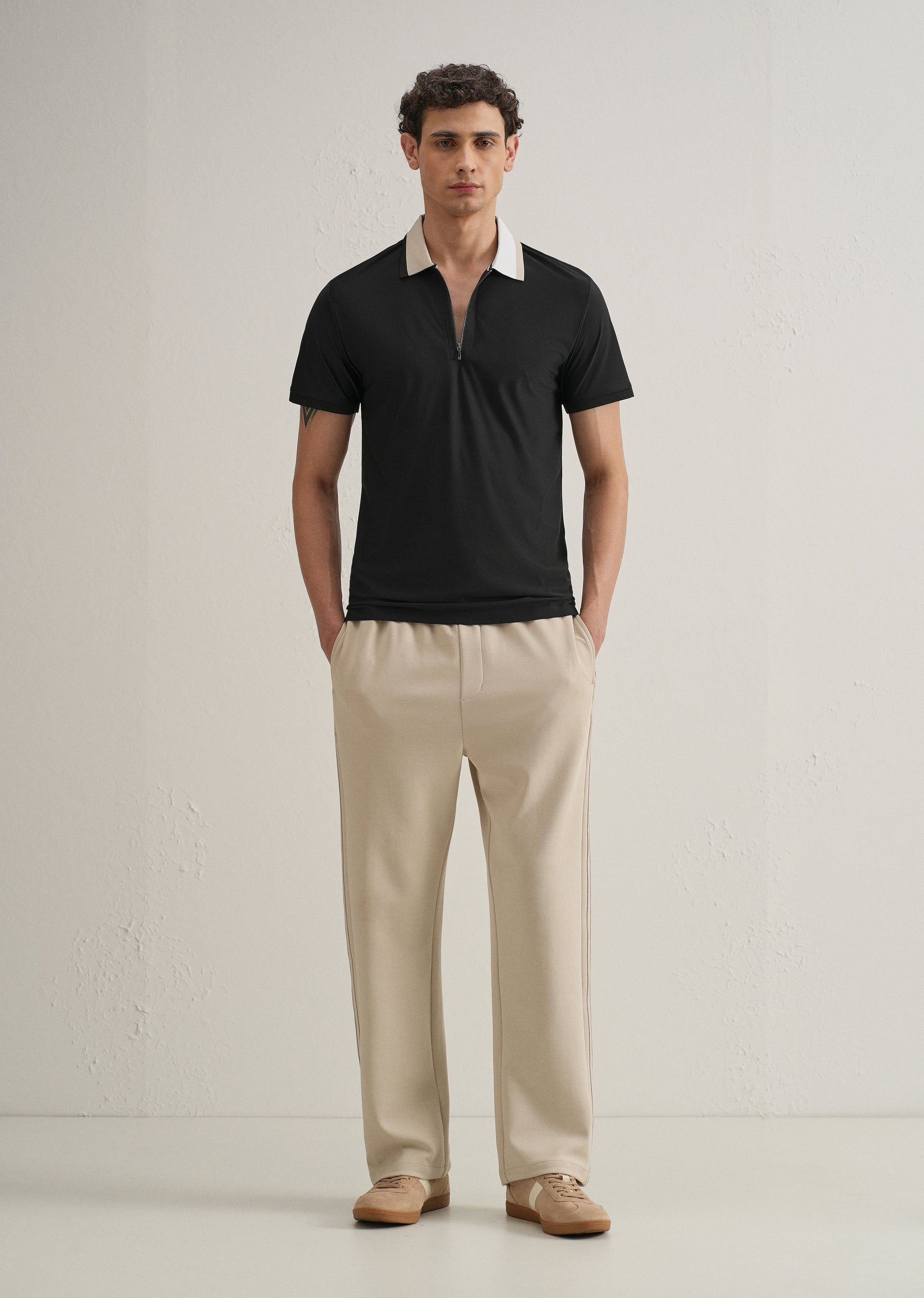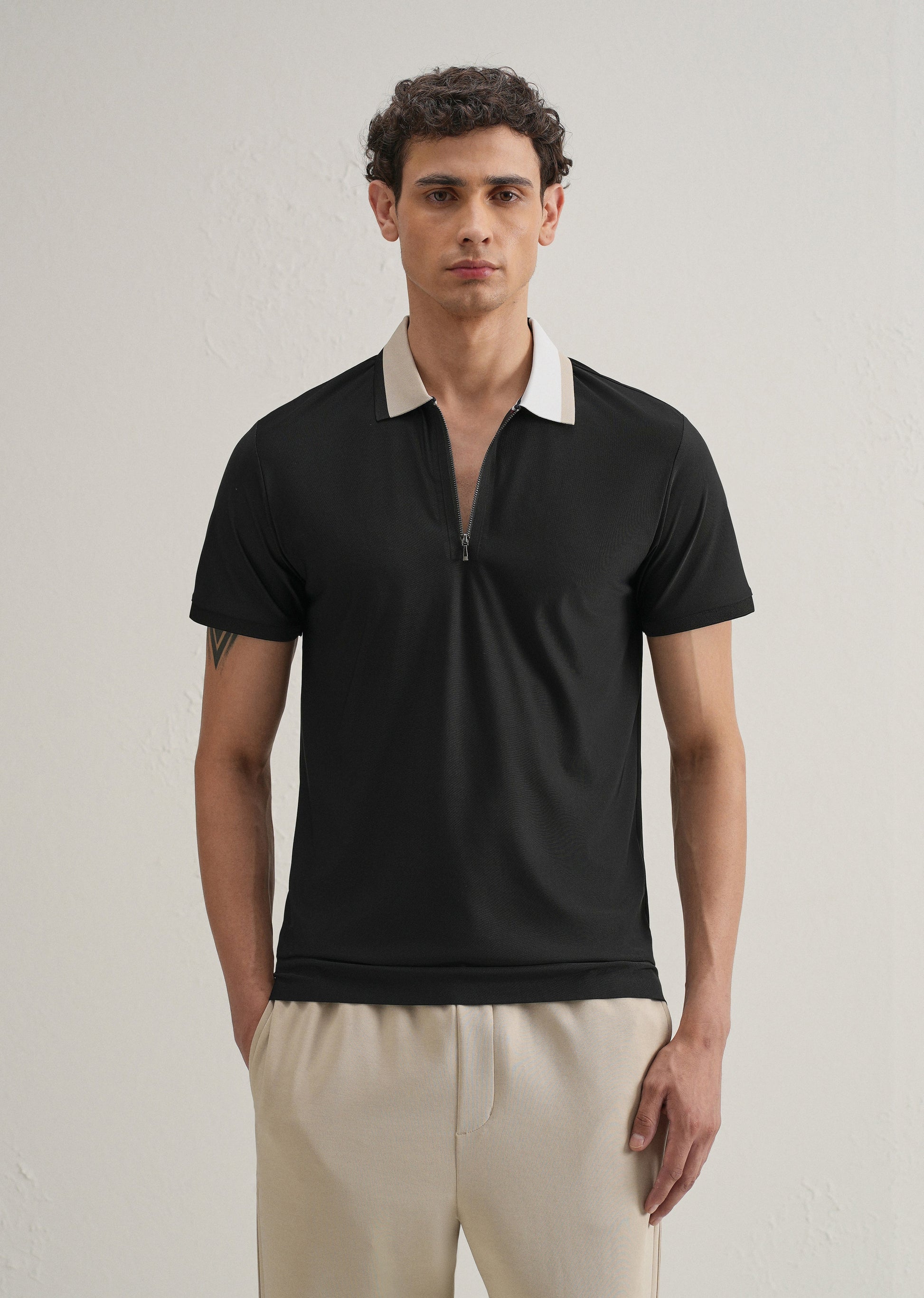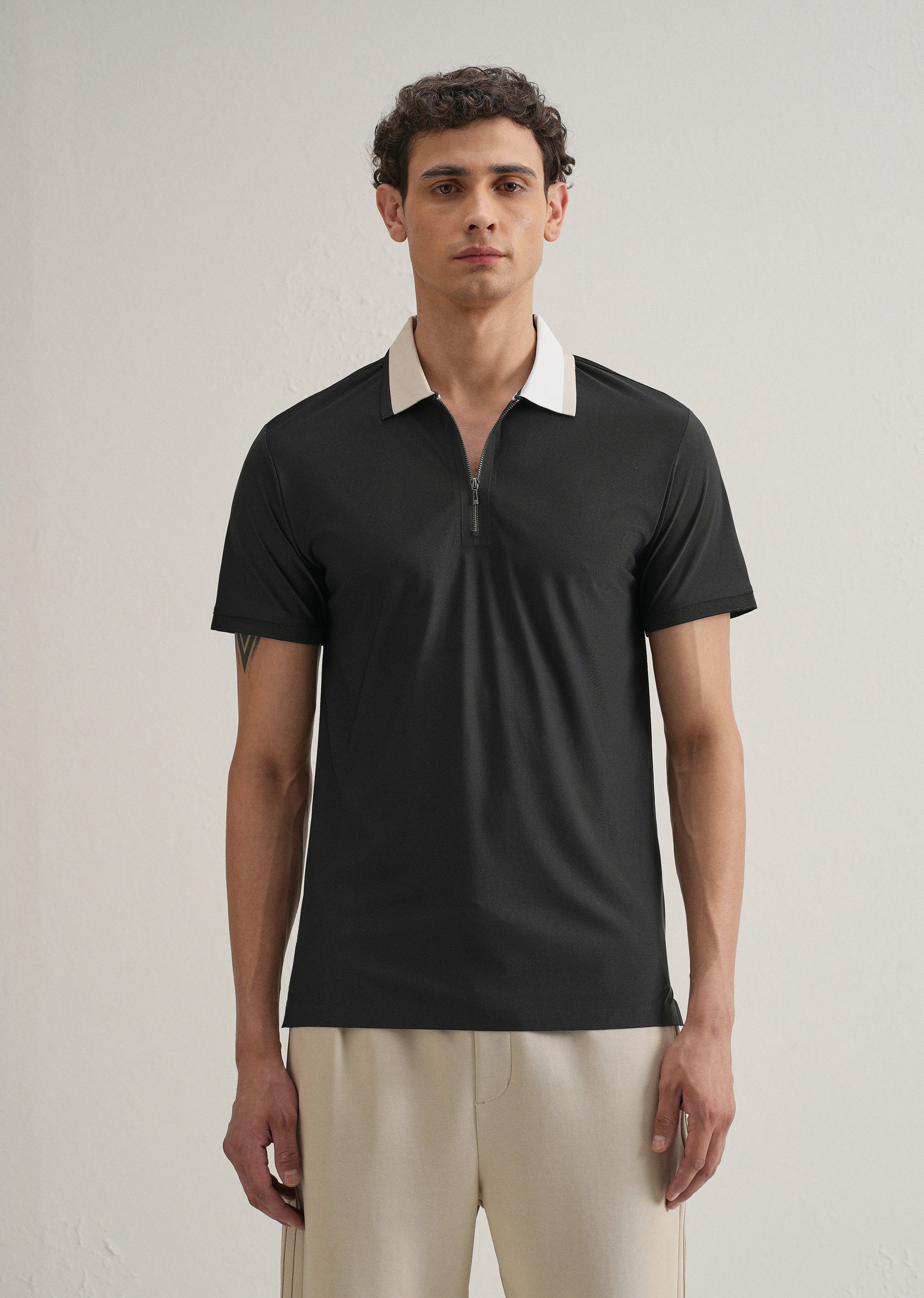 This T-shirt features a classic seamless polo collar, complemented by a quarter-zip placket for a modern look and effortless wear. Designed in a regular fit, while ribbed cuffs provide a clean, structured finish. Crafted from fine fabric, it offers a smooth, lightweight feel that’s perfect for refined yet comfortable dressing. The modern zip-up design adds a contemporary edge to the classic polo, while the short sleeves and soft, breathable fabric ensure all-day comfort.