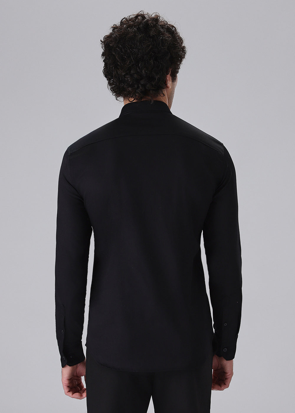 - Curved hem design with spread collar.
