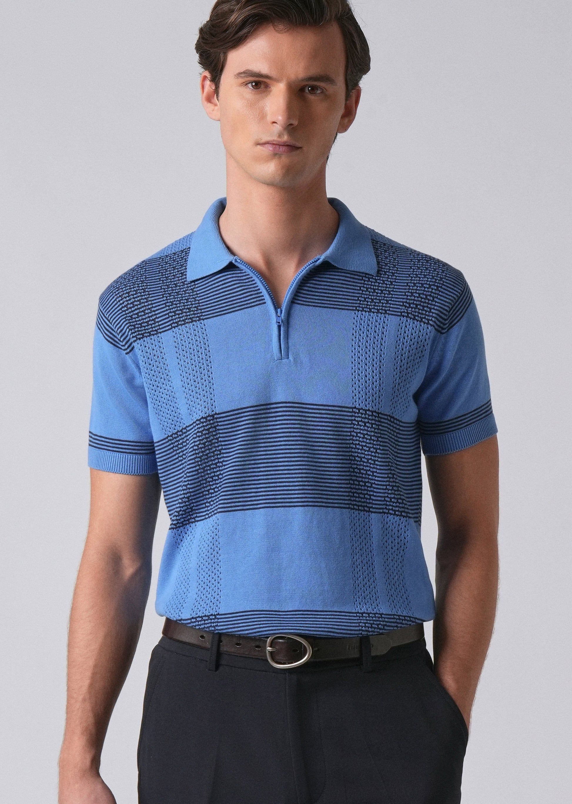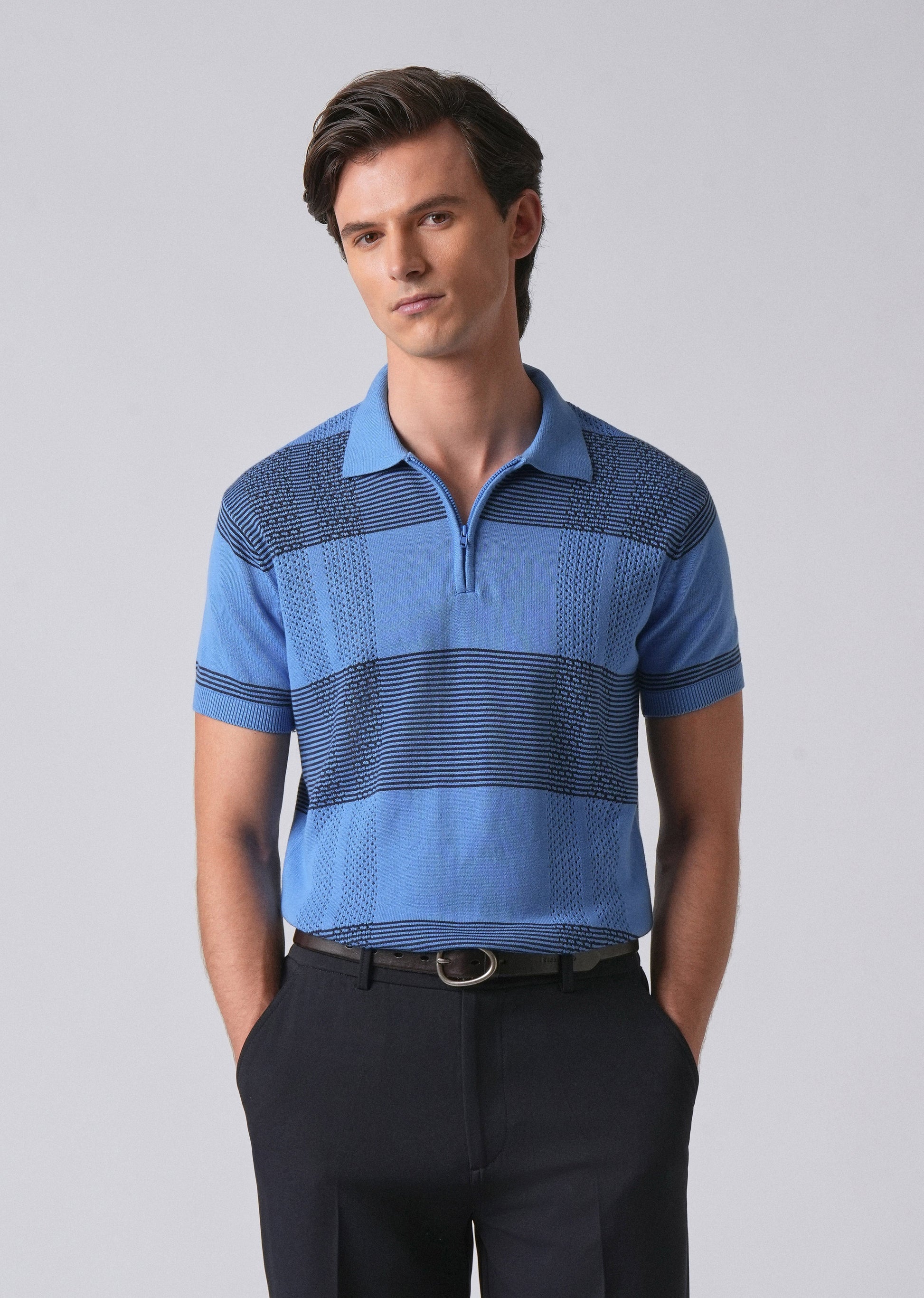 This knit top blends classic style with modern details. It features a polo collar for a timeless look and a quarter-zip placket for added ease and style. The pattern mixes horizontal stripes with open-knit vertical panels, giving it a unique texture. Ribbed sleeves and hem offer a neat finish, while the slim fit gives a clean, tailored shape. Made from soft knit fabric, it’s comfortable, breathable, and great for everyday wear.