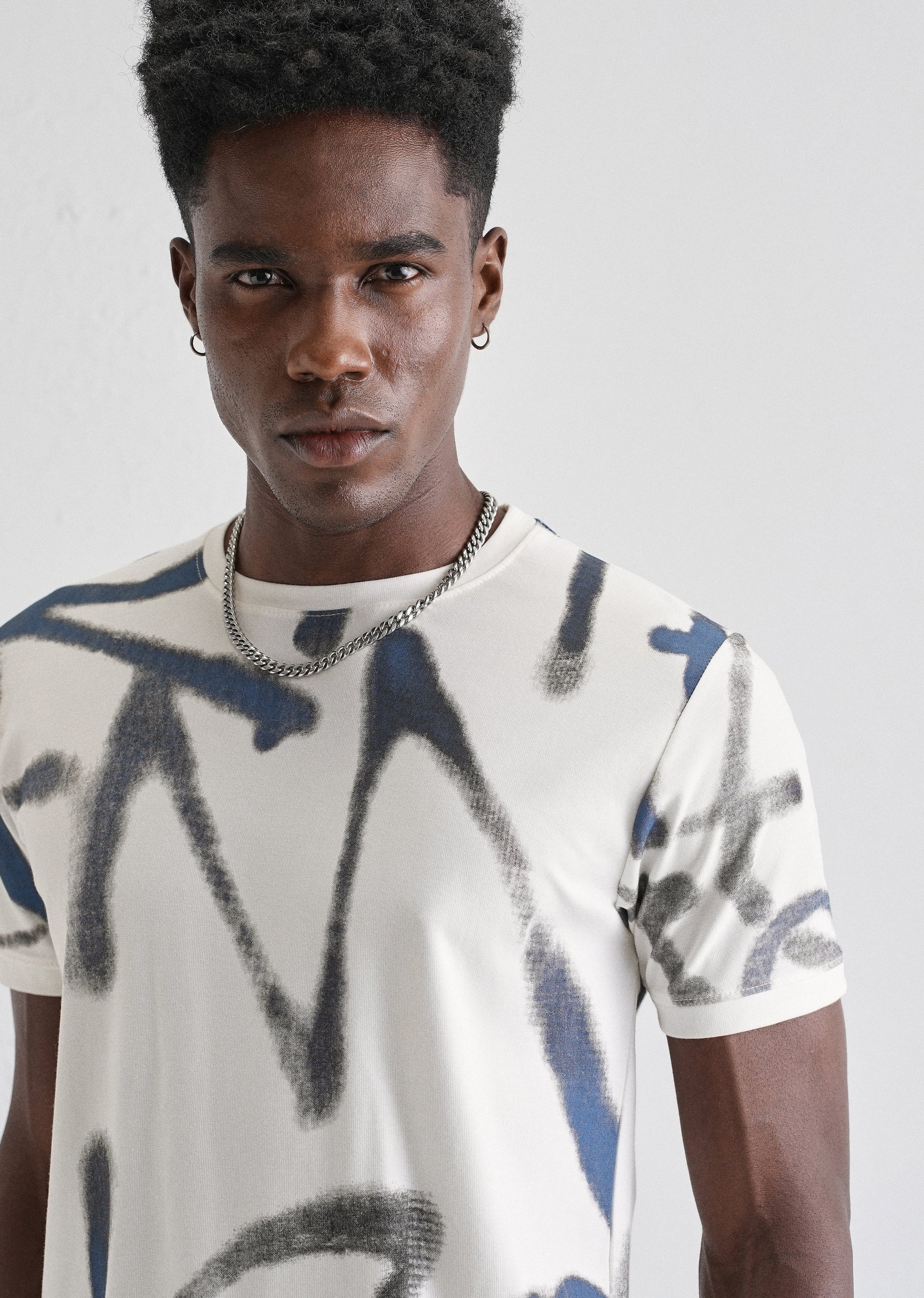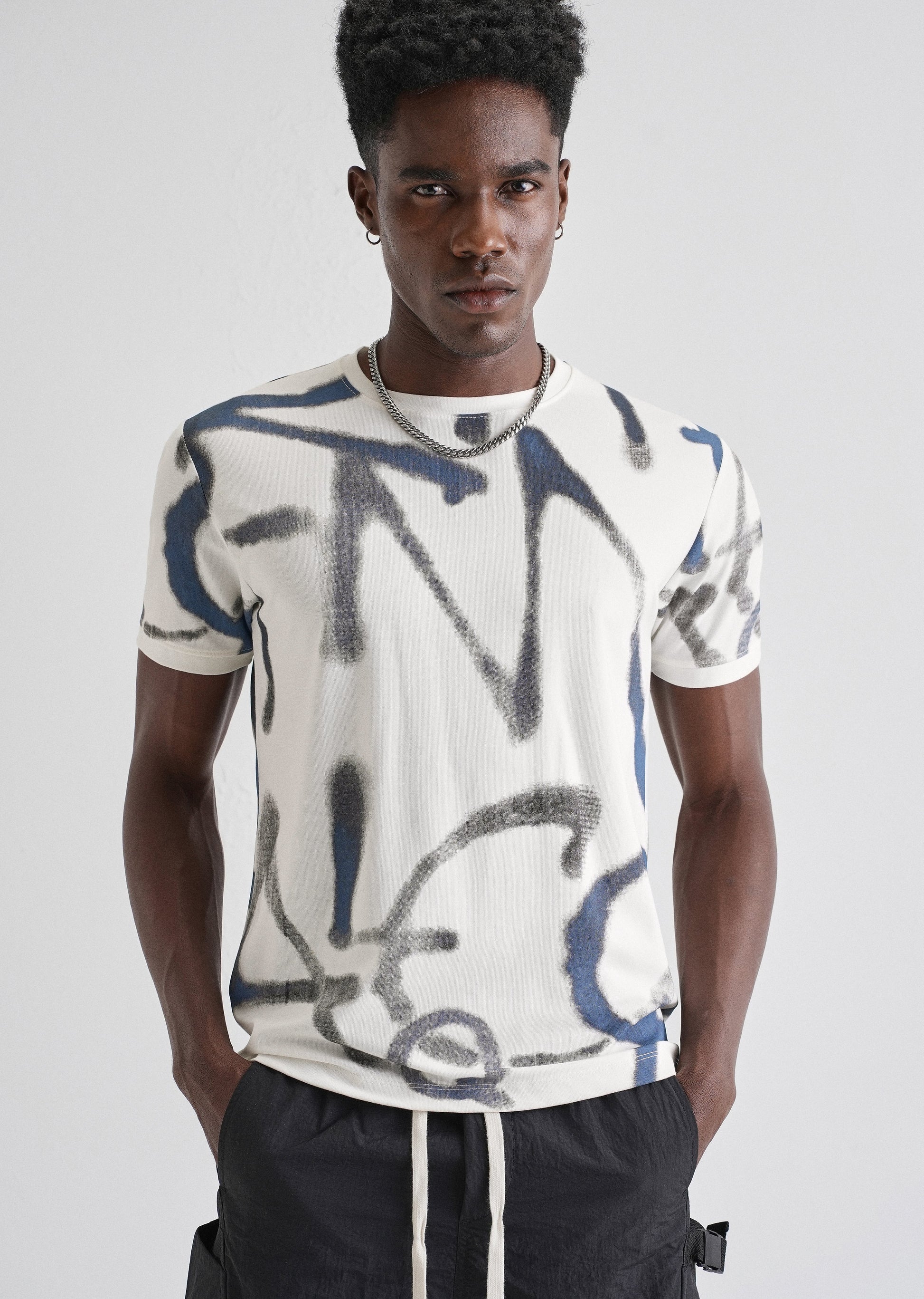 Add an artistic edge to your look with this printed t-shirt. Made from soft, breathable cotton blend with light stretch, it features bold spray-paint-style print. The slim fit and crew neck make it perfect for everyday wear, while the eye-catching design adds a cool streetwear vibe.