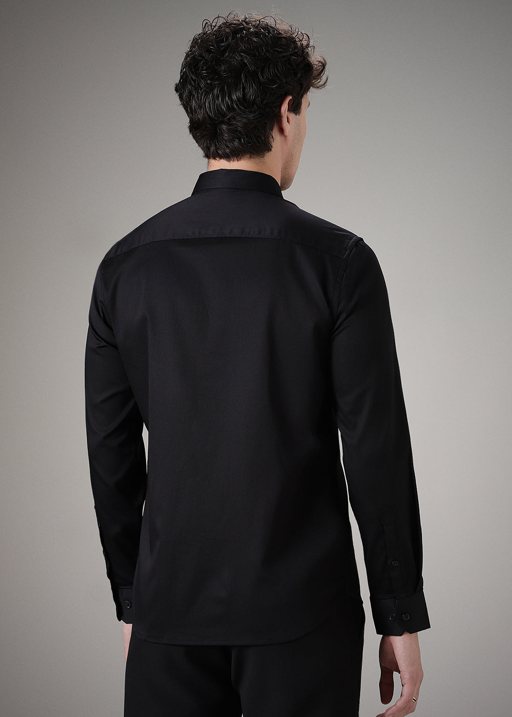 - Curved hem design with spread collar.