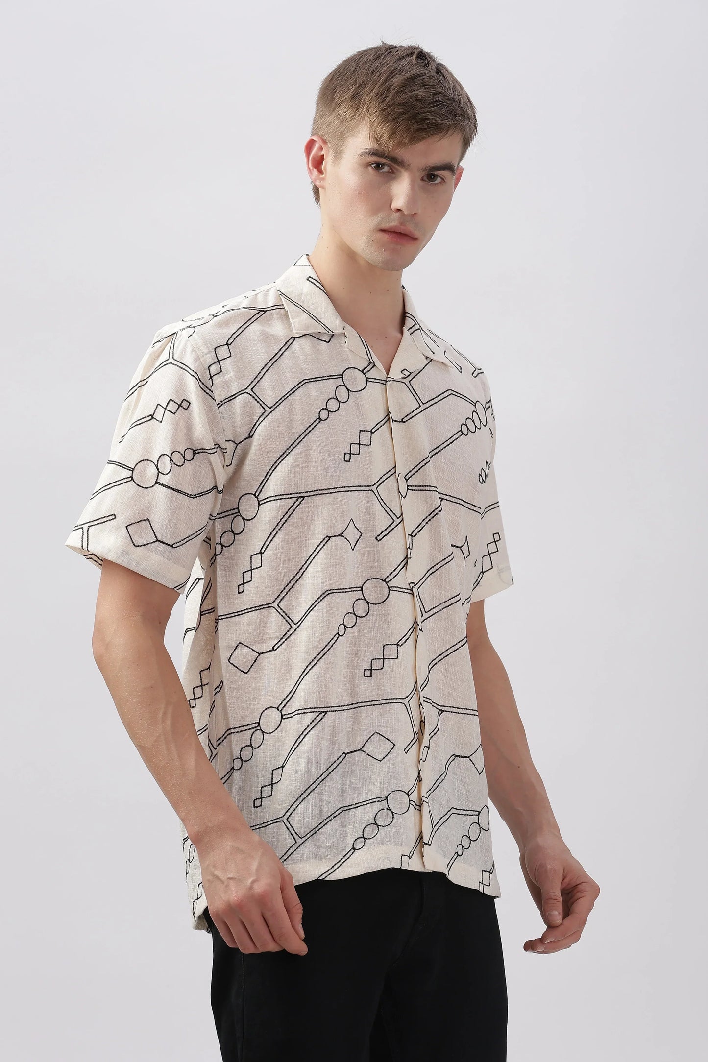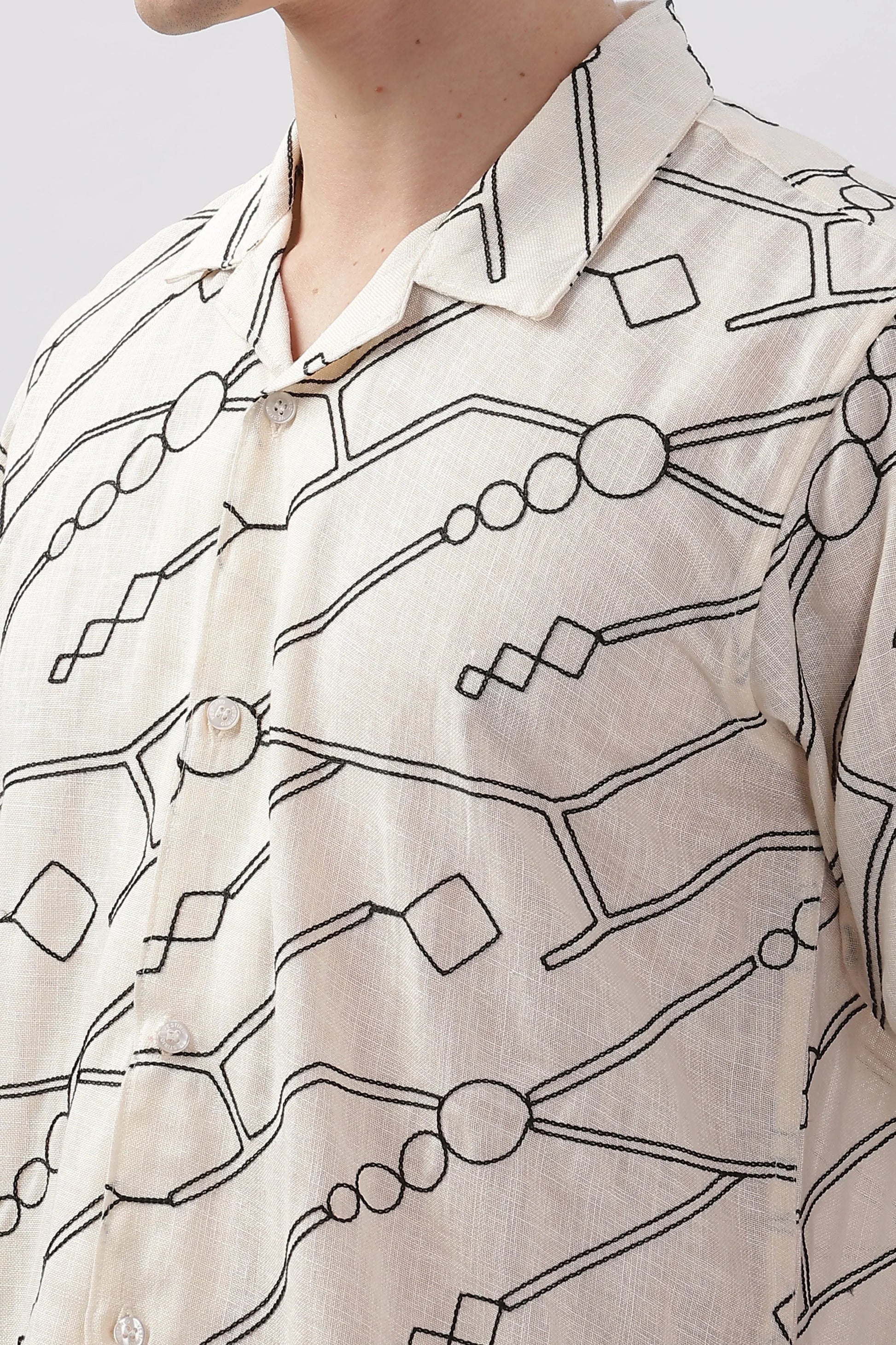 Cream abstract linen embroidered half sleeve shirt