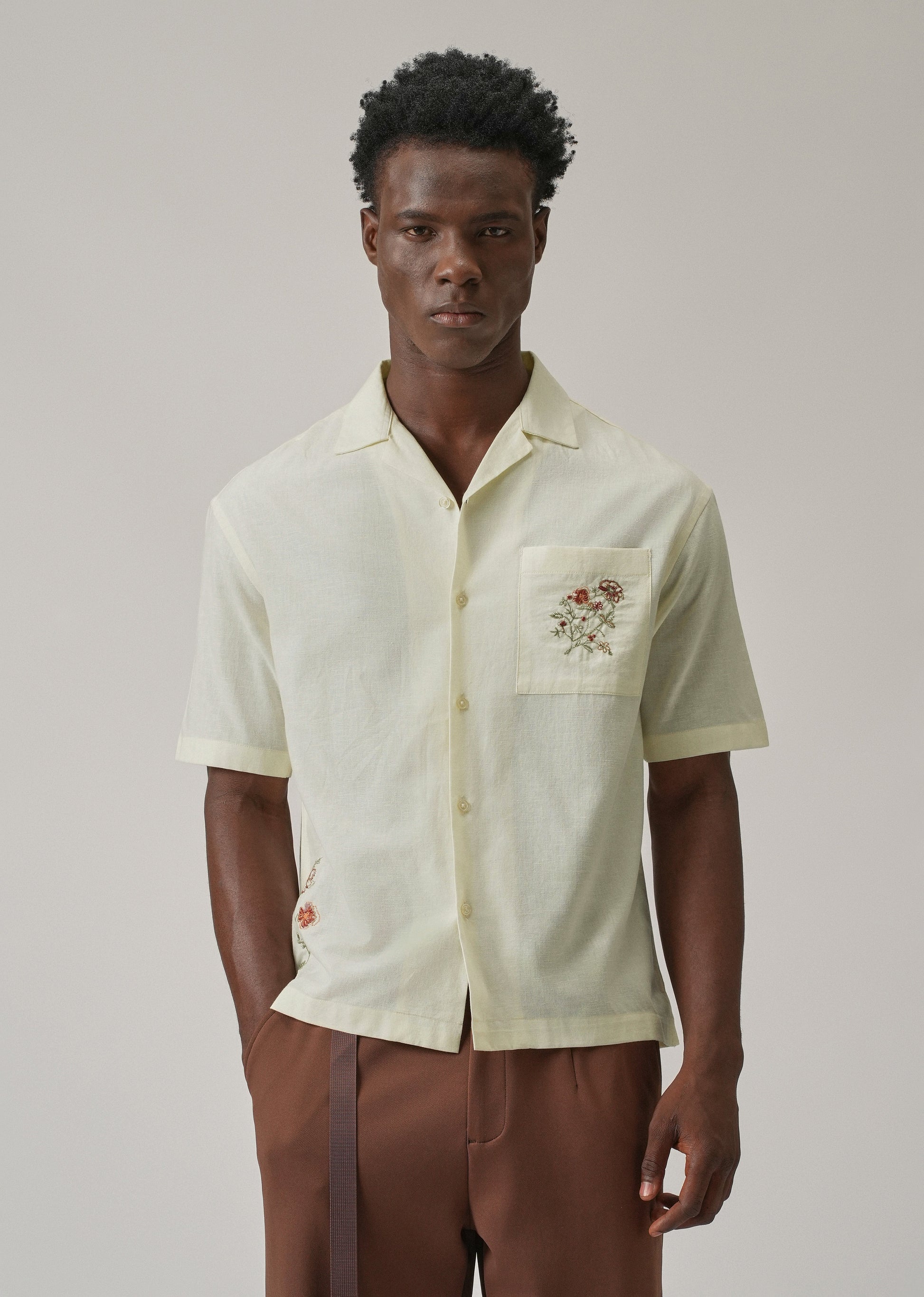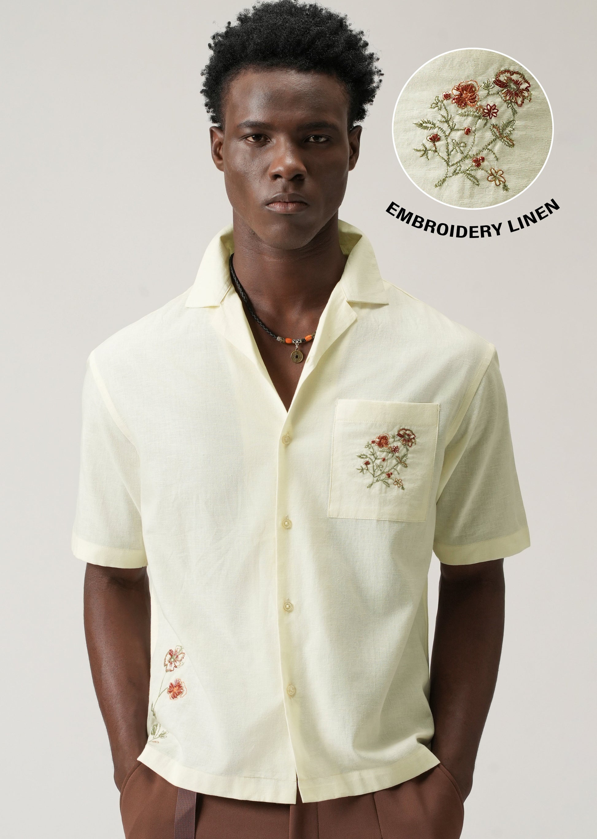Cream Floral Embroidery Linen Shirt