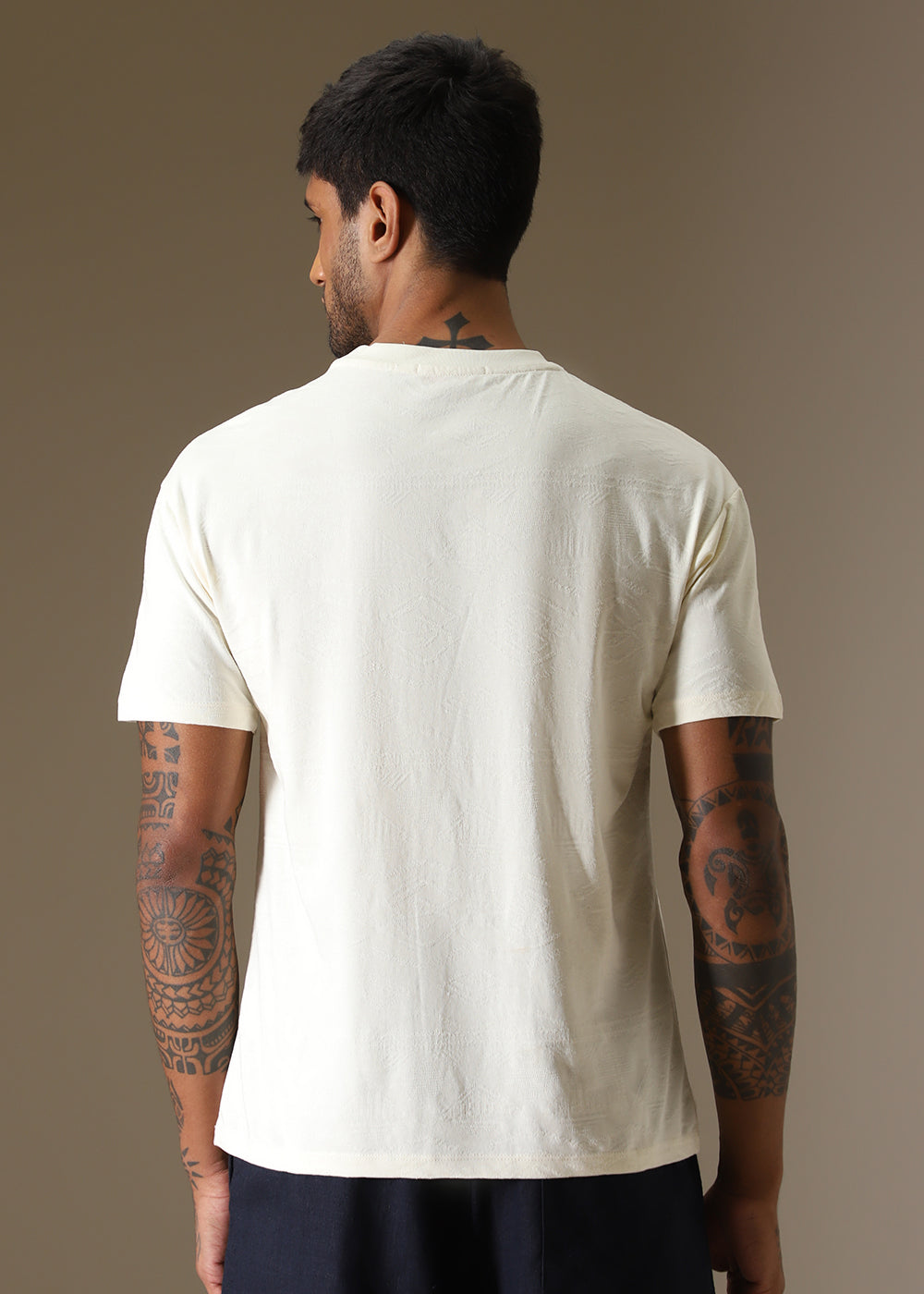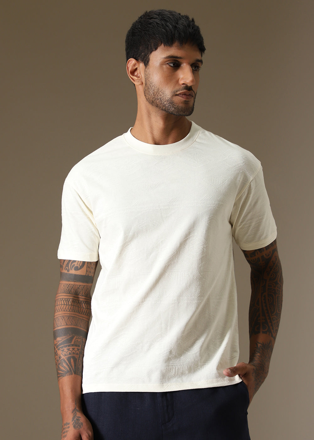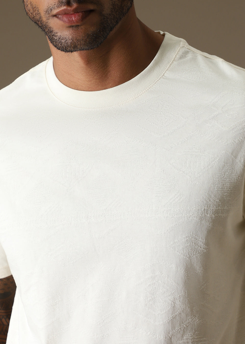 Cream Self Pattern Regular T-Shirt