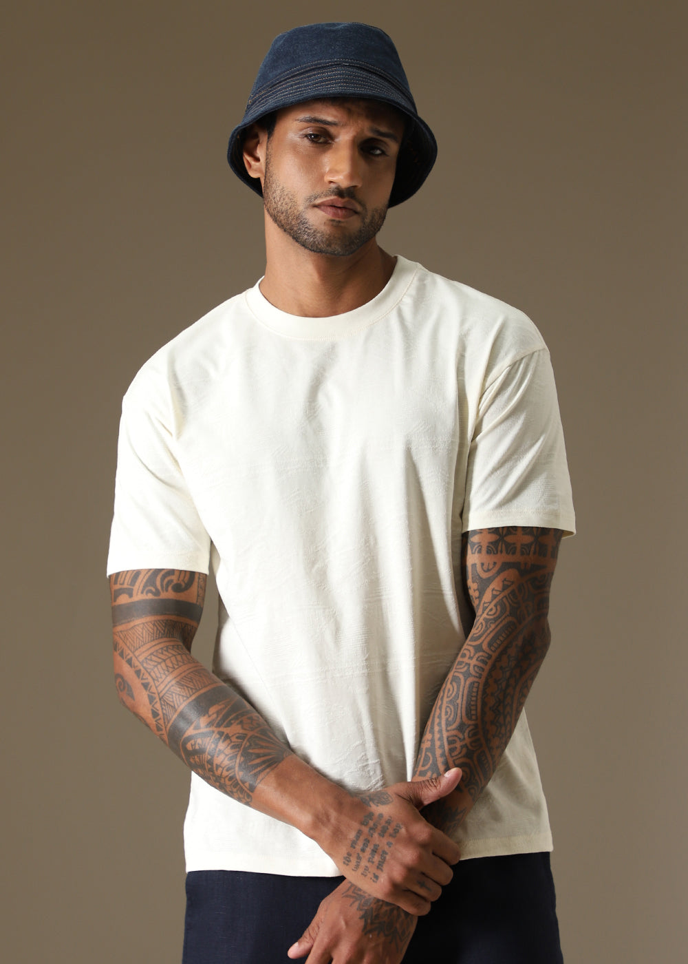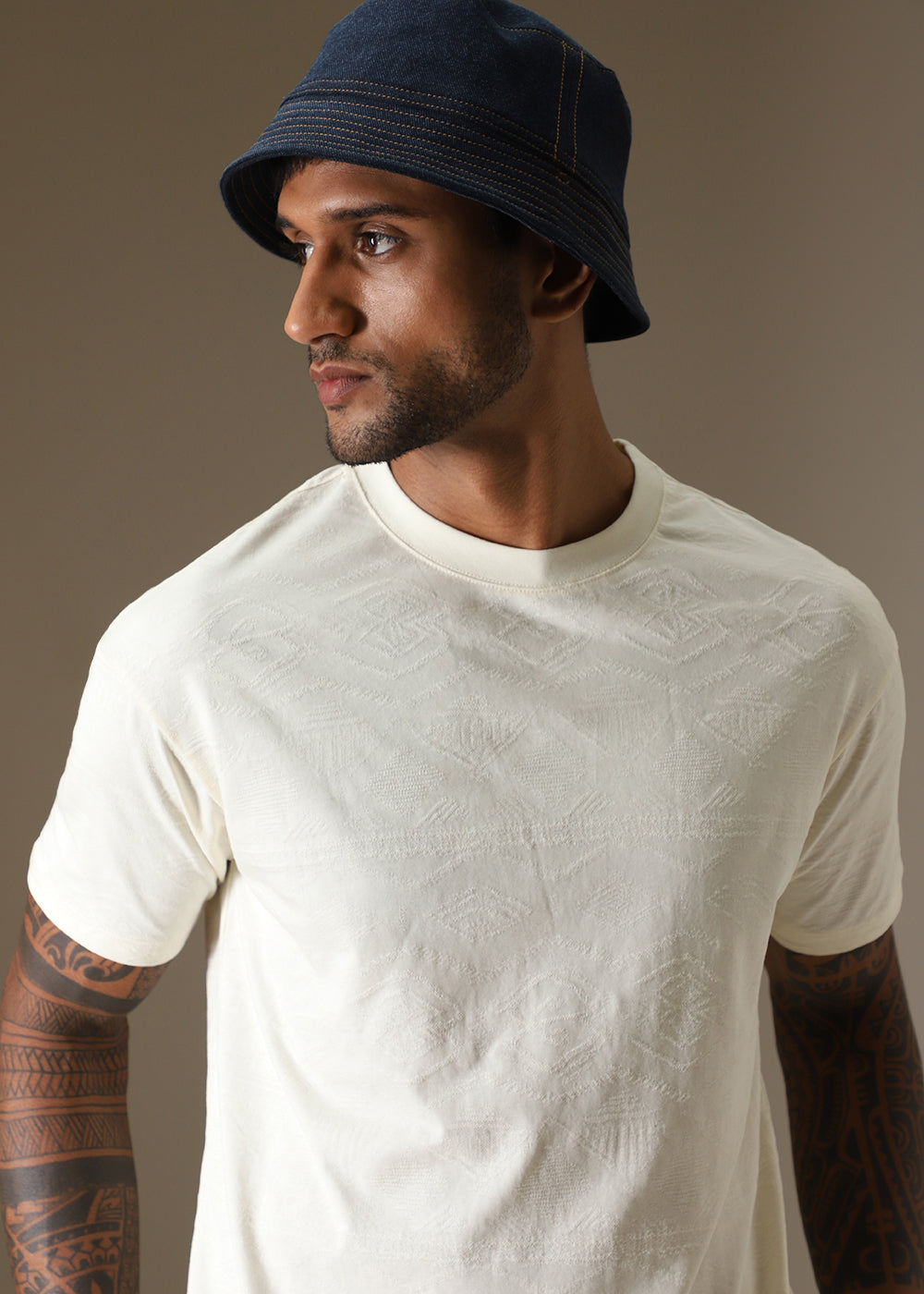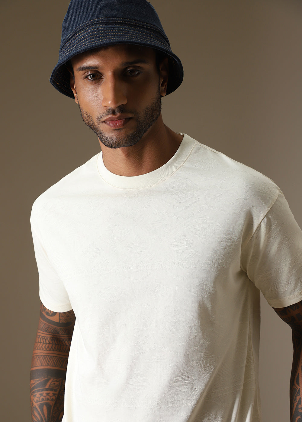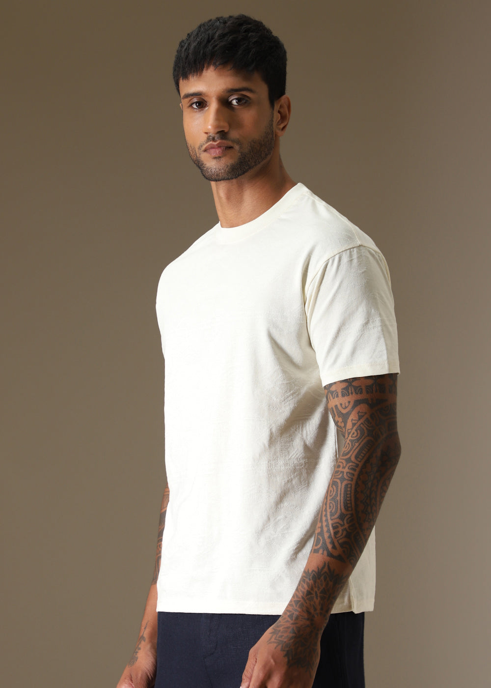 Cream Self Pattern Regular T-Shirt