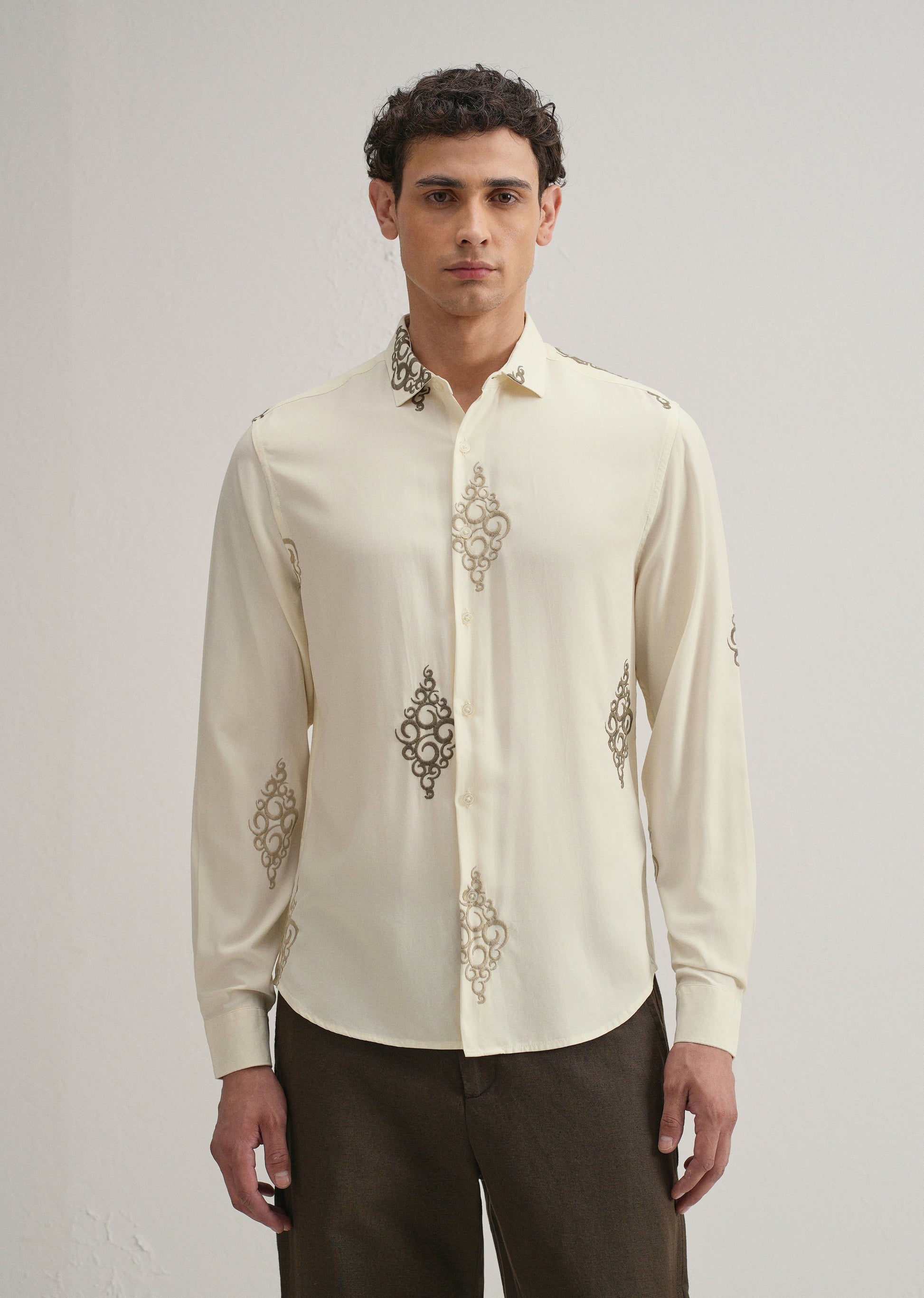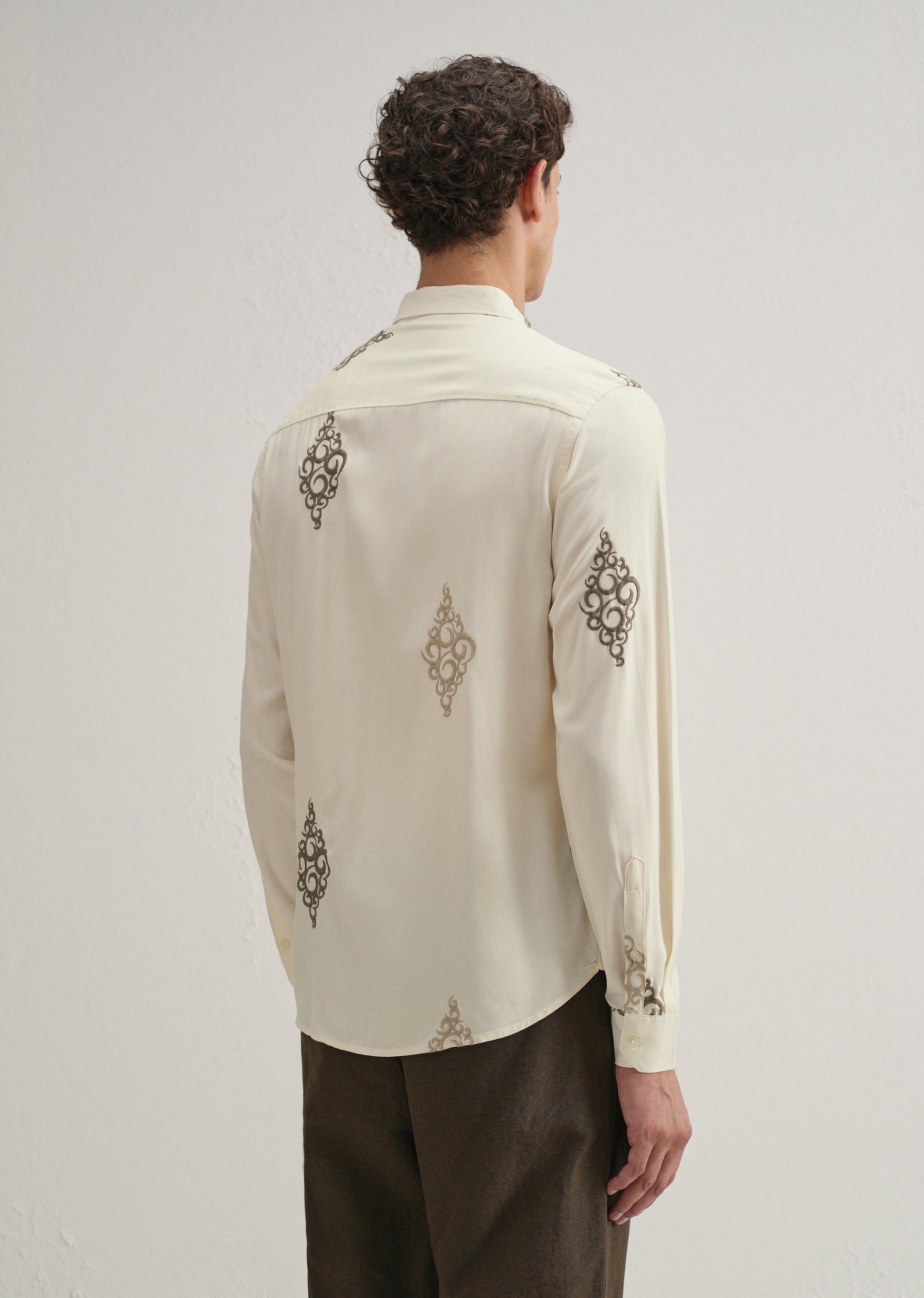This long-sleeve button-up shirt features evenly spaced all-over embroidery and a classic pointed collar for a refined look. Crafted from a lightweight blend of 55% Tencel and 45% viscose, it offers a relaxed drape and breathable comfort. The curved hemline adds a casual touch, making it versatile for both laid-back and smart-casual outfits.