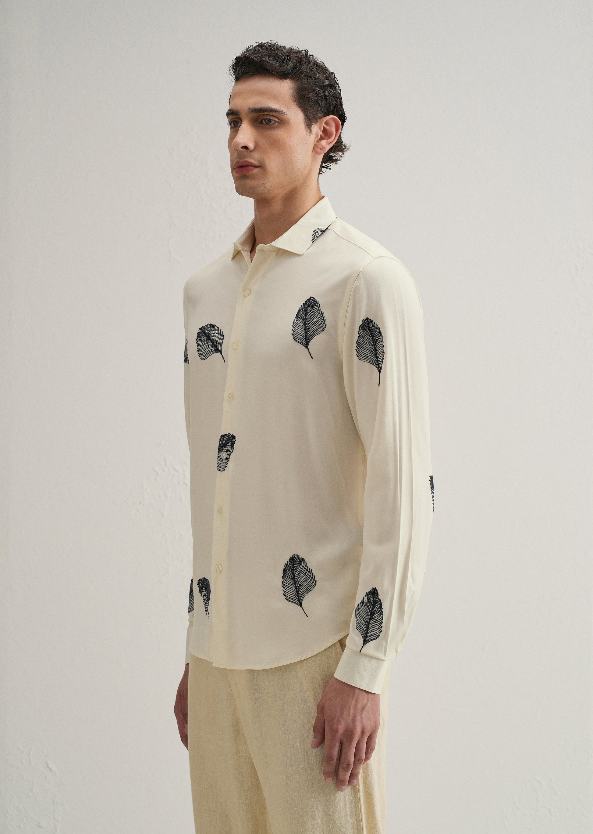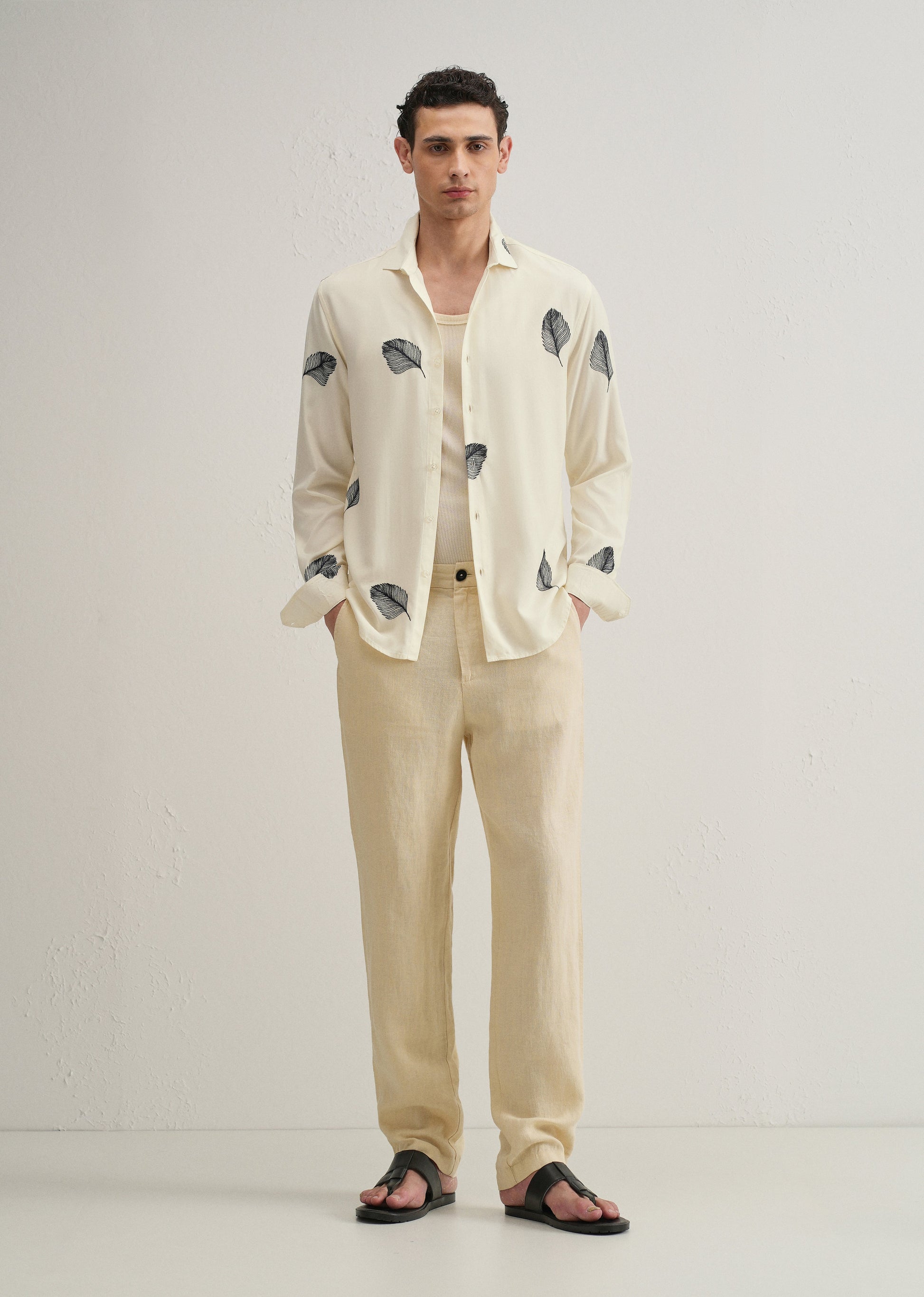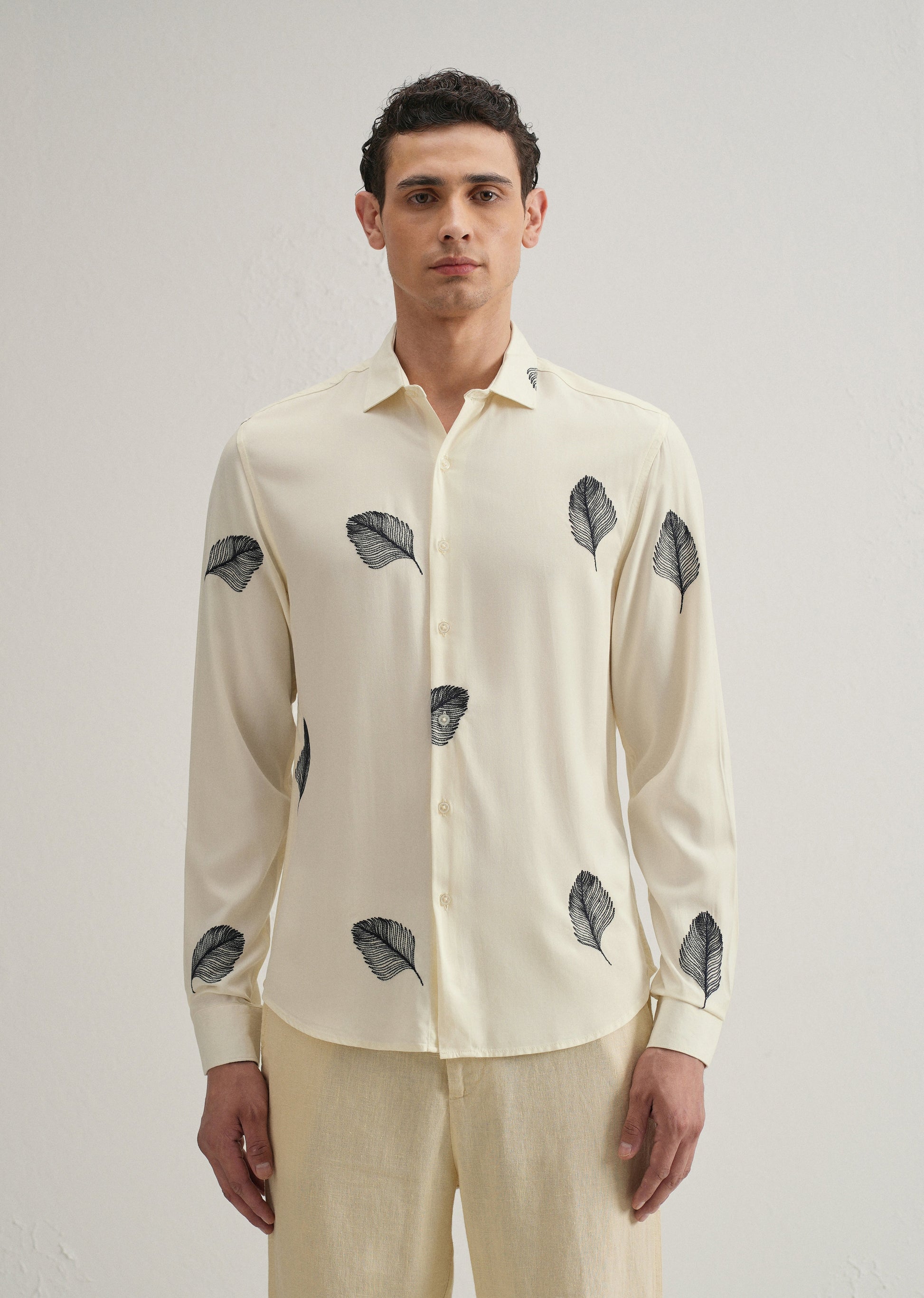 This long-sleeve button-up shirt features evenly spaced all-over embroidery and a classic pointed collar for a refined look. Crafted from a lightweight blend of 55% Tencel and 45% viscose, it offers a relaxed drape and breathable comfort. The curved hemline adds a casual touch, making it versatile for both laid-back and smart-casual outfits.
