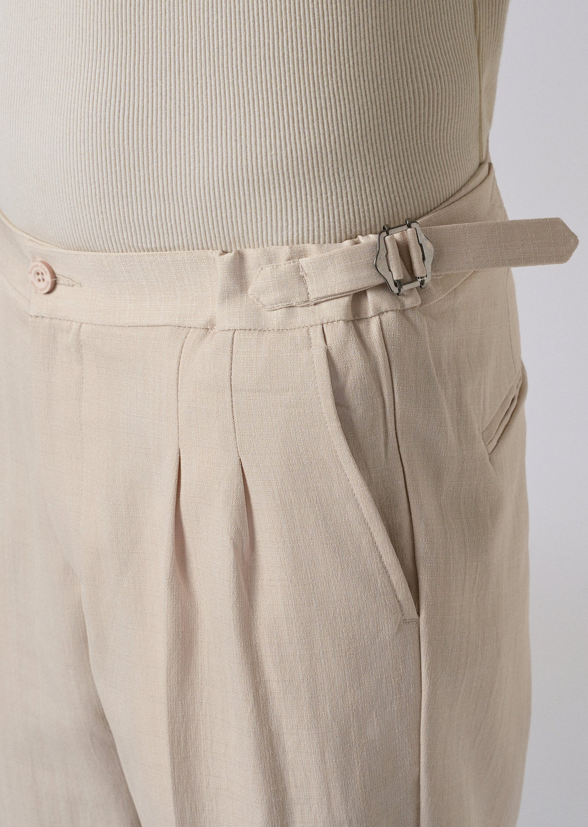 Upgrade your style with this gurkha trouser. Designed with a mid-rise waist and side buckle adjustable, it offers a perfect fit and a sharp look. The double pleats in the front give it a tailored, elegant touch, while the narrow legs keep the silhouette modern and clean. Made from lightweight fabric, it’s comfortable for all-day wear whether you’re heading to work, an event, or a weekend outing.