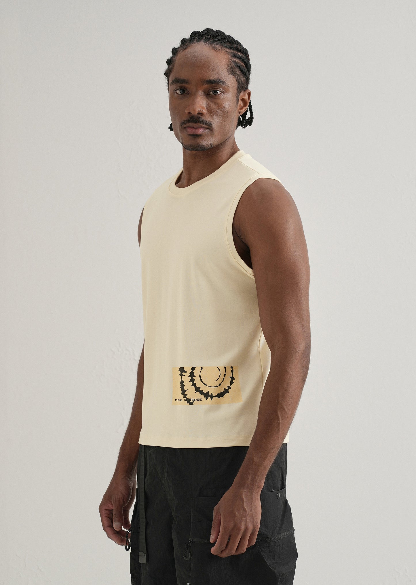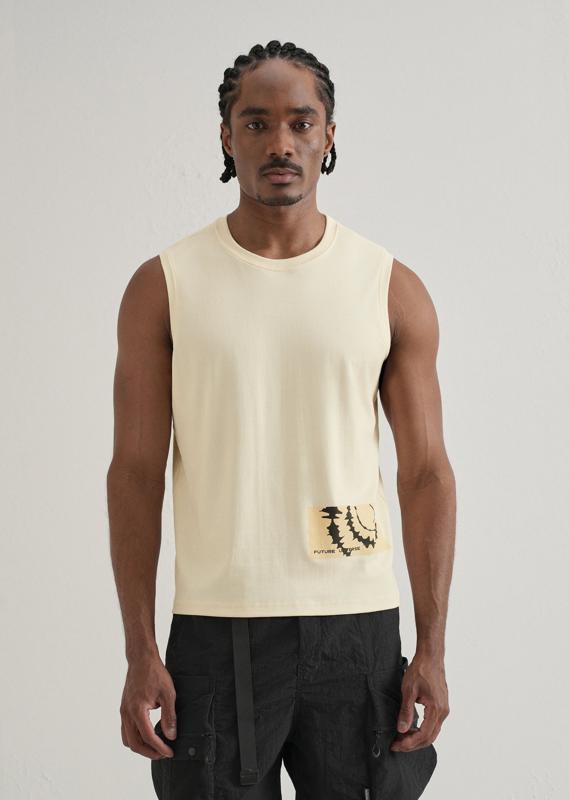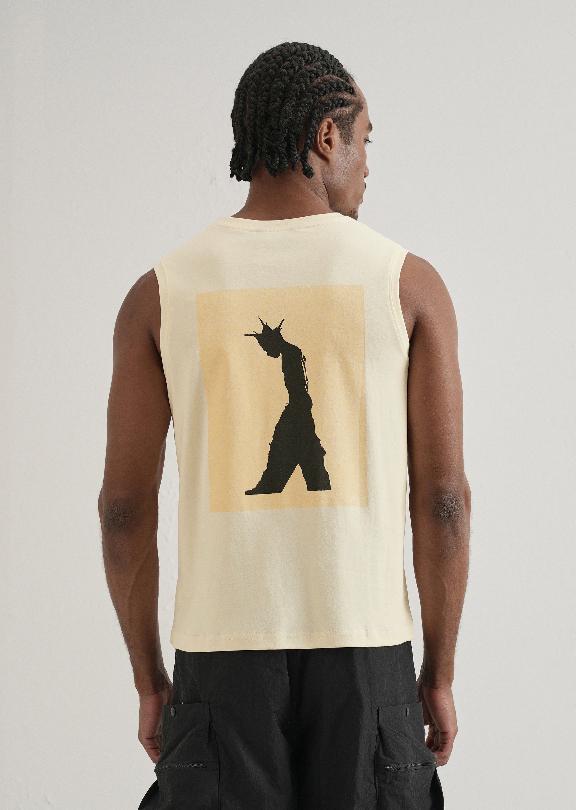 This sleeveless t-shirt crafted from soft and breathable fabric. Designed with a regular fit, it ensures all-day comfort and ease of movement. The front features a minimal printed patch detail near the hem, while the back is highlighted with a bold graphic print, adding an edgy, street-style vibe.