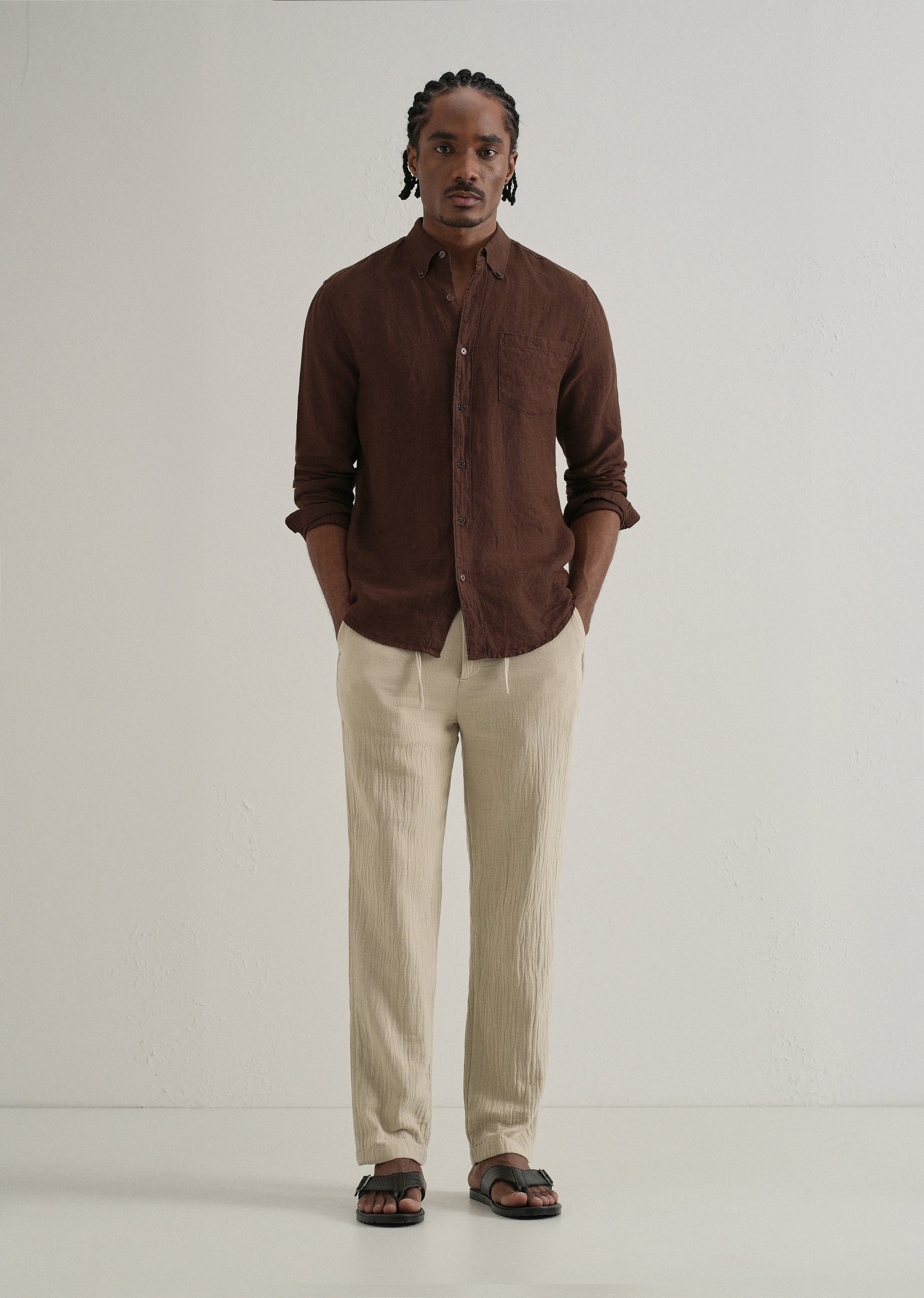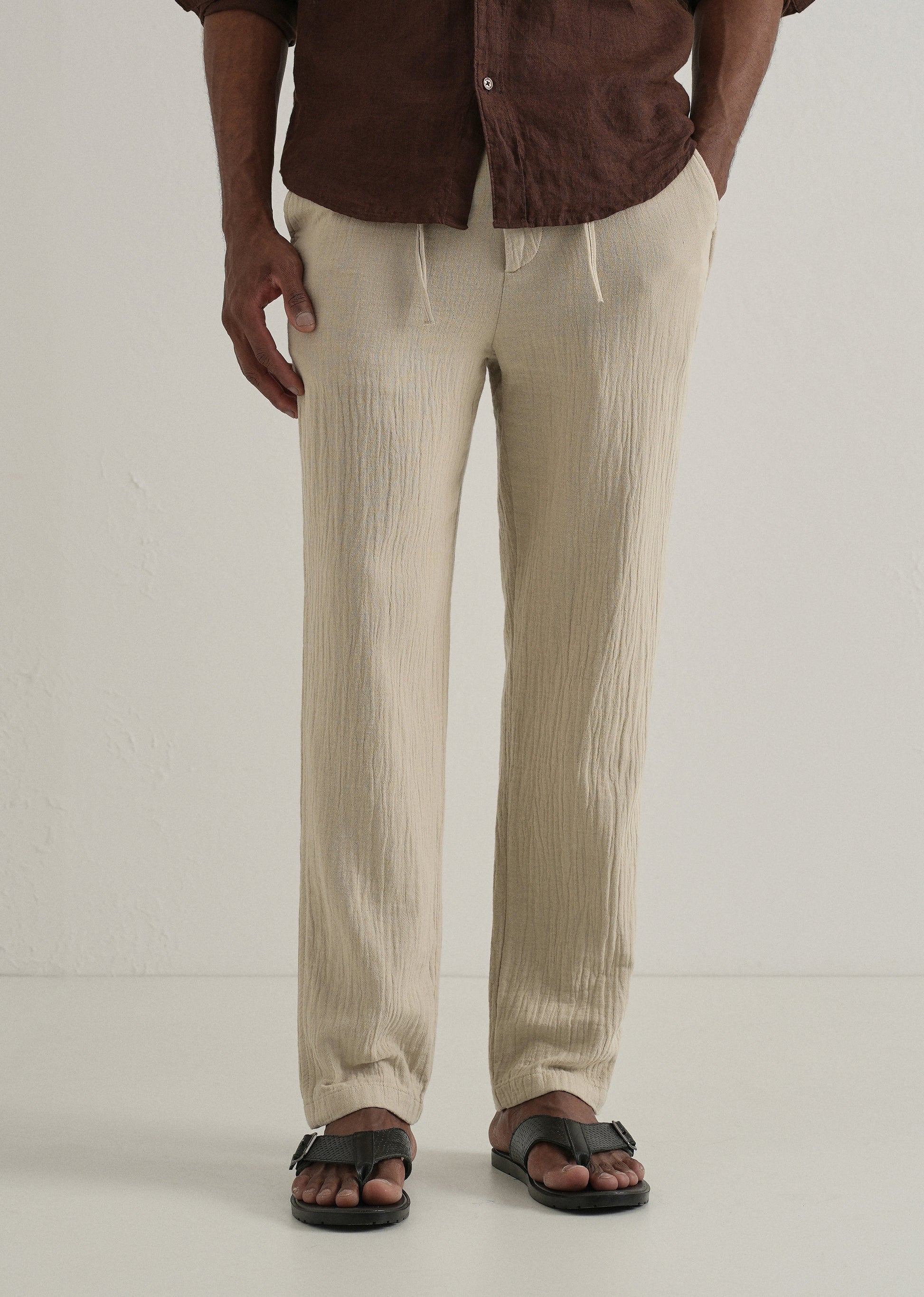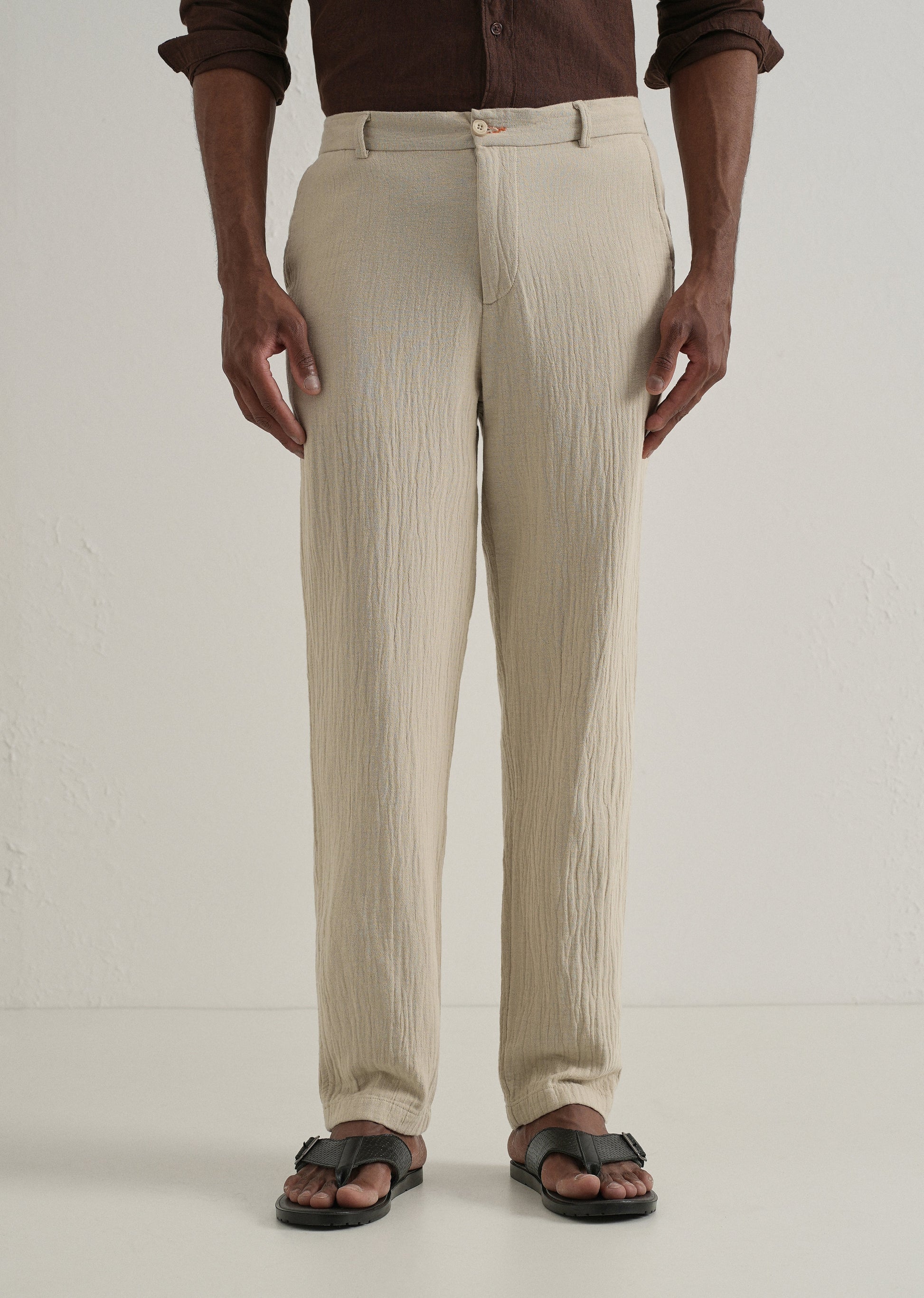 Step into comfort and style with these textured trousers, designed for a perfect balance of comfort and sophistication. Made from lightweight, breathable fabric with a crinkled effect, these trousers feature a mid-rise waist, button-and-zip closure, and belt loops for versatile styling. The straight relaxed fit ensures all-day comfort, while the welt pockets at the back add a clean, tailored finish. These trousers effortlessly blend style and functionality.