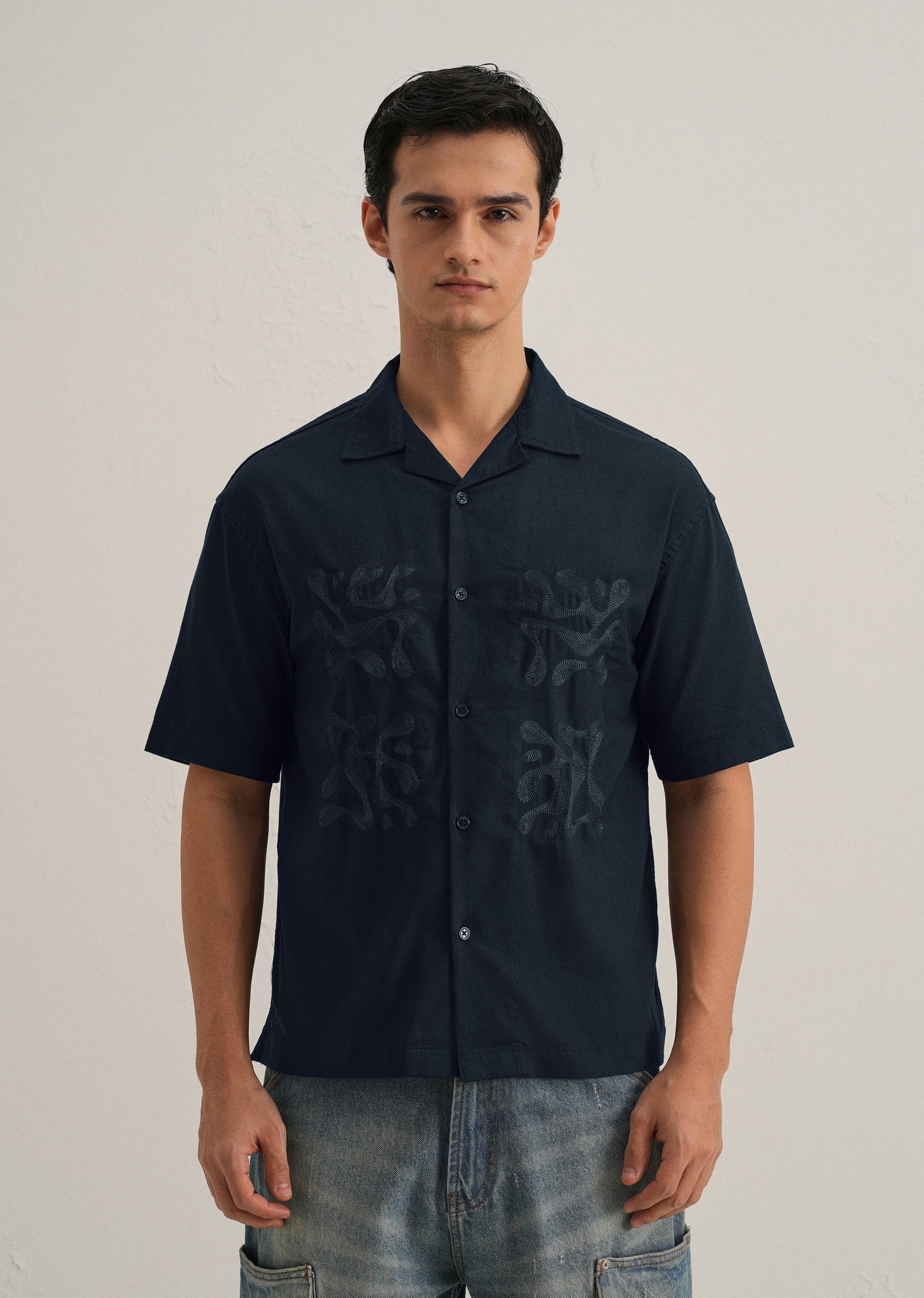 Elevated design with intricate detailing. This shirt features shine embroidery details on the front, adding a refined touch to a classic silhouette. The cuban collar and button-up front complete the look, while the boxy fit ensures a sharp and tailored appearance.
