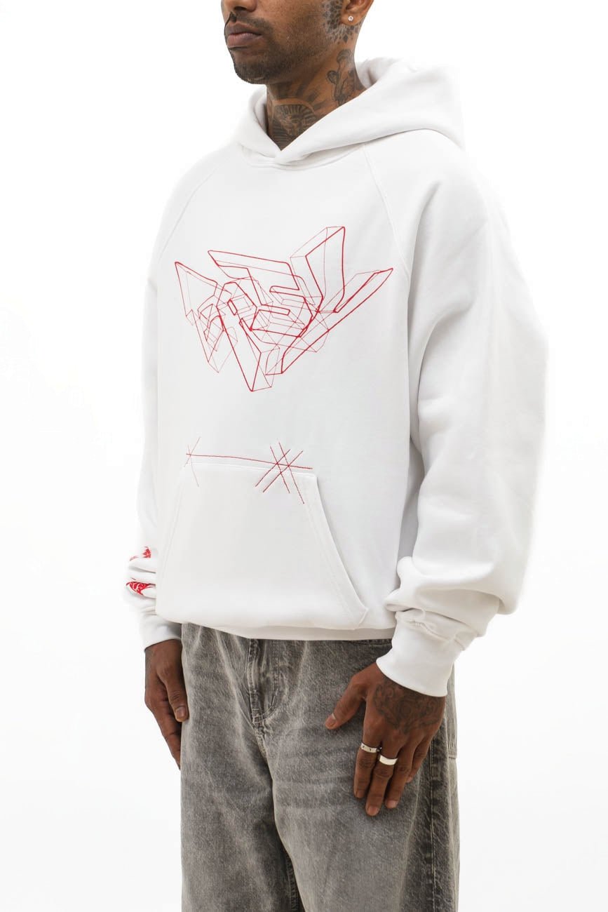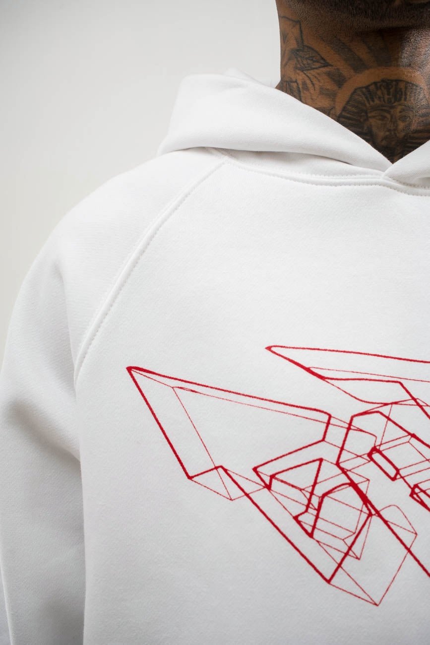 Remind yourself. Keep that same energy. Everything you’ve overcome to be here. This white hoodie crafted from a weighty cotton blend, boasts a relaxed drop-shoulder silhouette accented with images and text regarding Love > Fear, lending an otherworldly appeal.