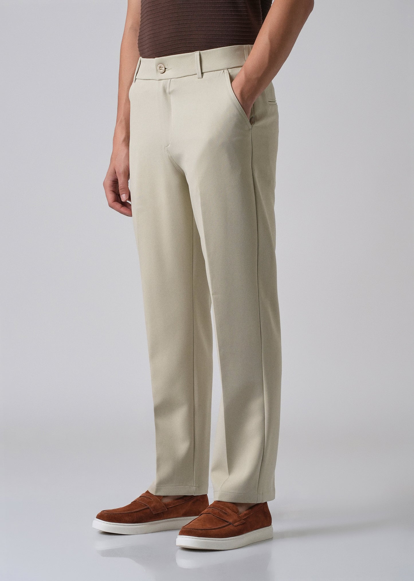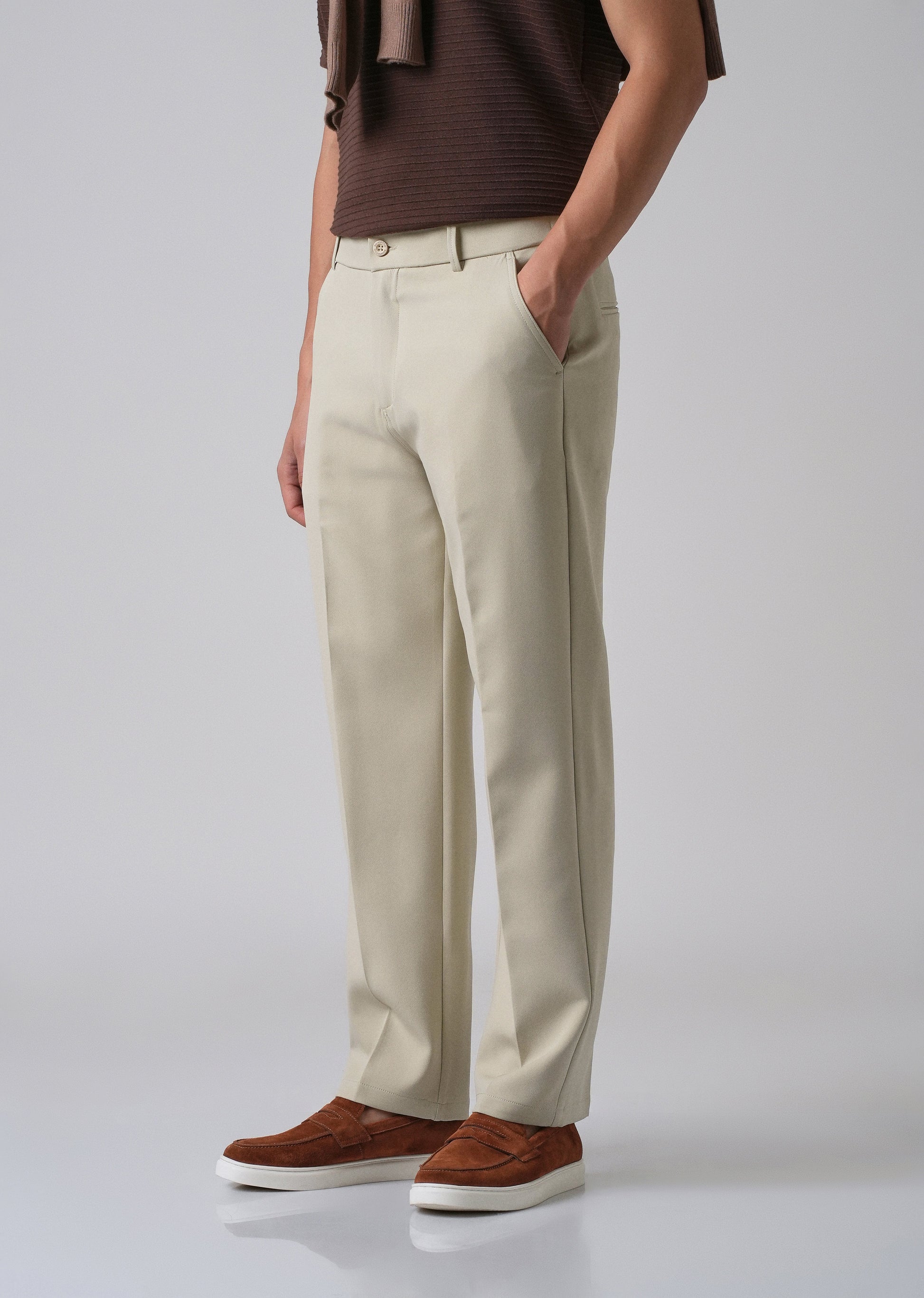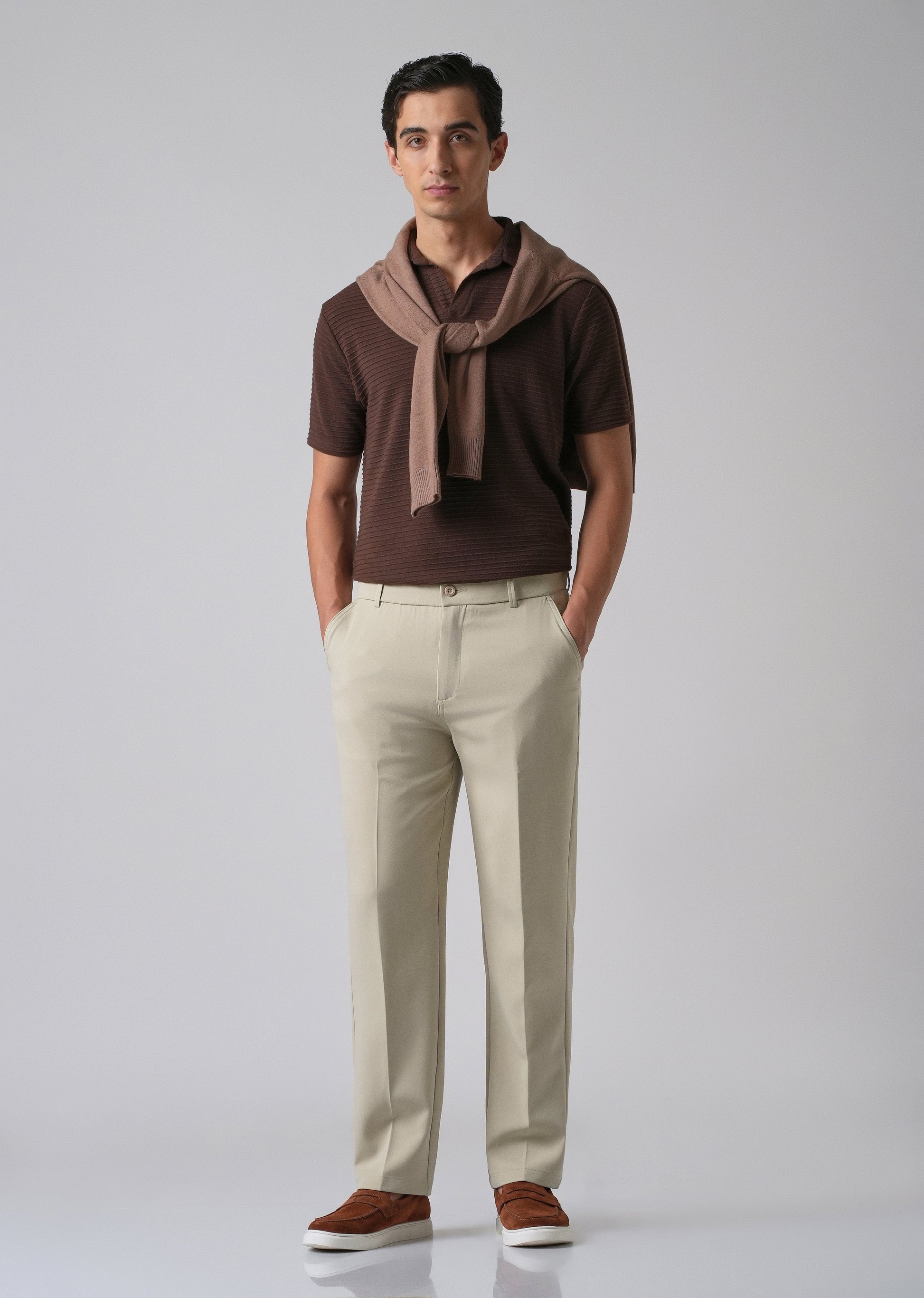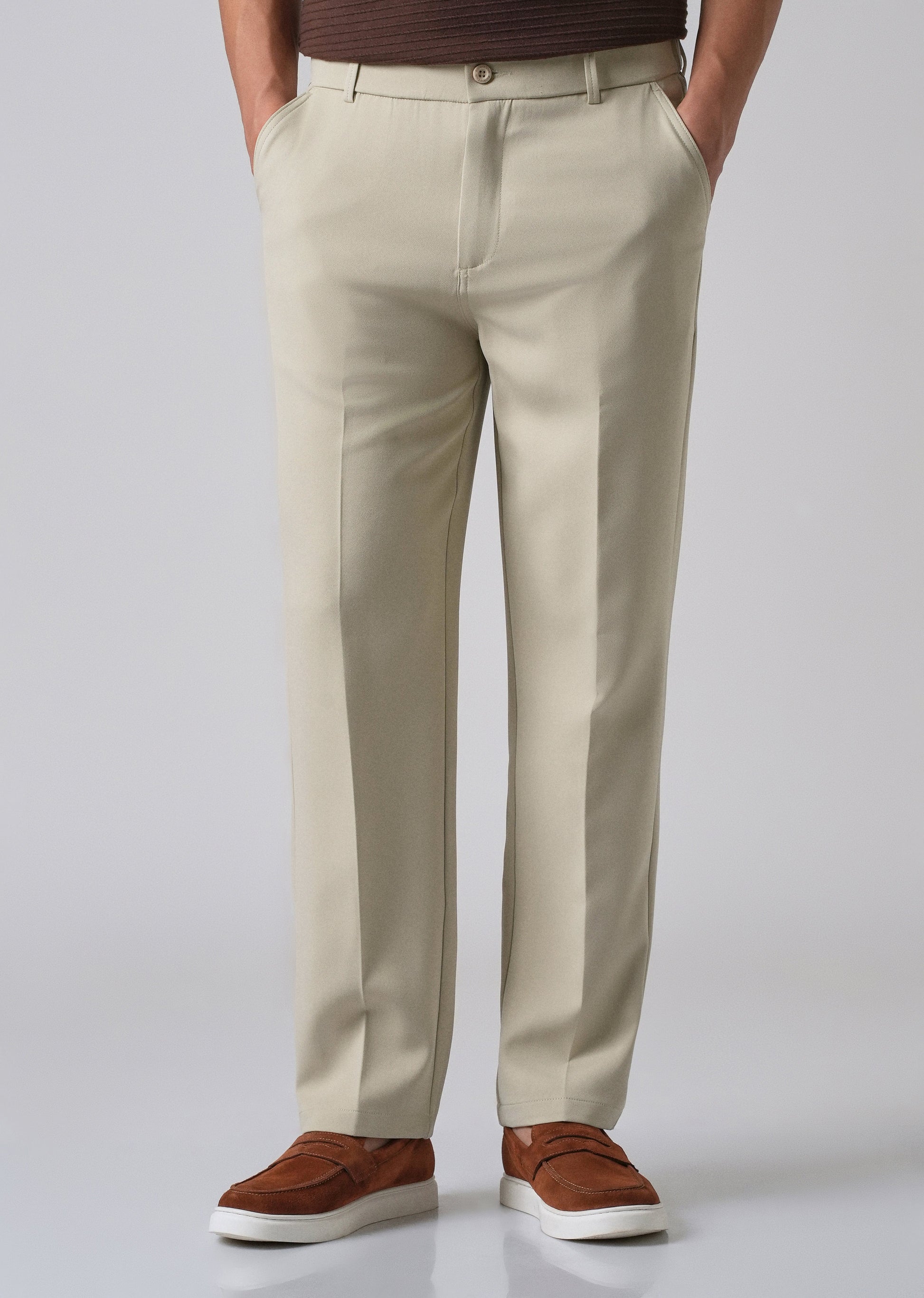 These trousers combine comfort and style with a semi-elasticated waistband and belt loops for a flexible yet polished fit. They feature a button and zipper closure, two side pockets, and two back welt pockets for everyday convenience. Made from a 96% polyester, 4% spandex blend, they offer gentle stretch and hold their shape—perfect for both casual and smart-casual wear.