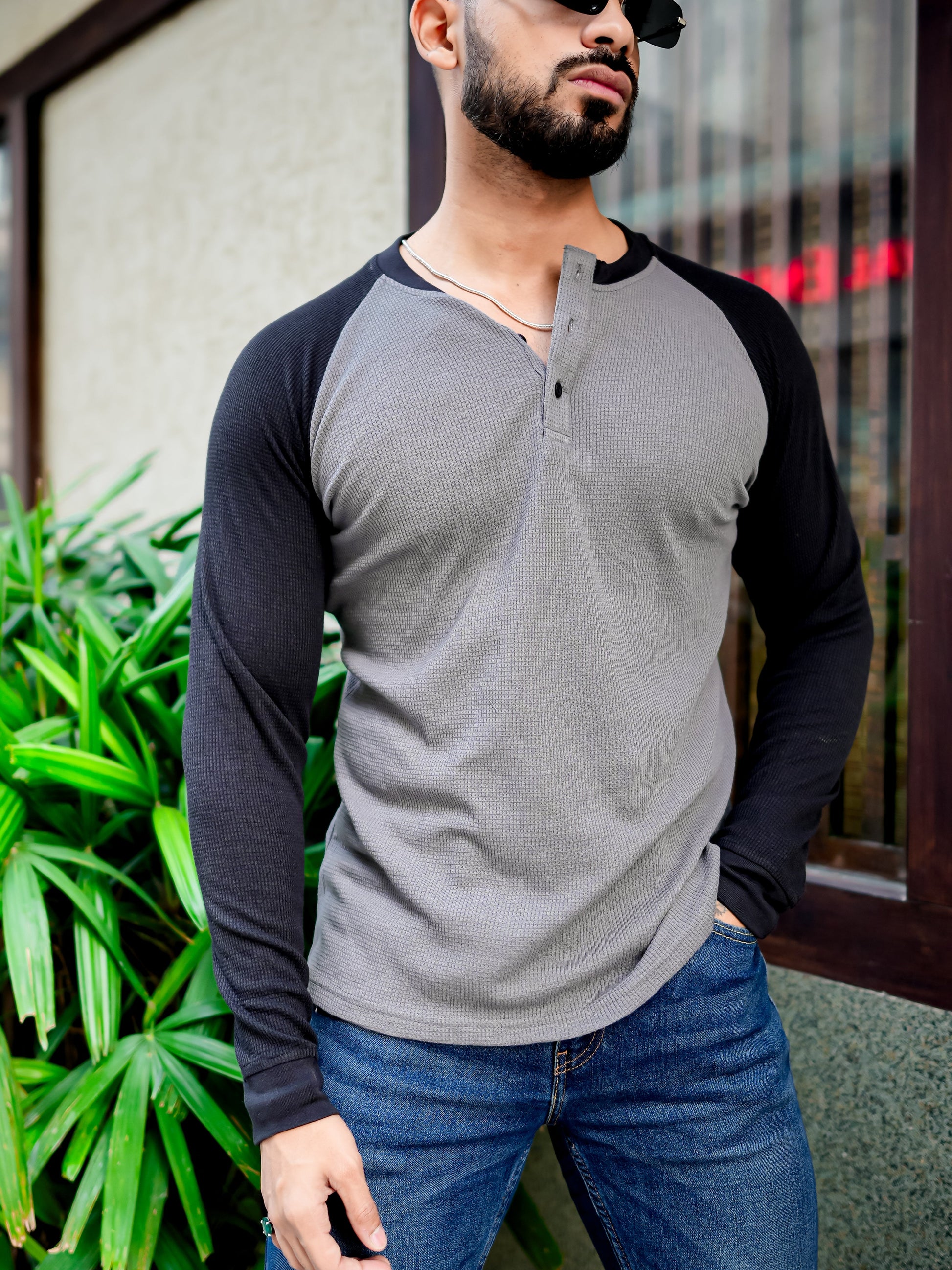 Grey Black Waffle Raglan Full Sleeve T-Shirt
