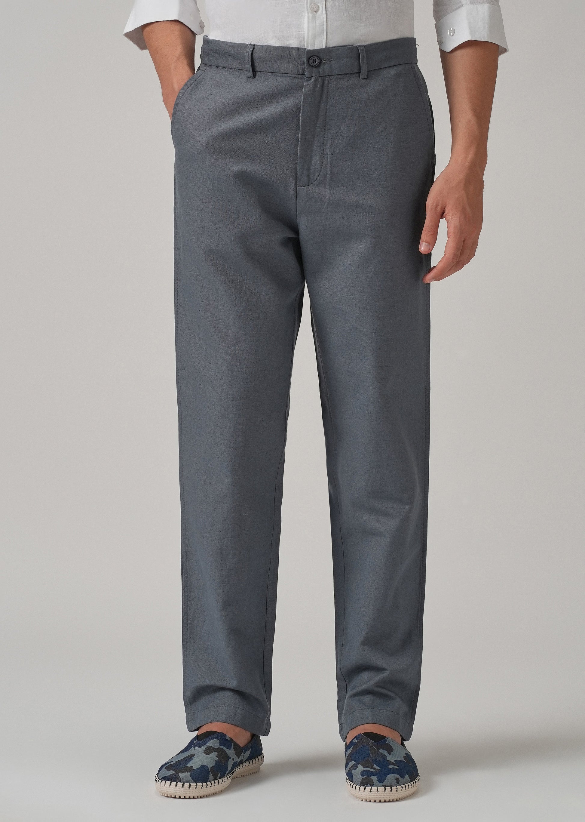These versatile trousers feature a semi-elasticated waistband for added comfort and a button closure with belt loops for a personalized fit. With two side pockets and two welt pockets at the back. The relaxed fit offers comfortable feel.