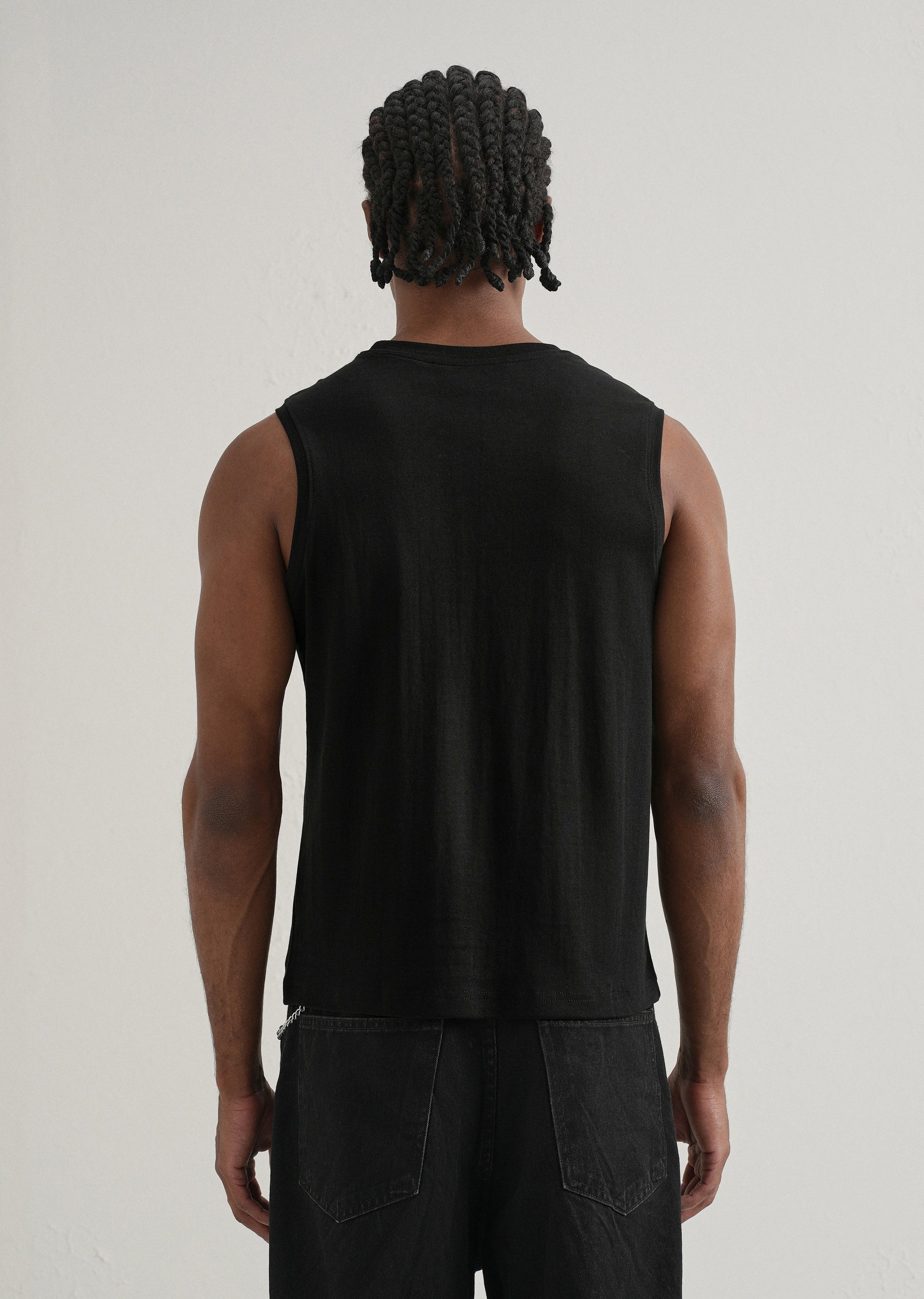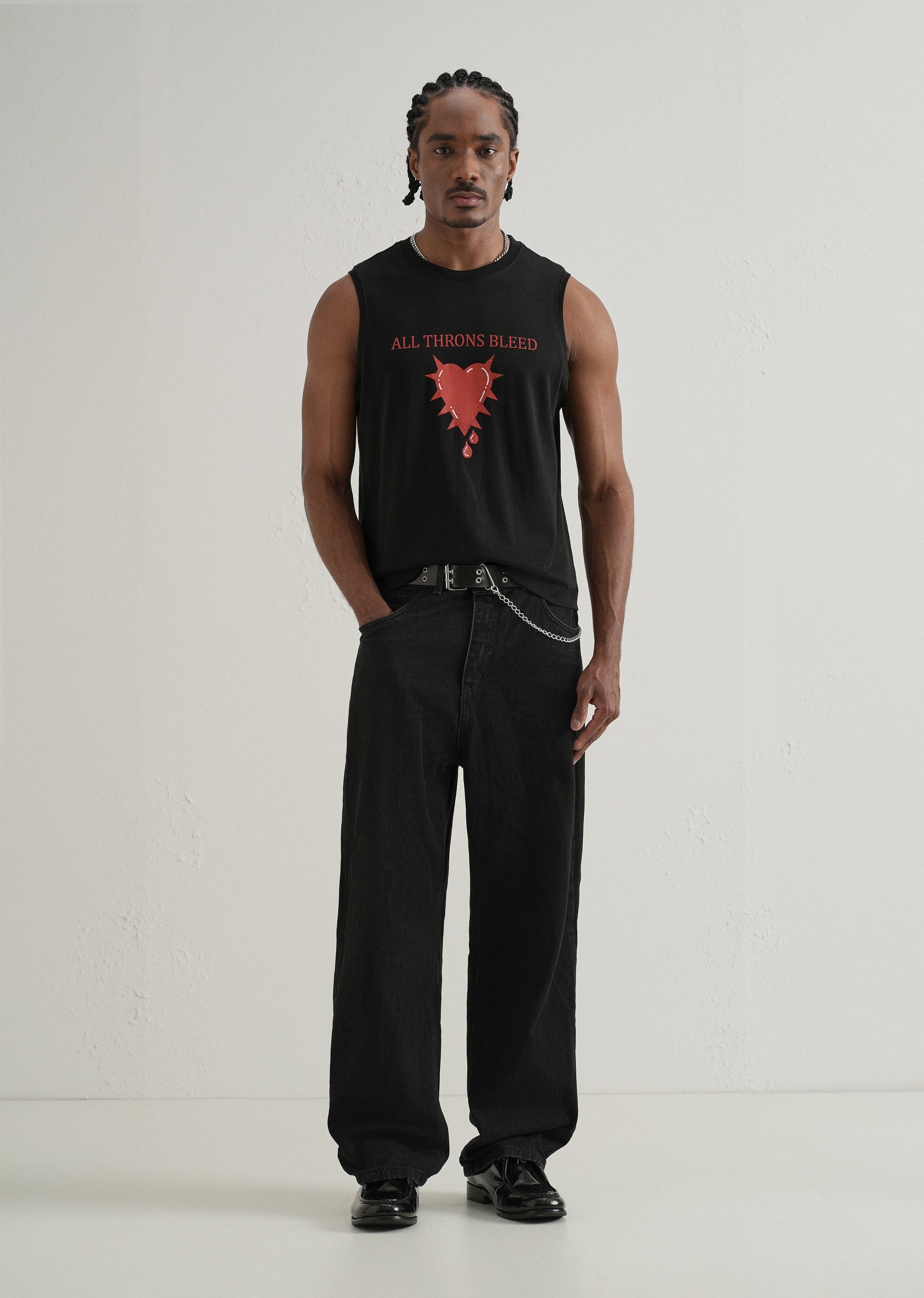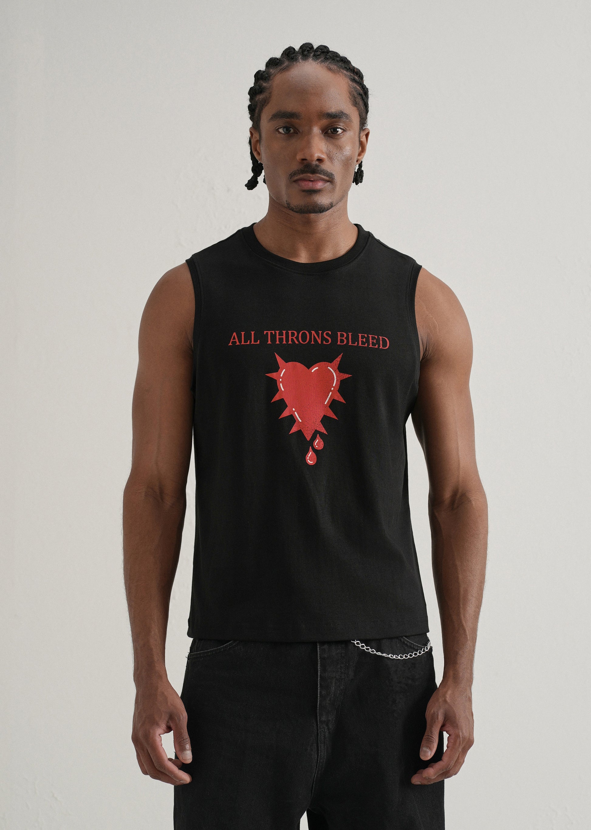 This sleeveless t-shirt featuring a bold graphic print on the front. The design showcases a red heart wrapped in thorns, adding a striking statement to your look. Crafted from soft and breathable fabric, it ensures all-day comfort and ease of movement.
