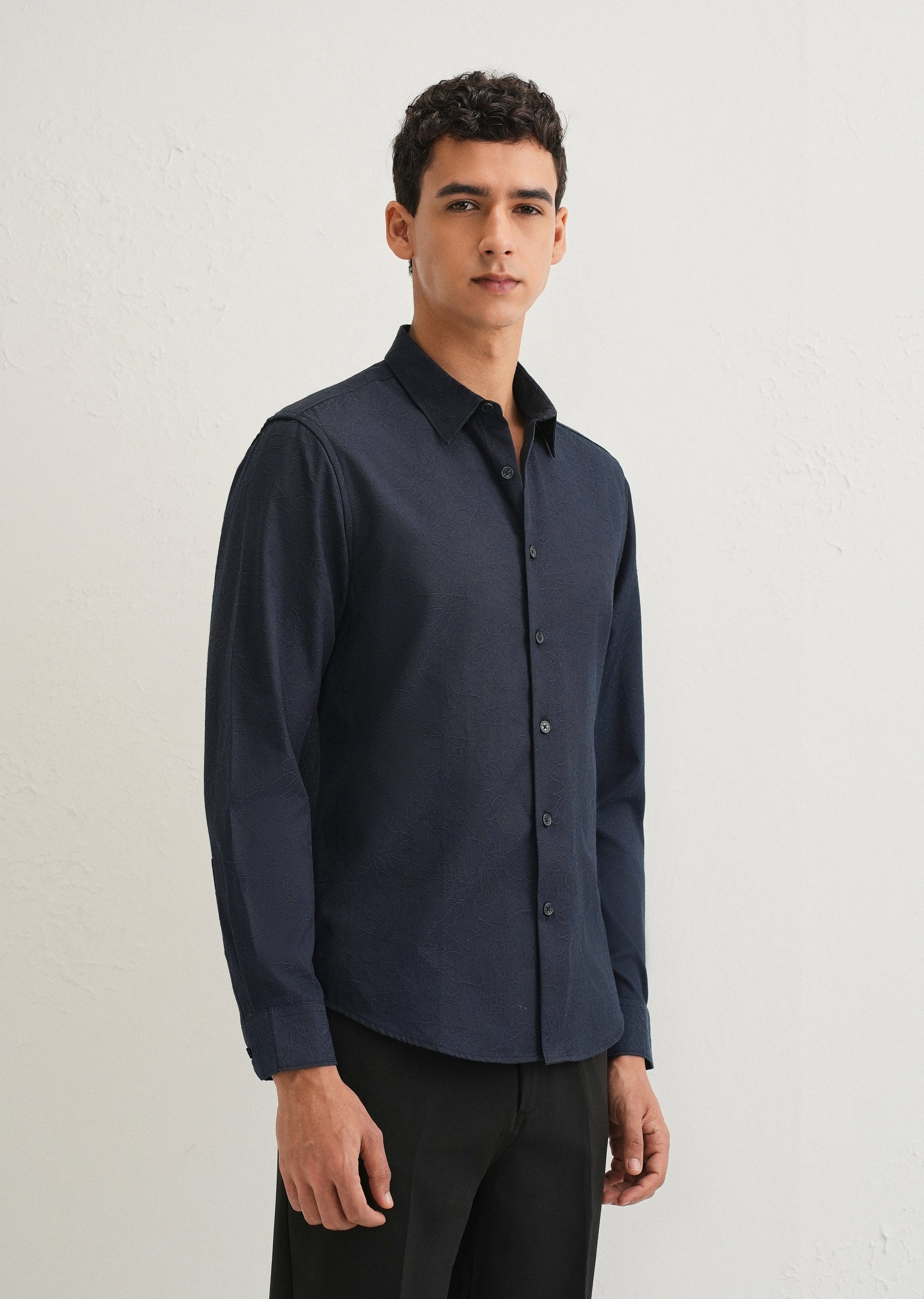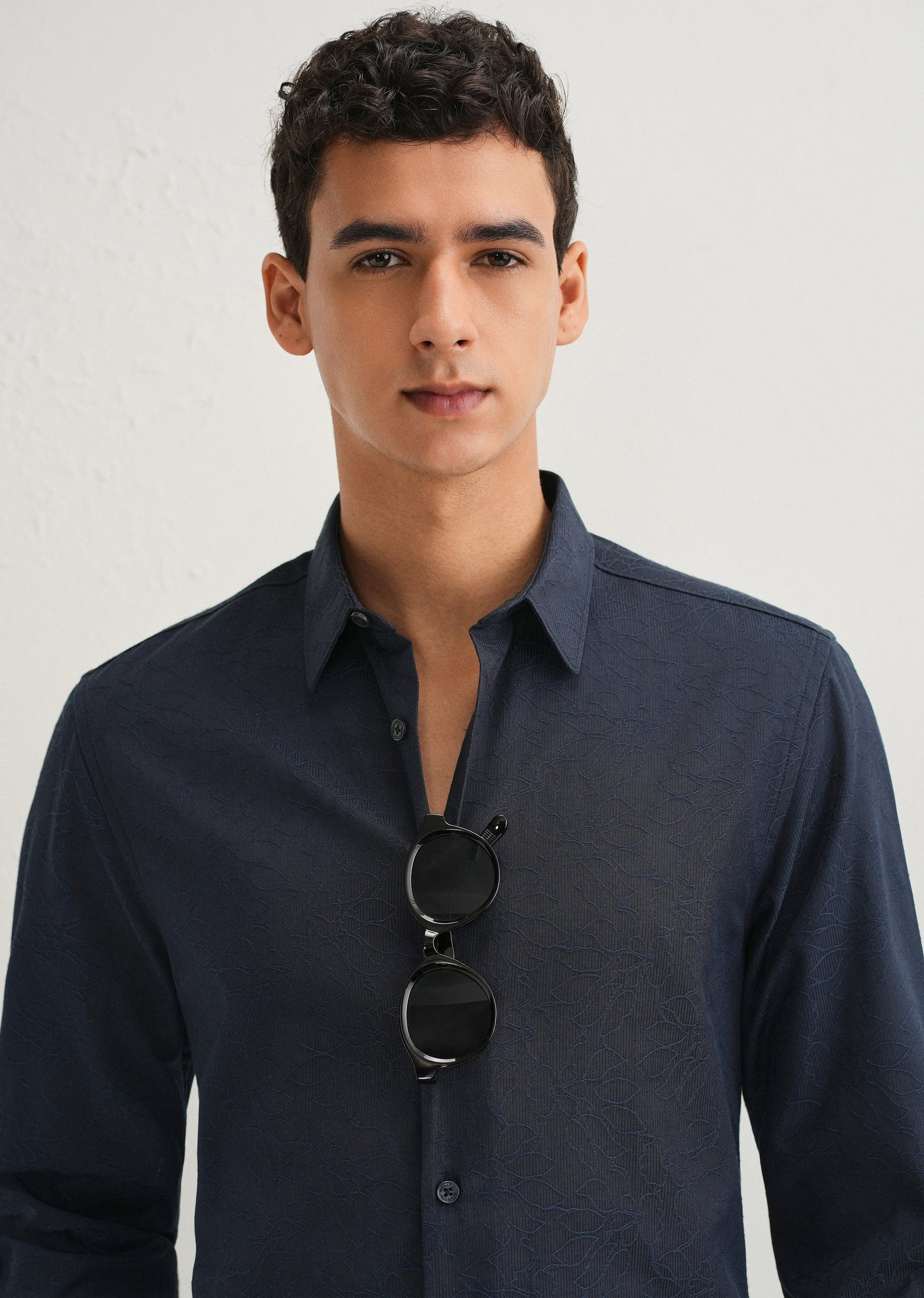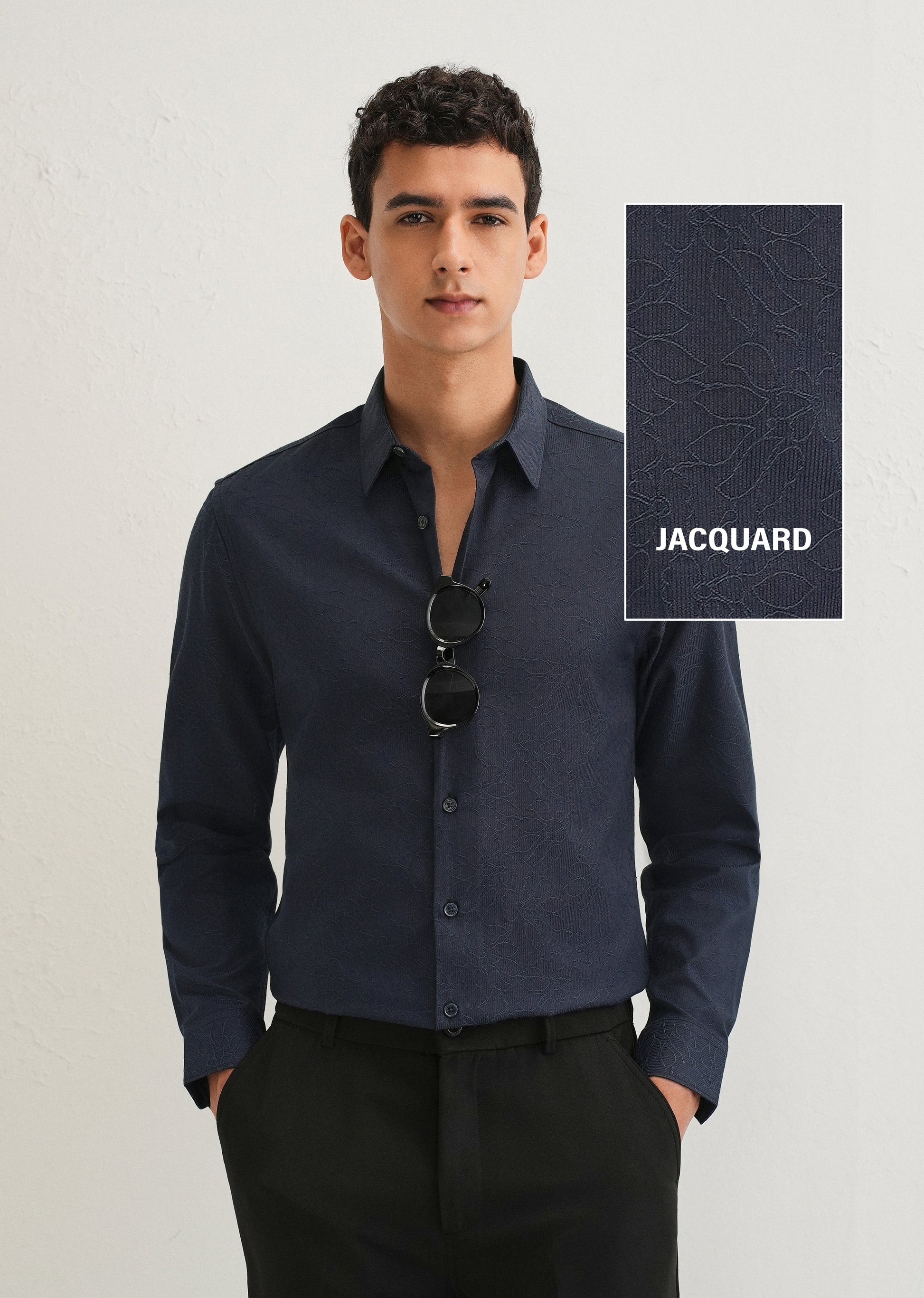 Elevate your casual wardrobe with our jacquard Shirt. This regular fit shirt features a spread collar and full sleeves, perfect for any occasion. The button closure ensures a sleek look, while the fabric adds a touch of elegance. Crafted from high-quality woven fabric which is lightweight and breathable. Ideal for those seeking a unique and fashionable addition to their collection, this shirt is a must-have for any fashion-forward individual.