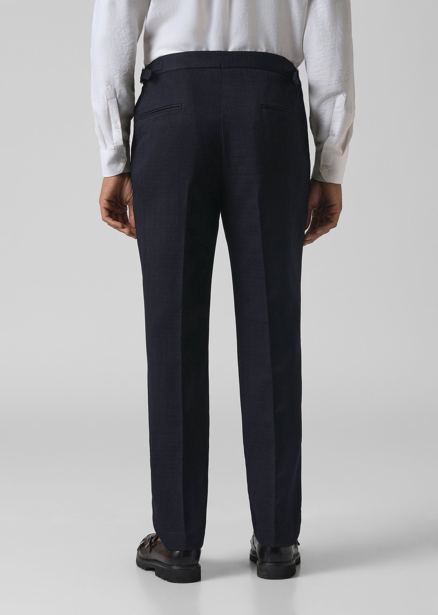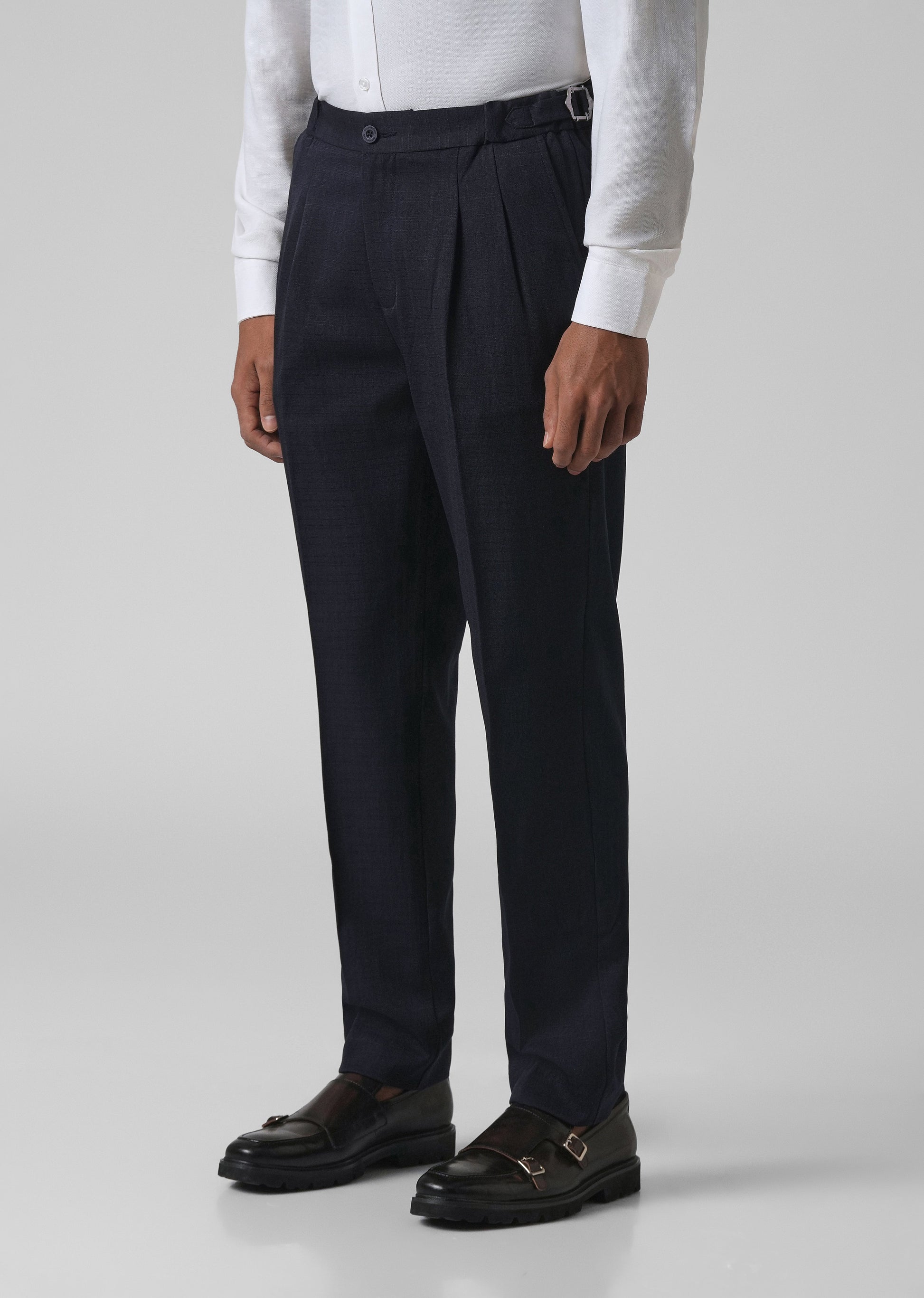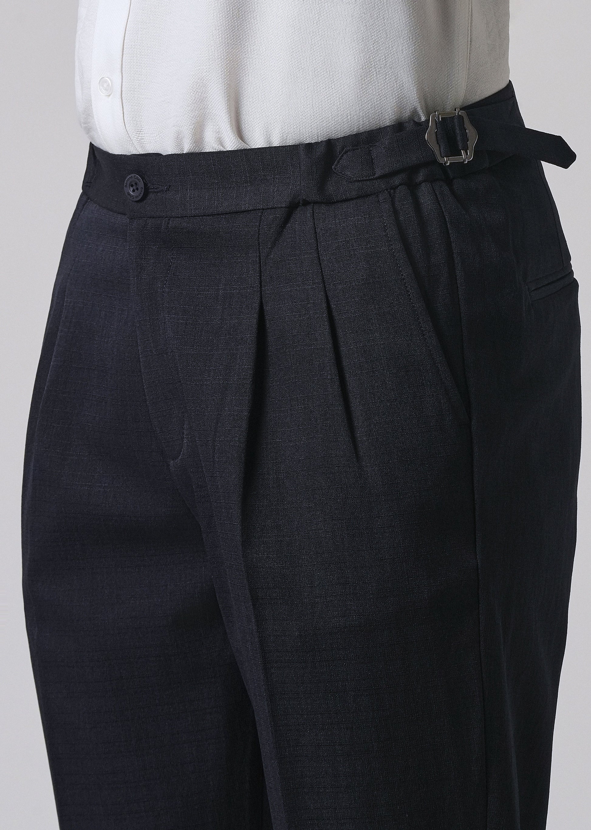 Upgrade your style with this gurkha trouser. Designed with a mid-rise waist and side buckle adjustable, it offers a perfect fit and a sharp look. The double pleats in the front give it a tailored, elegant touch, while the narrow legs keep the silhouette modern and clean. Made from lightweight fabric, it’s comfortable for all-day wear whether you’re heading to work, an event, or a weekend outing.