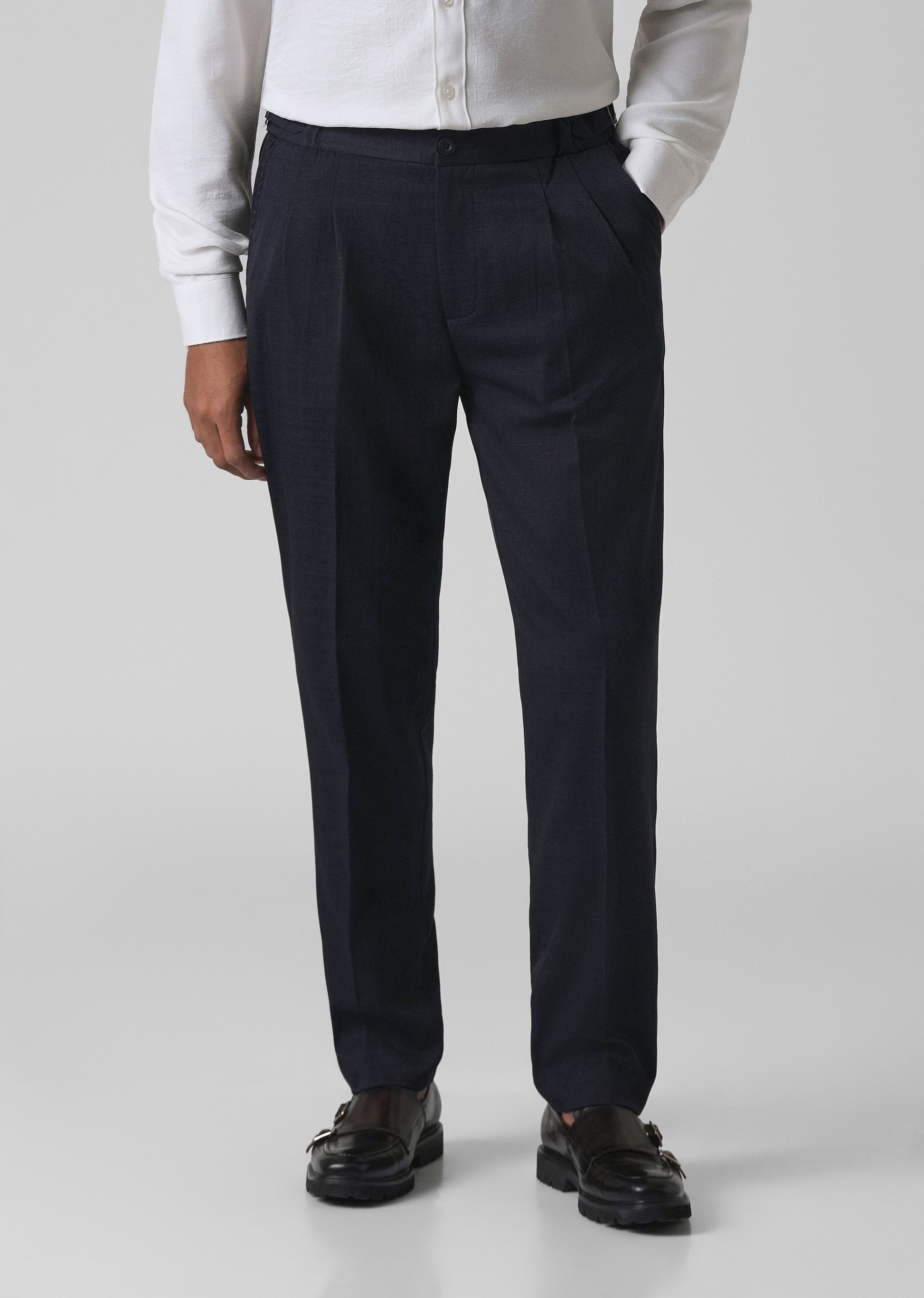 - Mid-rise fit with double forward pleats.