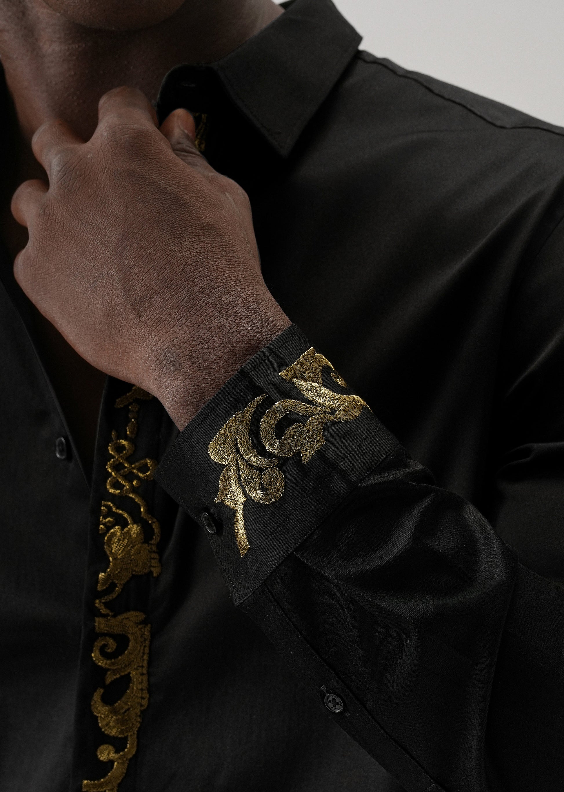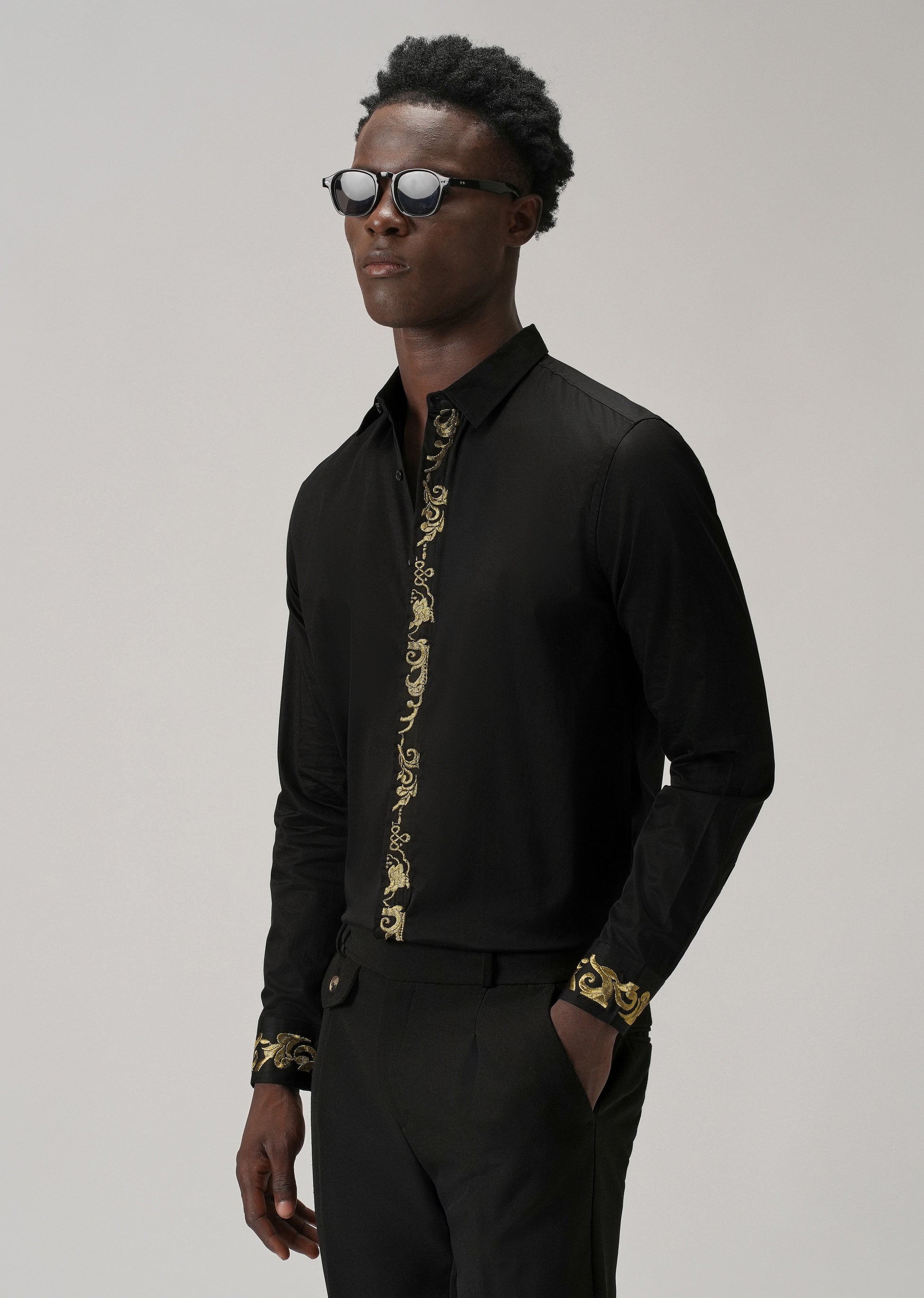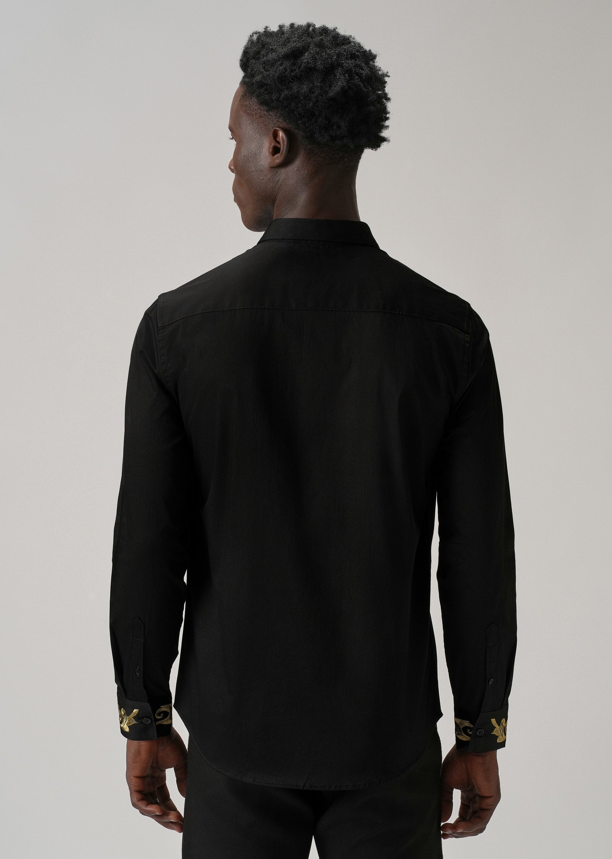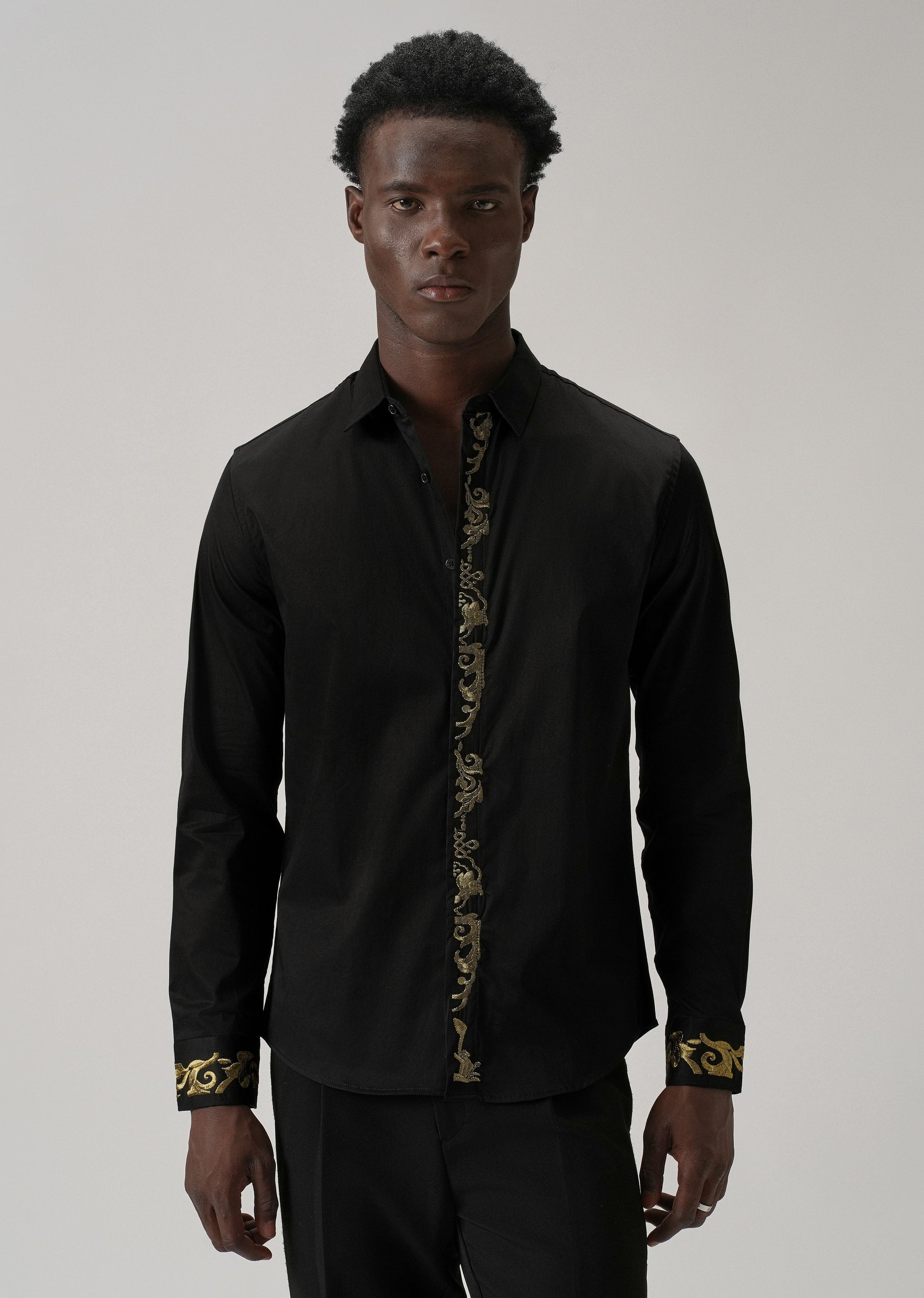 Classic with a touch of detail. Featuring intricate embroidery on the front panel and cuffs, this shirt blends sophistication with subtle craftsmanship. The button-up front, normal collar, and curved hem add to its timeless appeal, while the slim fit ensures a sharp look.