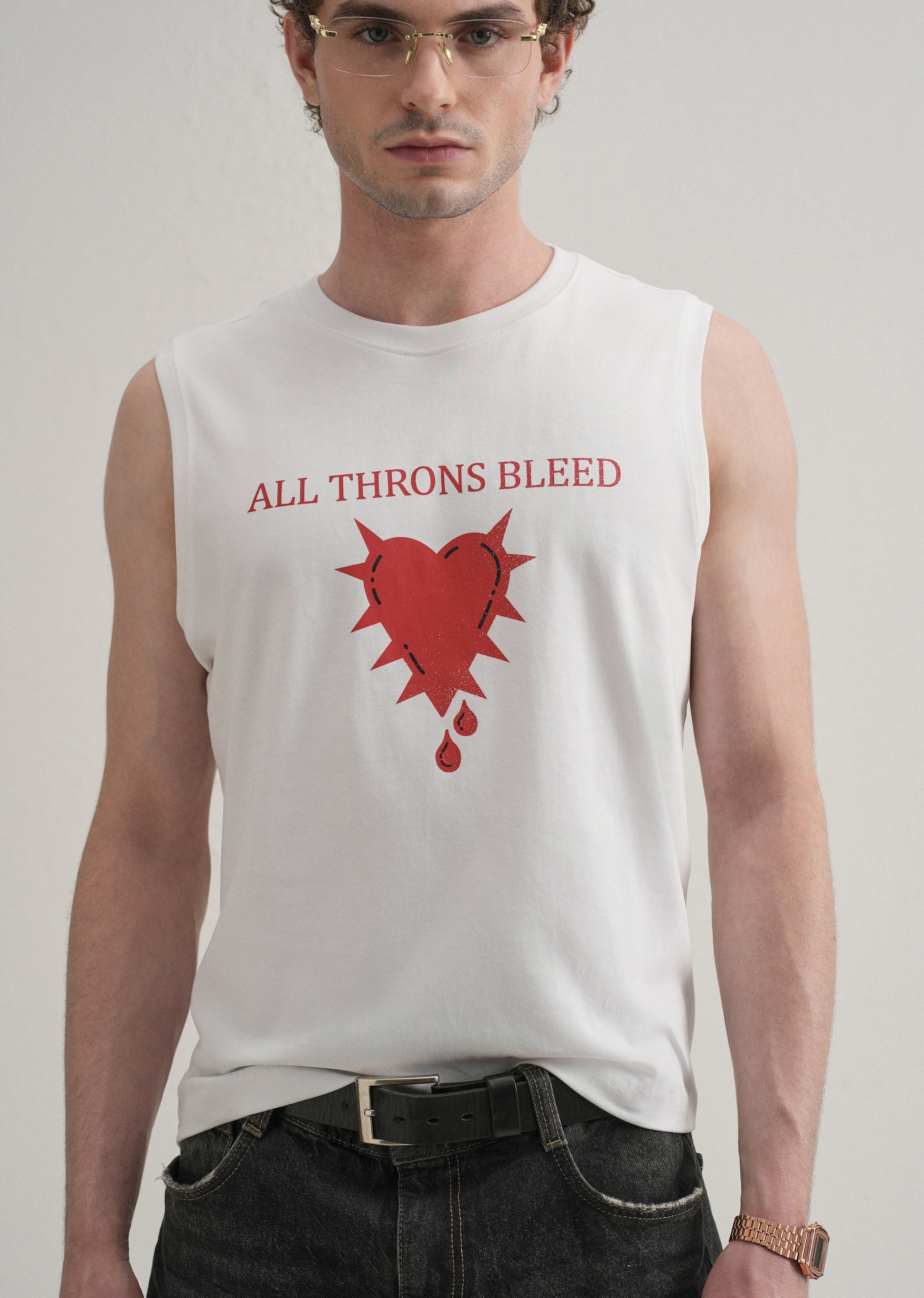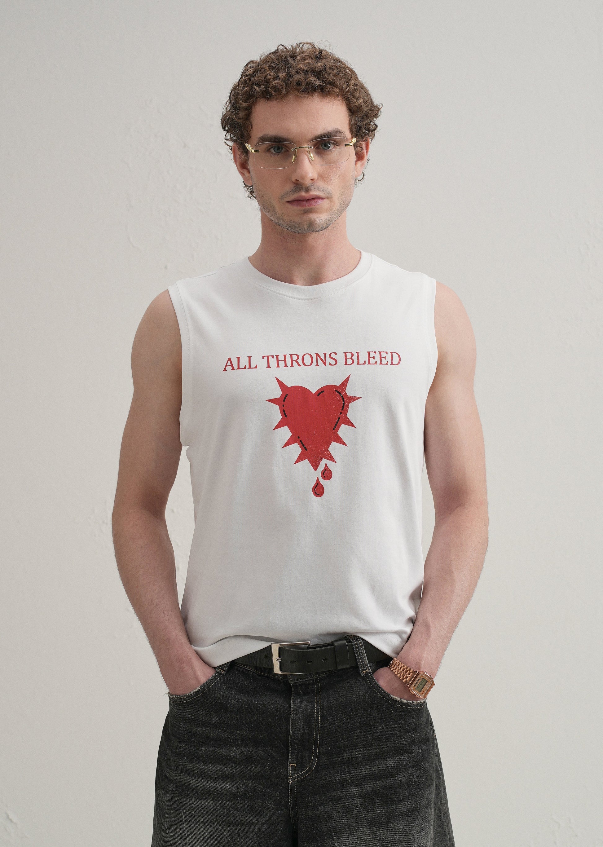 This sleeveless t-shirt featuring a bold graphic print on the front. The design showcases a red heart wrapped in thorns, adding a striking statement to your look. Crafted from soft and breathable fabric, it ensures all-day comfort and ease of movement.