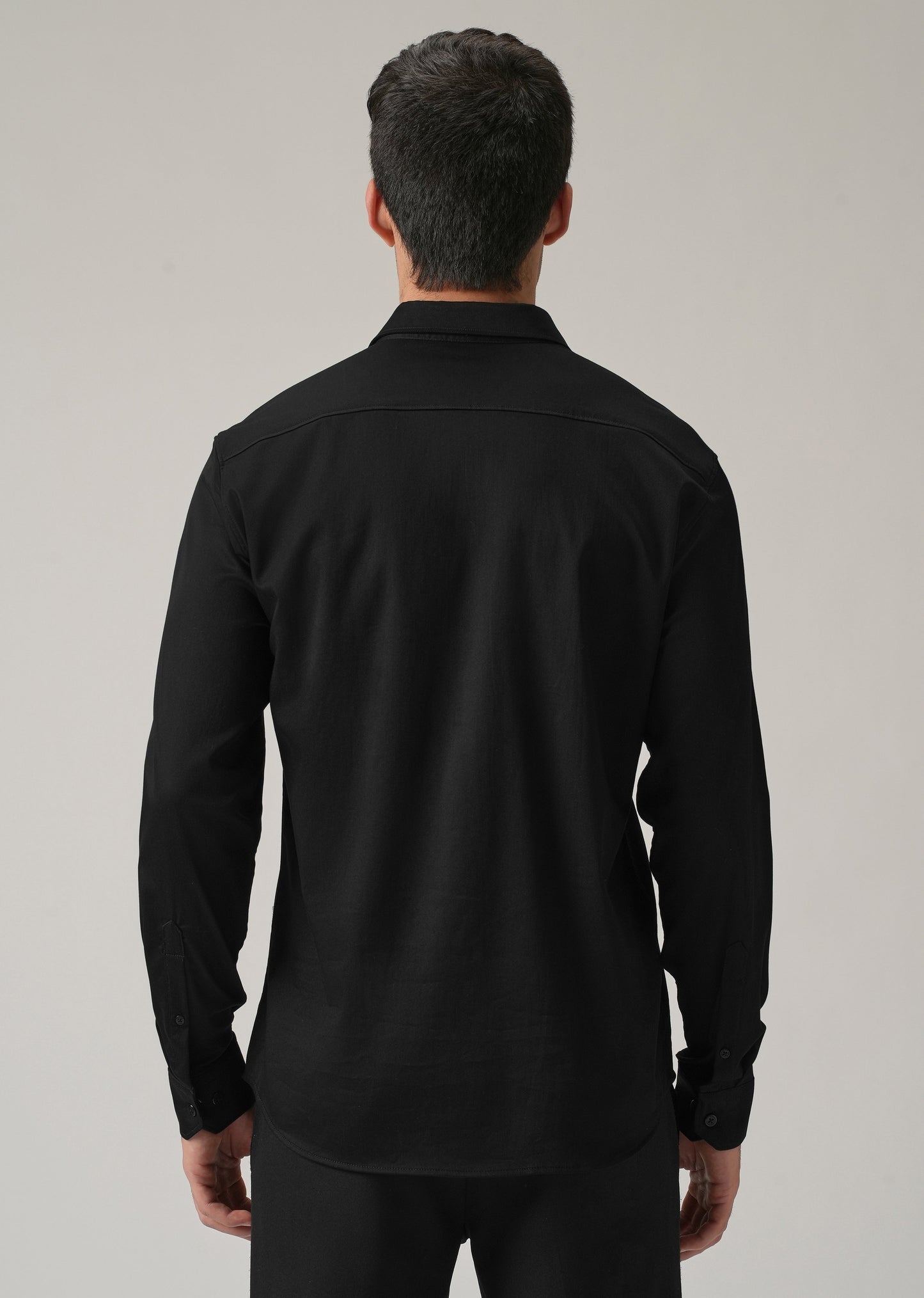 - Curved hem design with spread collar.