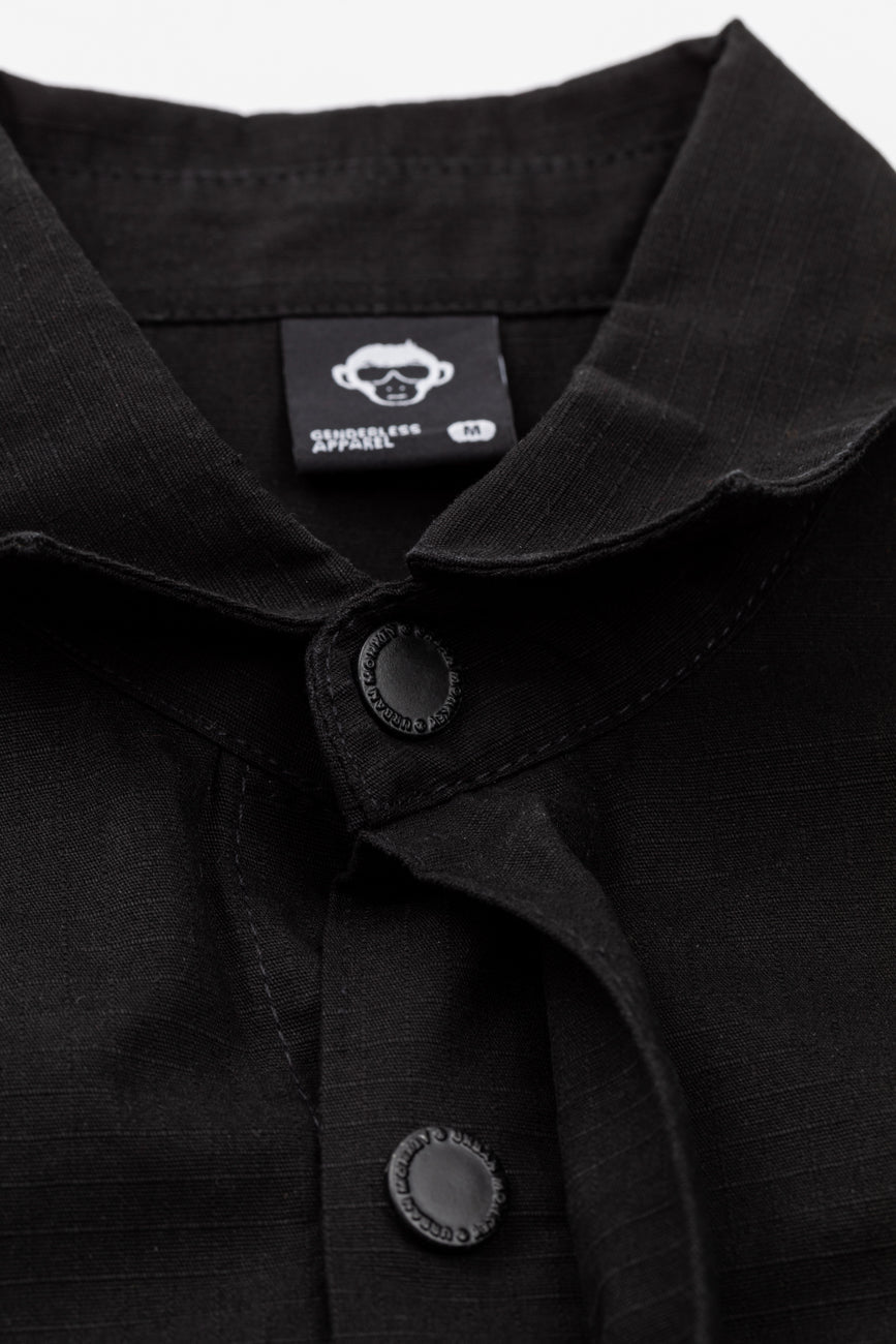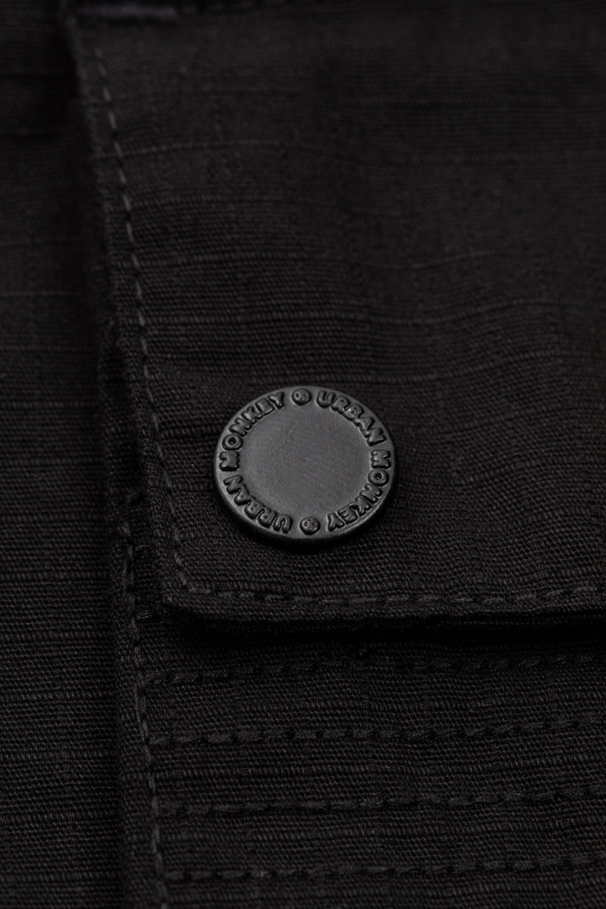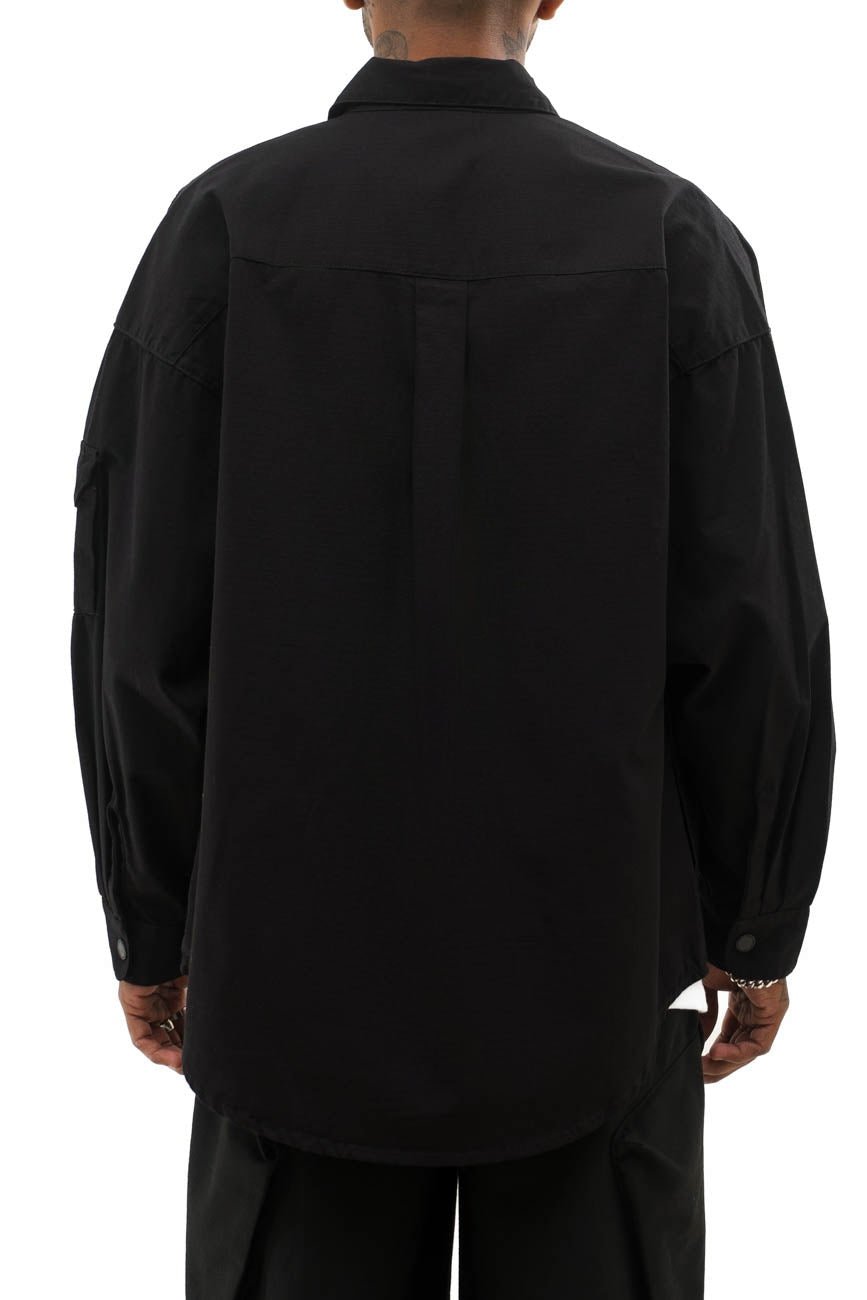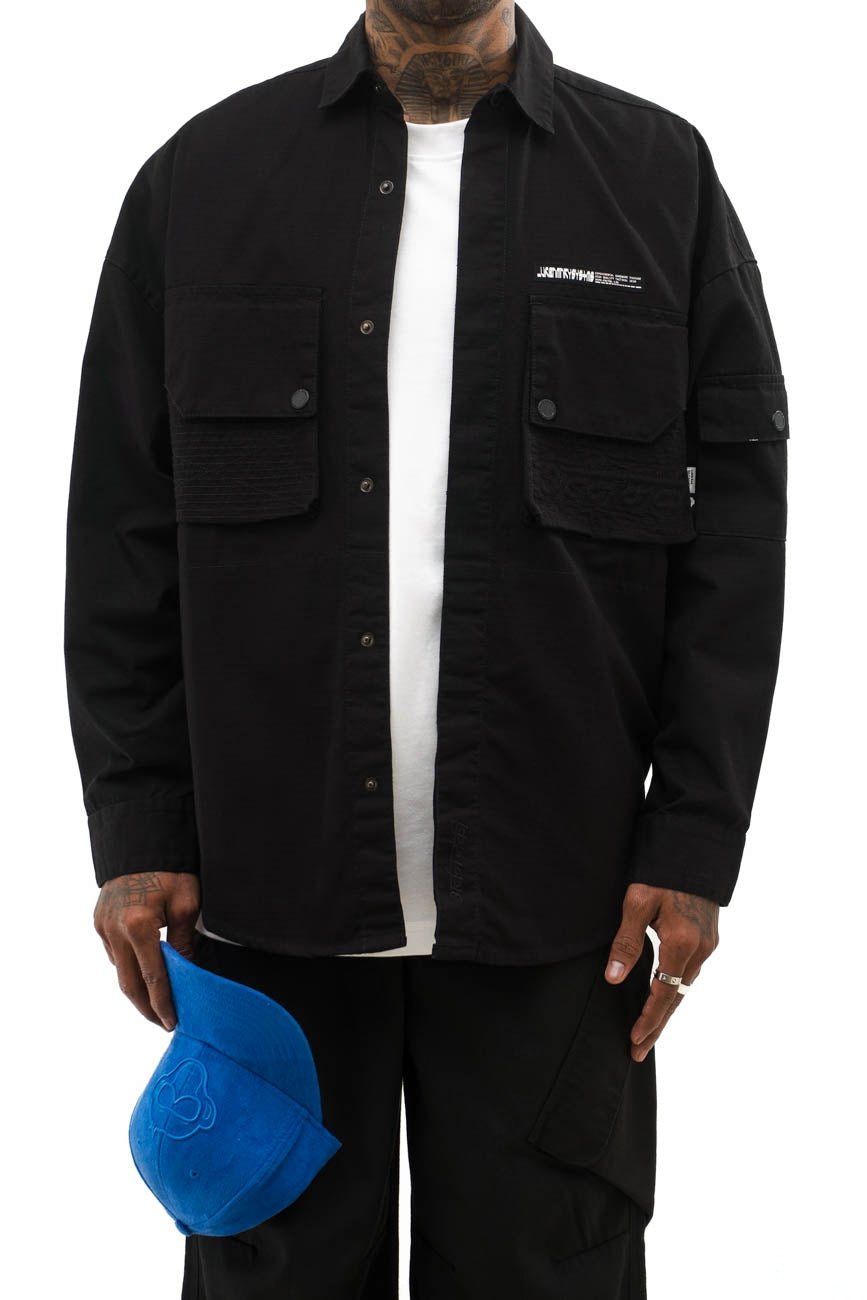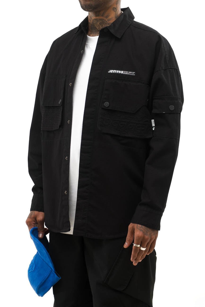 Part of our Urbanmnky-Systms™ collection, this multi pocket black over shirt is crafted in lightweight cotton Ripstop fabric that has been reinforced to make it more resistant to tearing or ripping. Featuring two chest pockets, an added pocket on left sleeve, and brand label patches, this versatile shirt is packed with meticulous signature details. Roomy cut for easy layering. Authentic workwear feel.