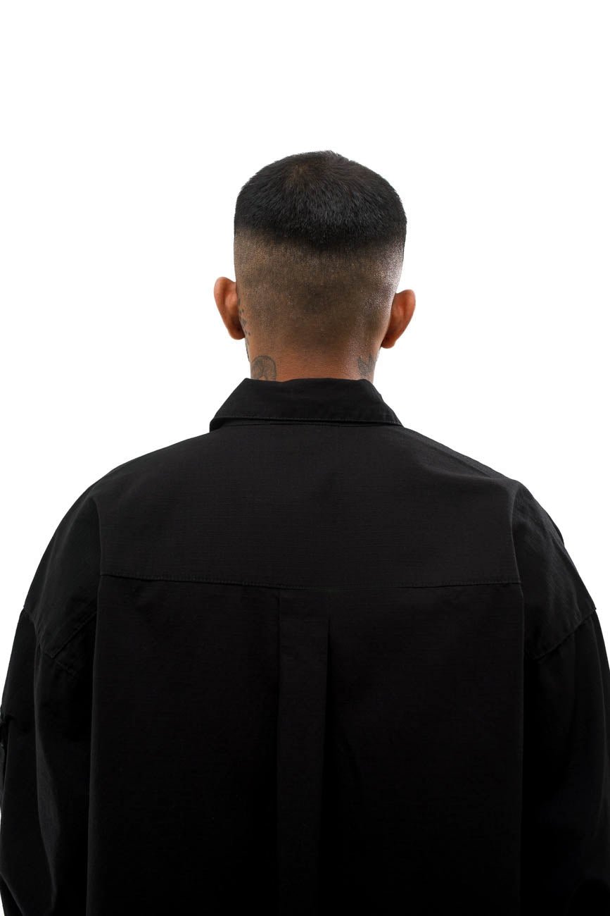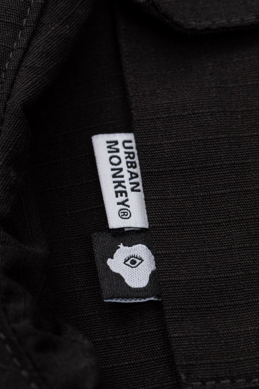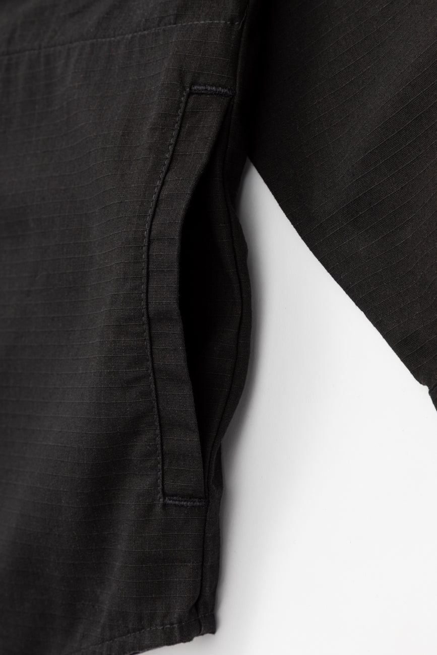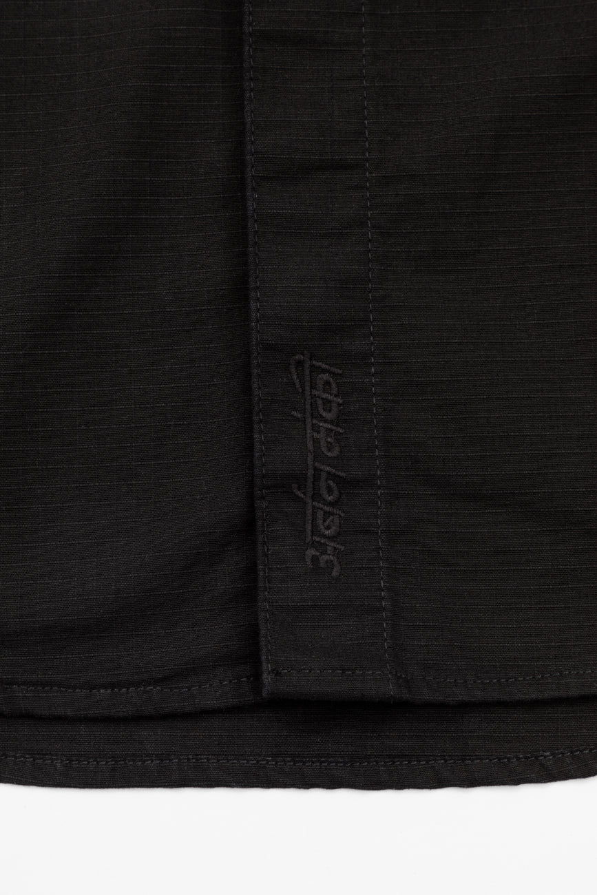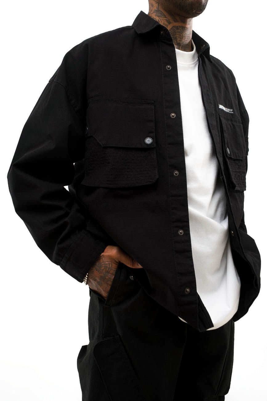 Part of our Urbanmnky-Systms™ collection, this multi pocket black over shirt is crafted in lightweight cotton Ripstop fabric that has been reinforced to make it more resistant to tearing or ripping. Featuring two chest pockets, an added pocket on left sleeve, and brand label patches, this versatile shirt is packed with meticulous signature details. Roomy cut for easy layering. Authentic workwear feel.