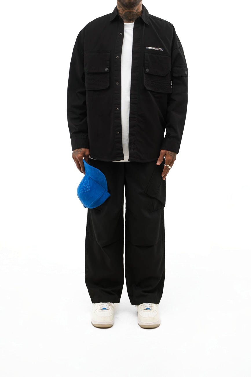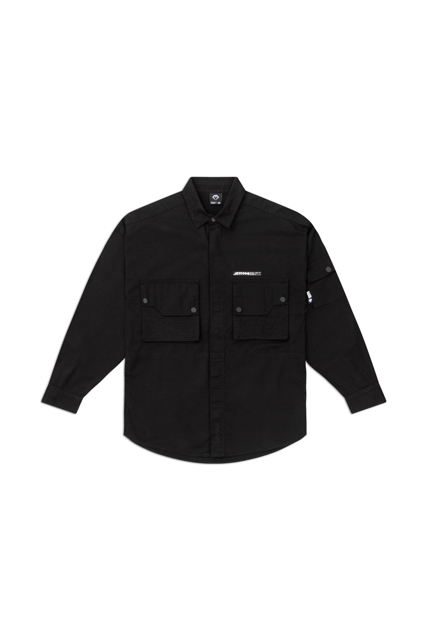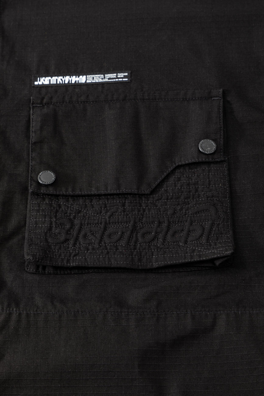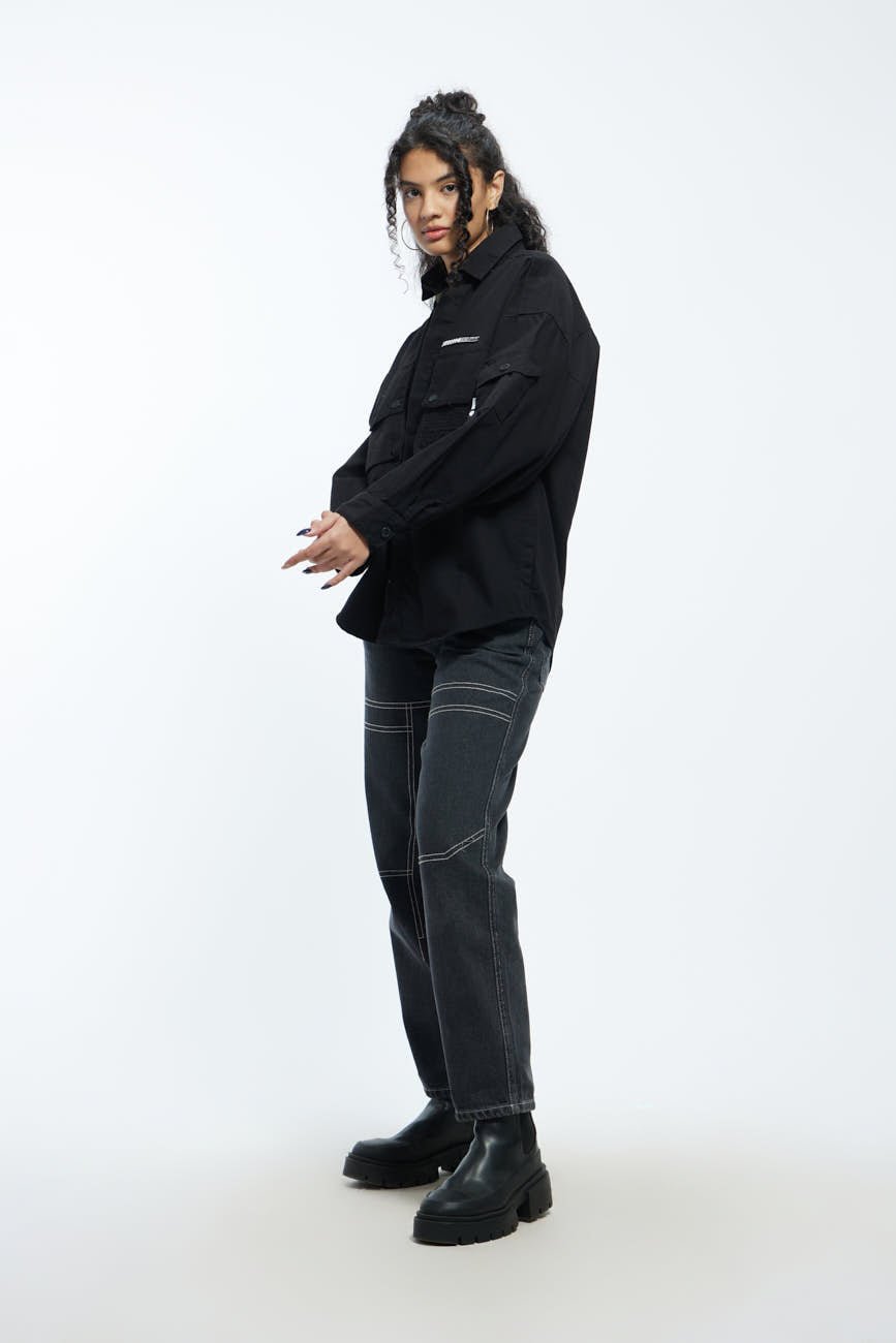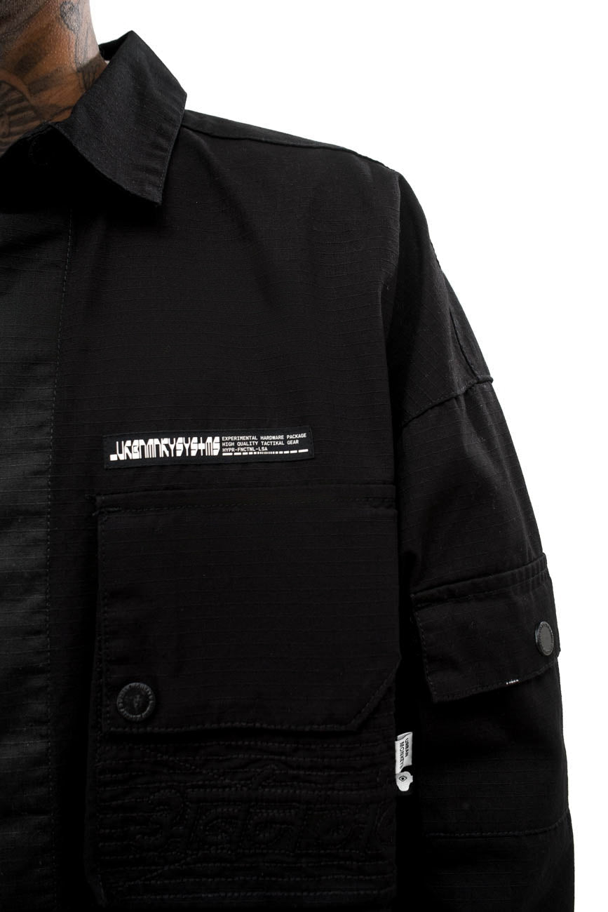 Part of our Urbanmnky-Systms™ collection, this multi pocket black over shirt is crafted in lightweight cotton Ripstop fabric that has been reinforced to make it more resistant to tearing or ripping. Featuring two chest pockets, an added pocket on left sleeve, and brand label patches, this versatile shirt is packed with meticulous signature details. Roomy cut for easy layering. Authentic workwear feel.