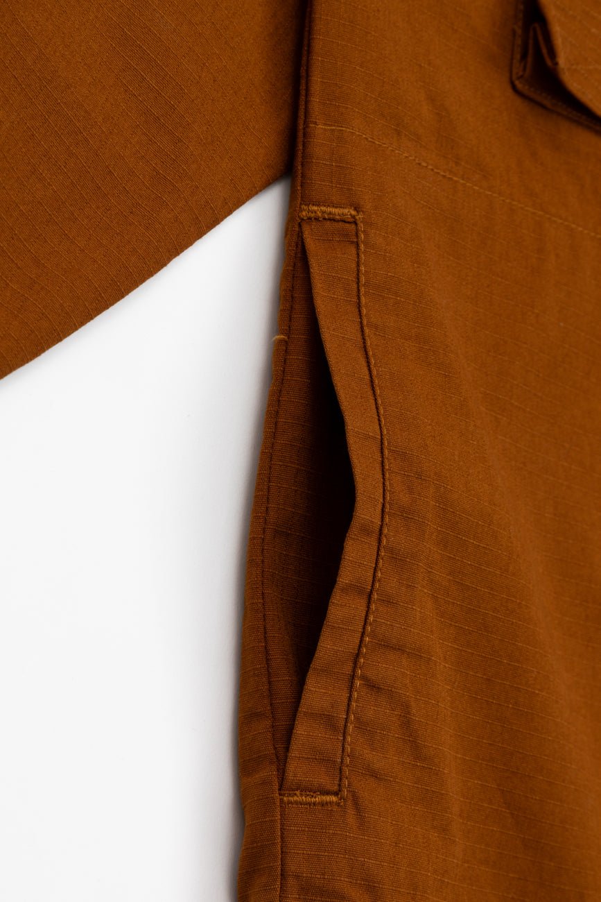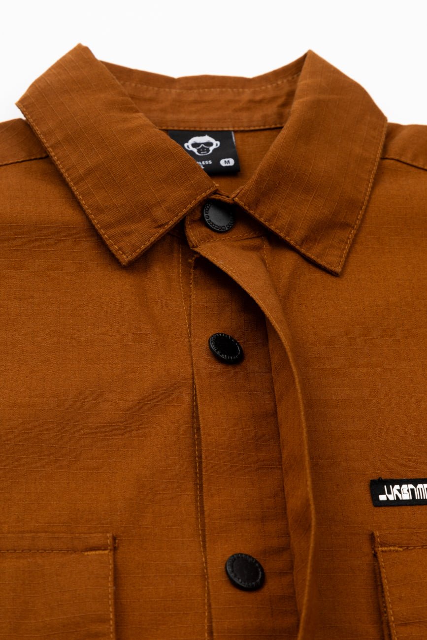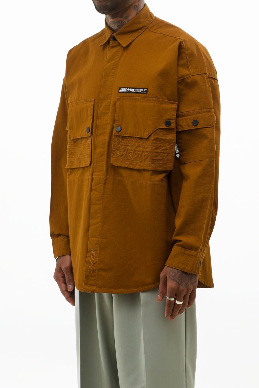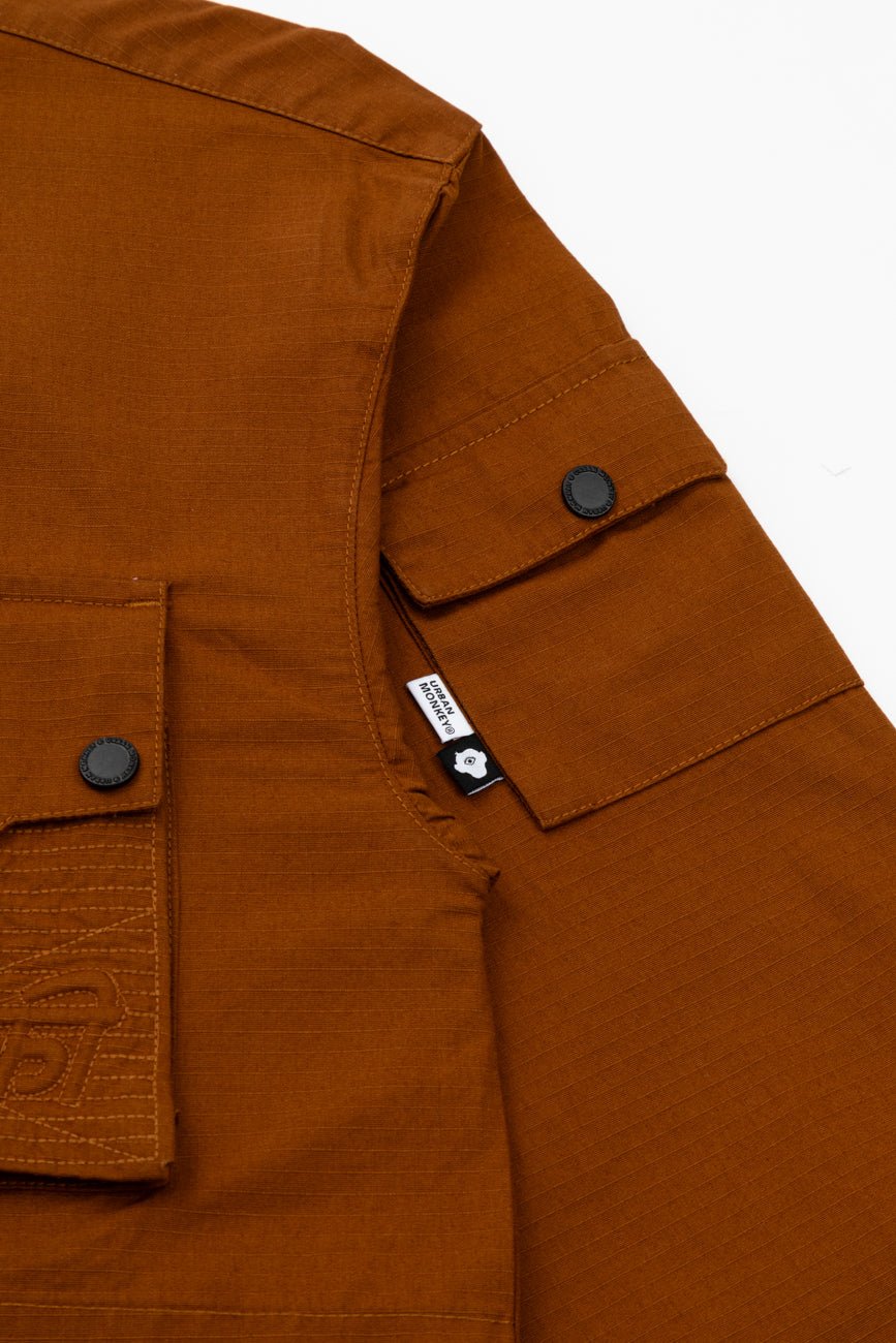 Part of our Urbanmnky-Systms™ collection, this multi pocket Tan Brown/Rust over shirt is crafted in lightweight cotton Ripstop fabric that has been reinforced to make it more resistant to tearing or ripping. Featuring two chest pockets, an added pocket on left sleeve, and brand label patches, this versatile shirt is packed with meticulous signature details. Roomy cut for easy layering. Authentic workwear feel.