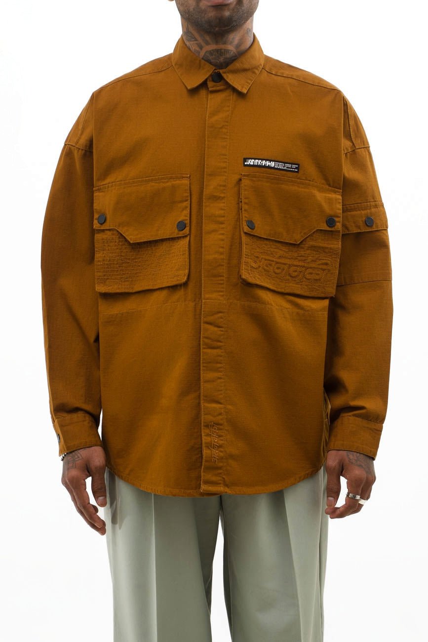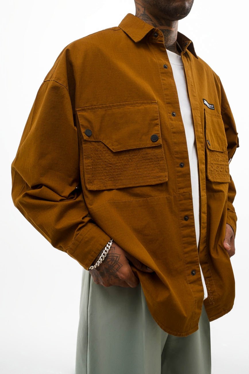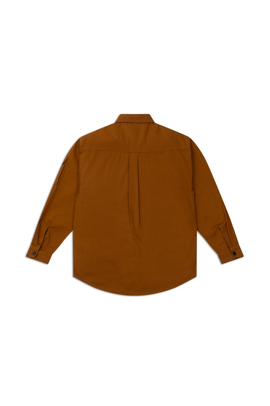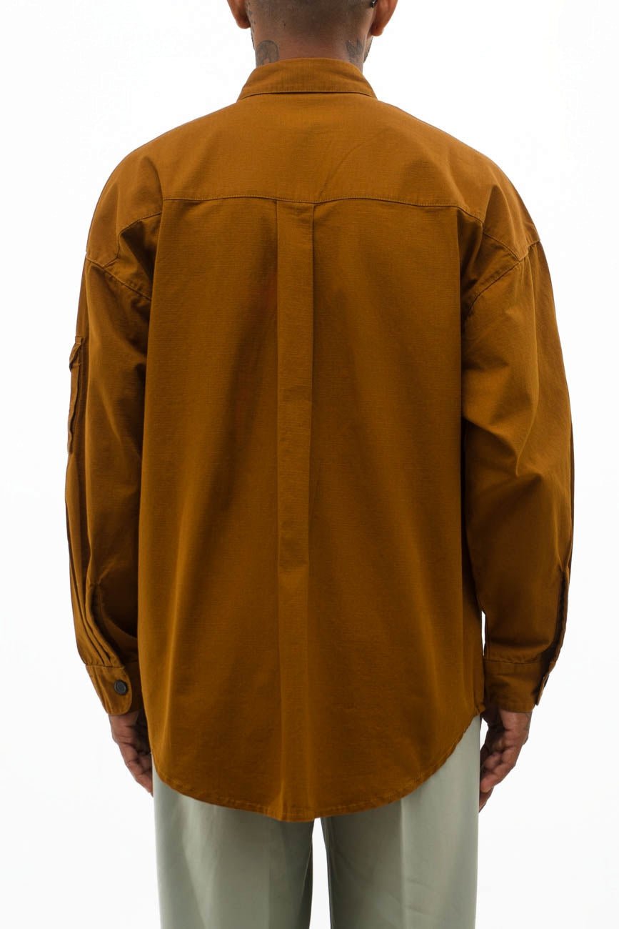 Part of our Urbanmnky-Systms™ collection, this multi pocket Tan Brown/Rust over shirt is crafted in lightweight cotton Ripstop fabric that has been reinforced to make it more resistant to tearing or ripping. Featuring two chest pockets, an added pocket on left sleeve, and brand label patches, this versatile shirt is packed with meticulous signature details. Roomy cut for easy layering. Authentic workwear feel.