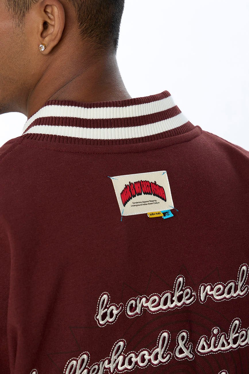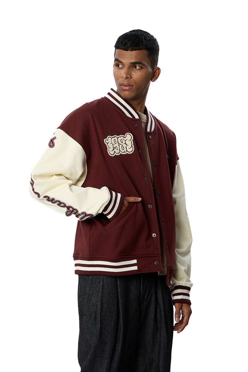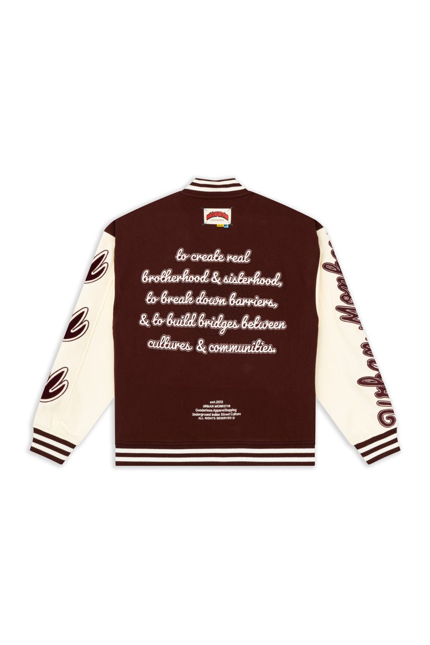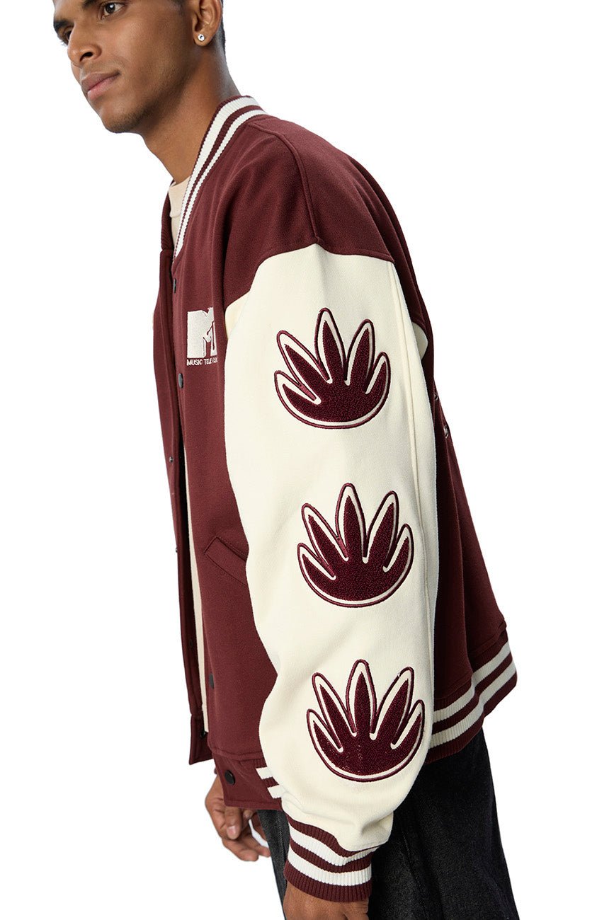 Mtv X Urban Monkey Varsity Jacket – Brown. The Royalty Varsity Jacket from the MTV x Urban Monkey 2.0 collection is where old-school charm meets street-ready edge. Designed for those who own the moment, this unisex jacket blends iconic varsity vibes with bold, modern details. The rich brown body, paired with contrasting cream sleeves, sets the stage for intricate appliqués and embroidered graphics that tell a story of unity, culture, and music.