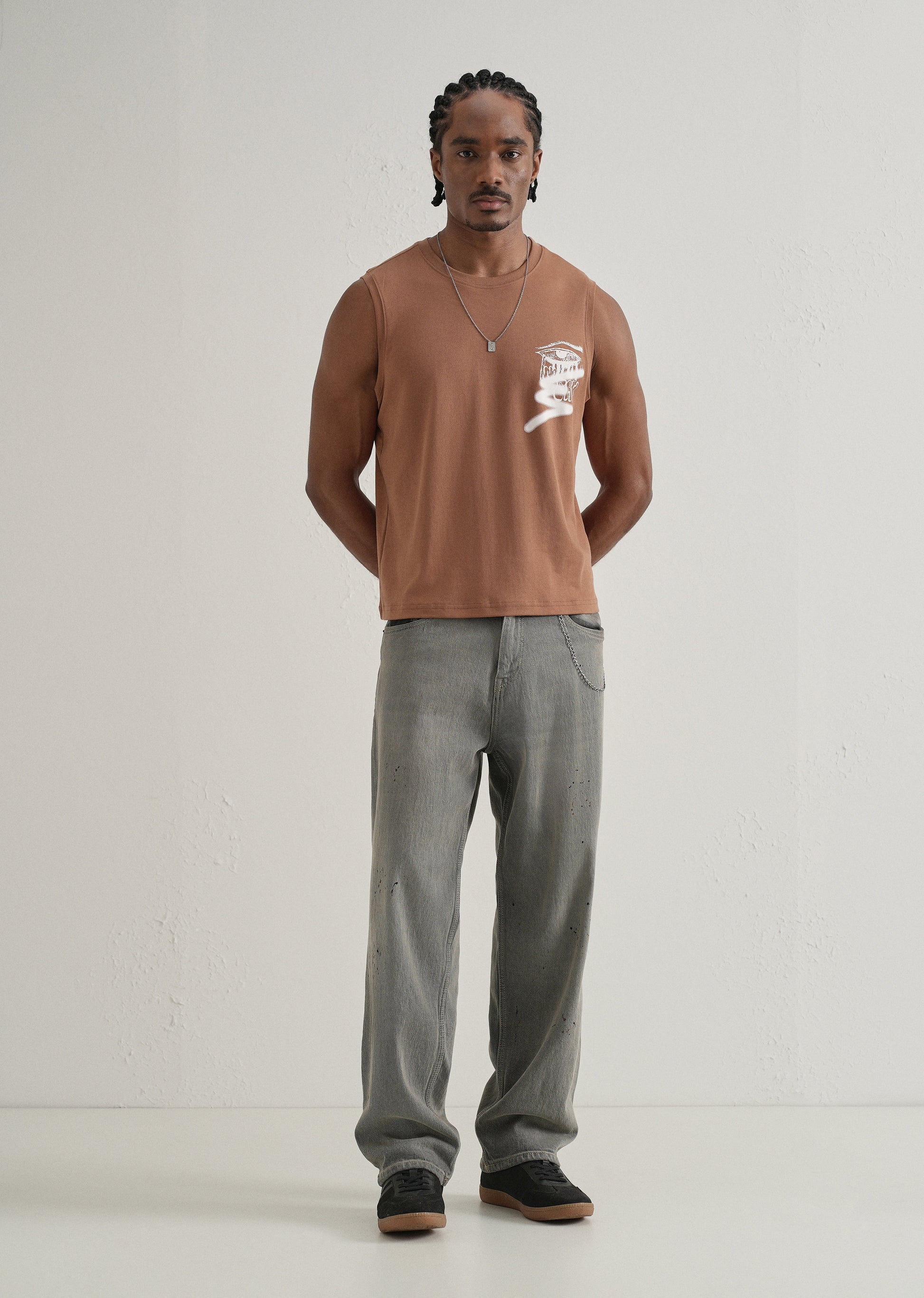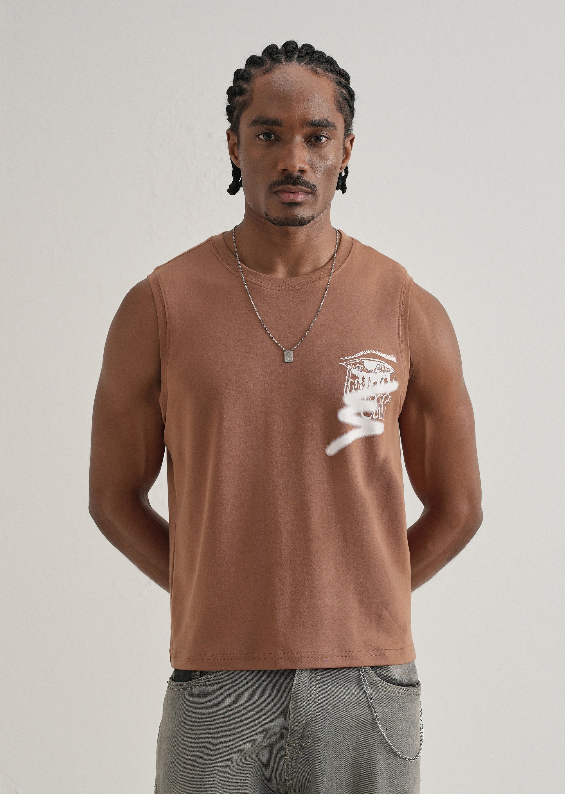 This sleeveless t-shirt crafted from soft and breathable fabric. Featuring a unique front print on chest of a dripping eye design paired with a spray-painted effect, it adds an artistic edge to your everyday look. The back showcases a bold spray-paint style typography print, making it a standout piece.