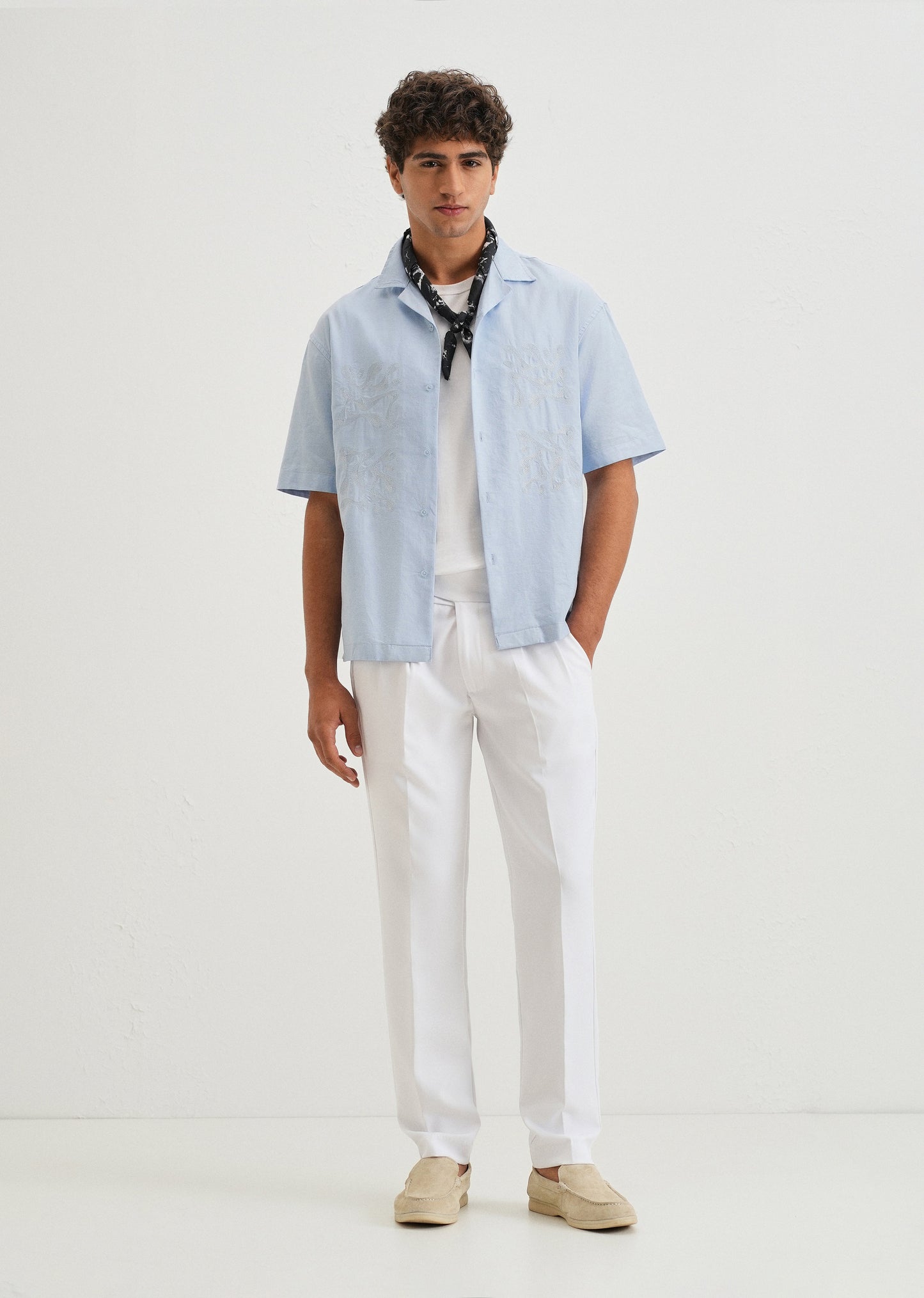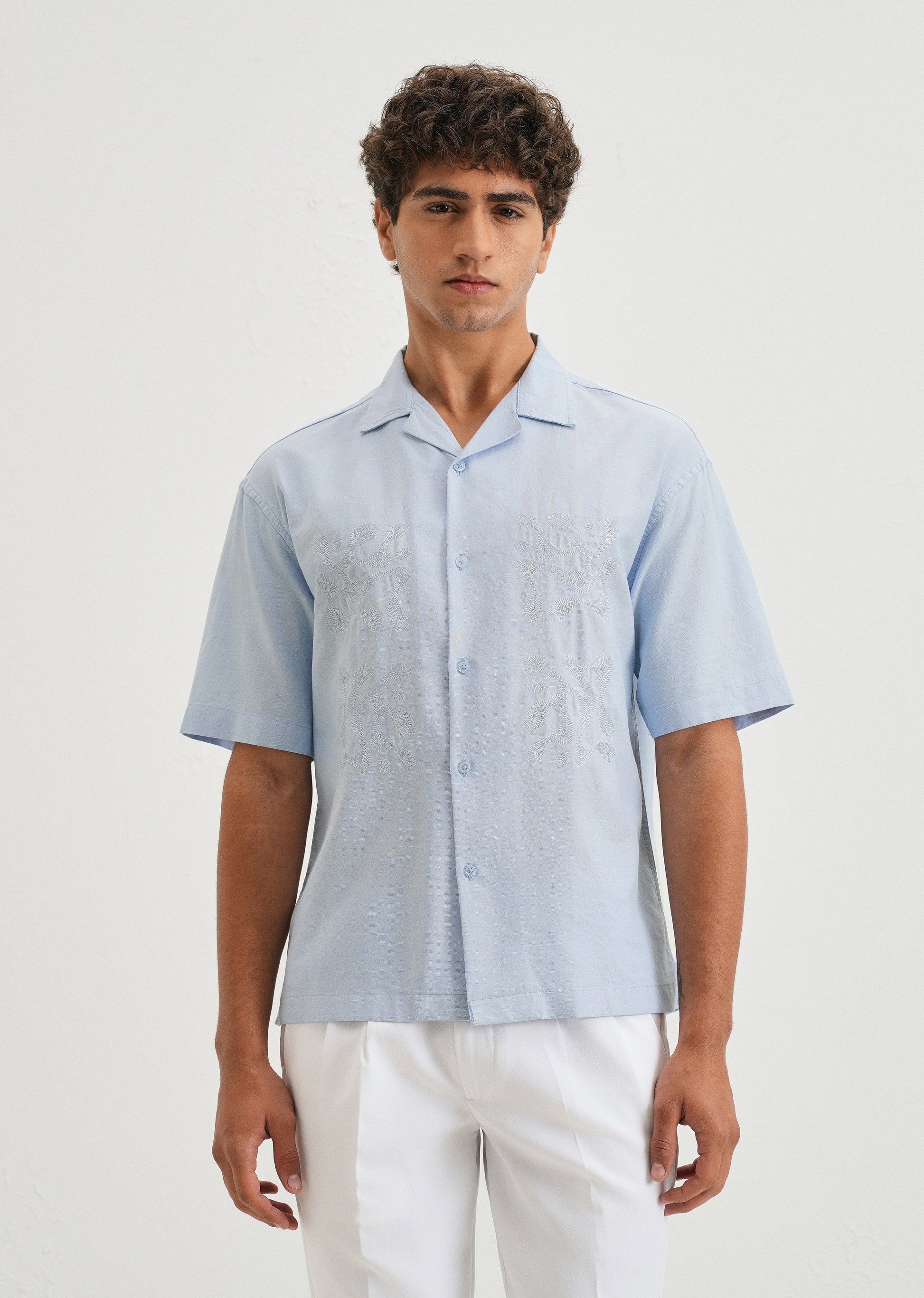 Sky Blue Embroidery Cuban Collar Cotton Shirt