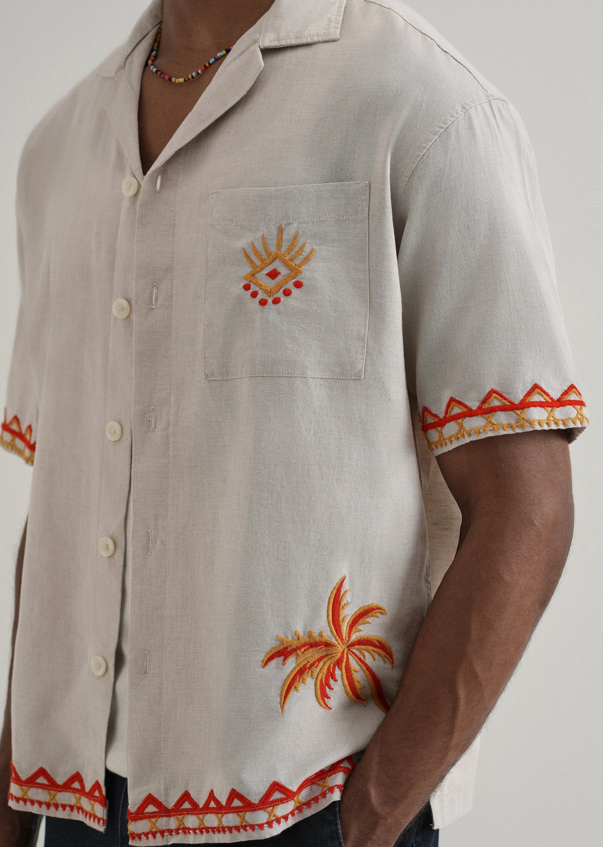 Tan Embroidery Cuban Collar Shirt