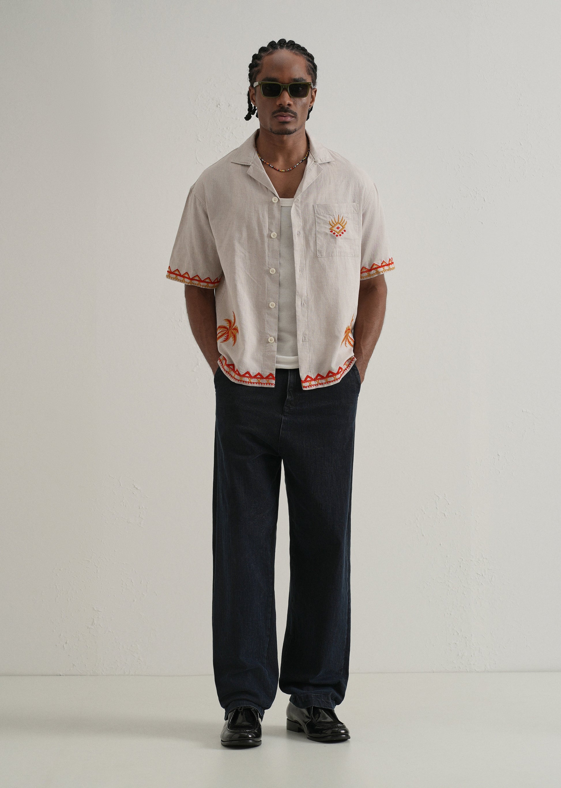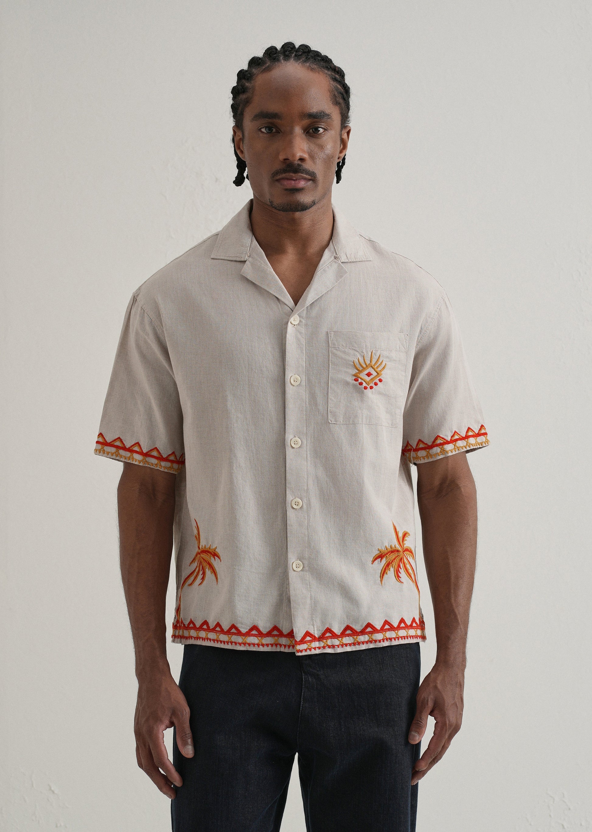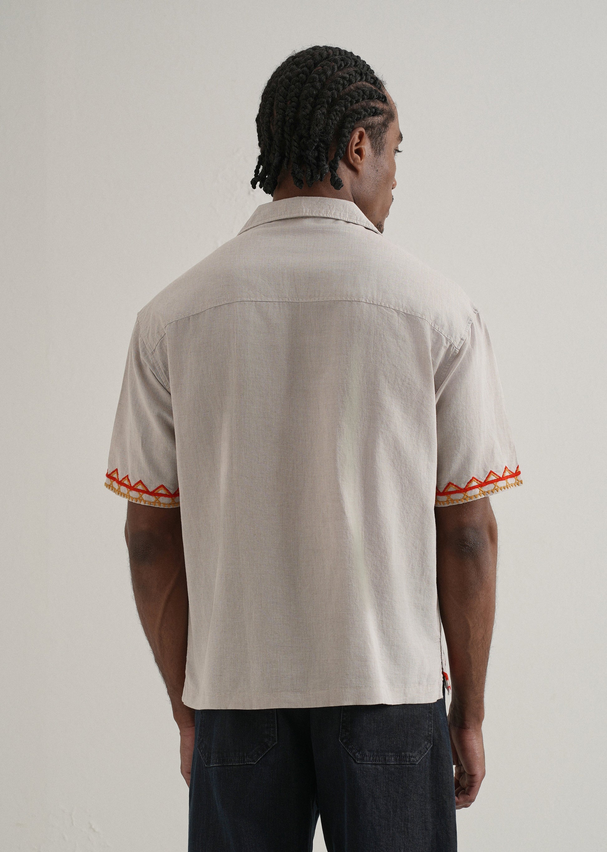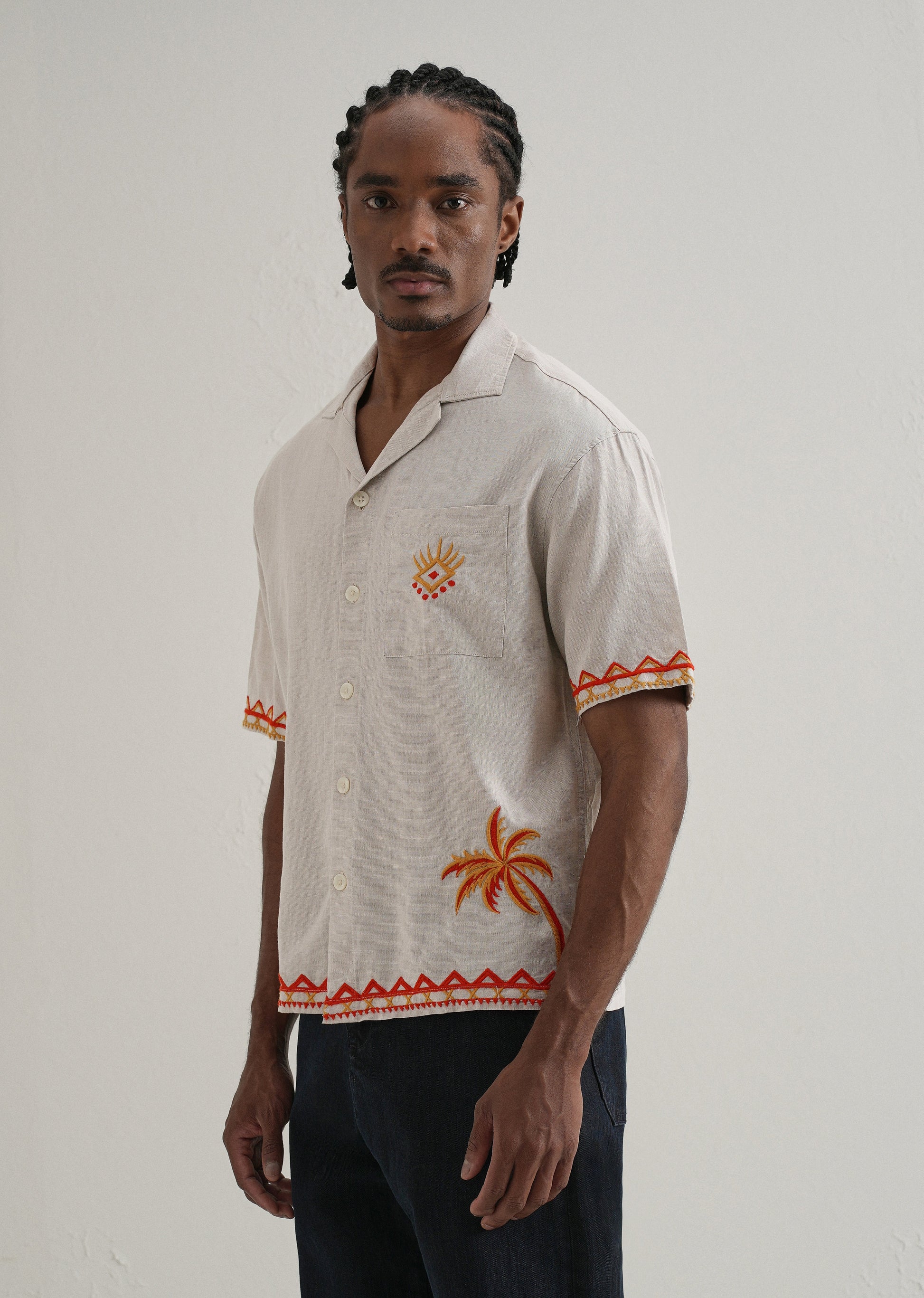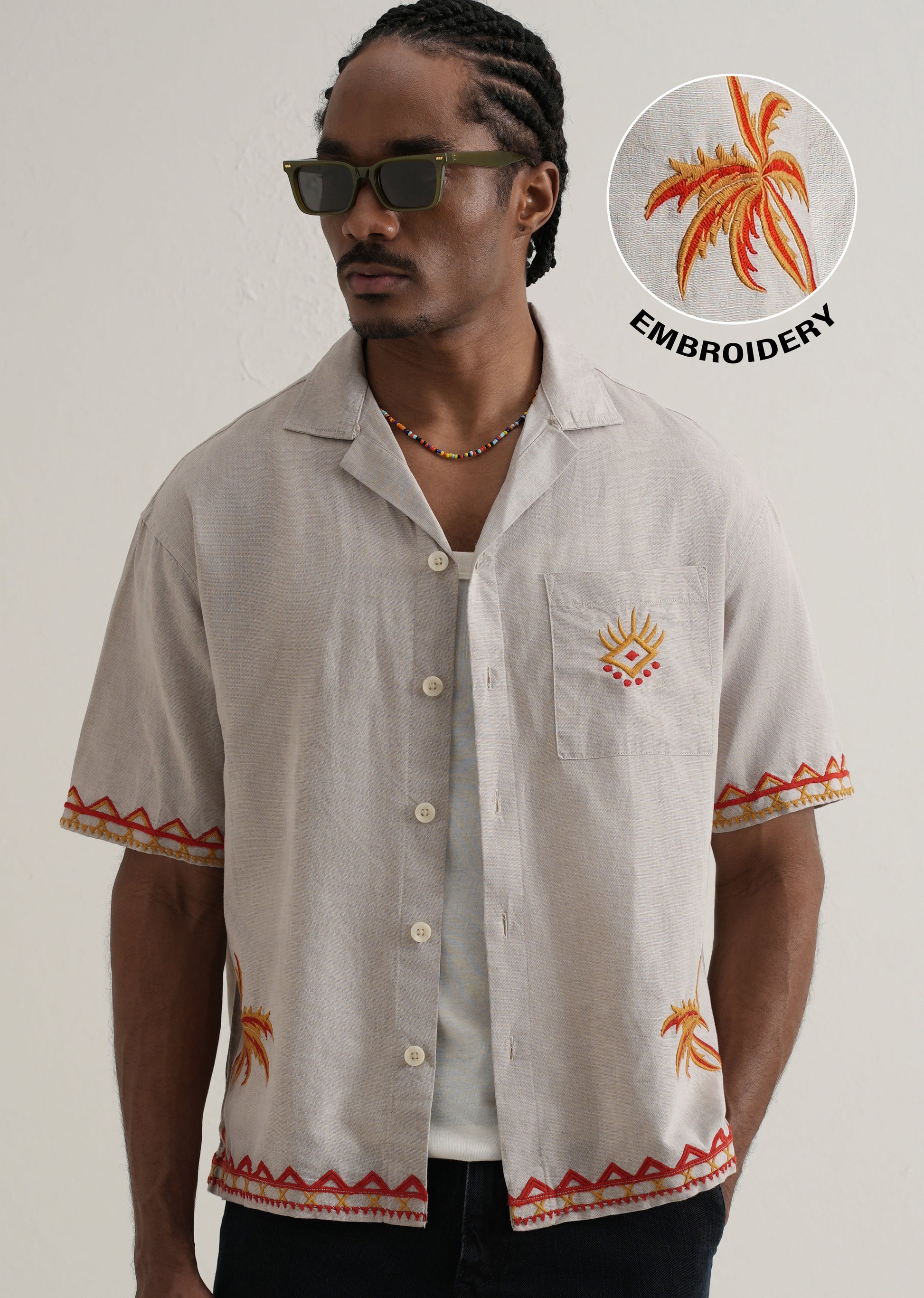 This is the perfect blend of style and comfort with our Embroidered Cuban collar Boxy fit Shirt. Crafted from cotton & linen fabric, this casual shirt features a button closure for easy wear. The standout embroidered adds a touch of elegance. Designed with a modern boxy fit and short sleeves, this shirt ensures a comfortable and trendy look.