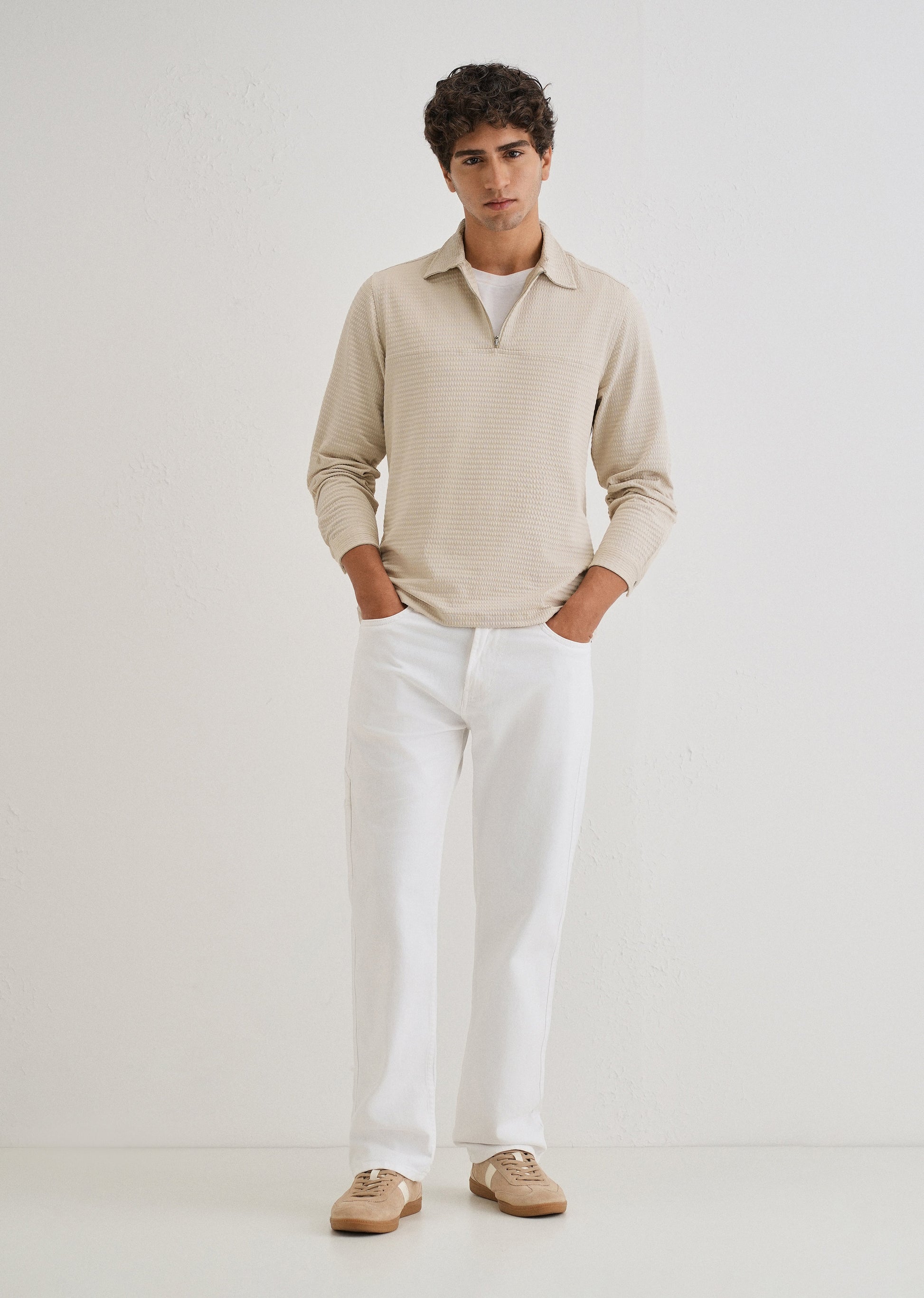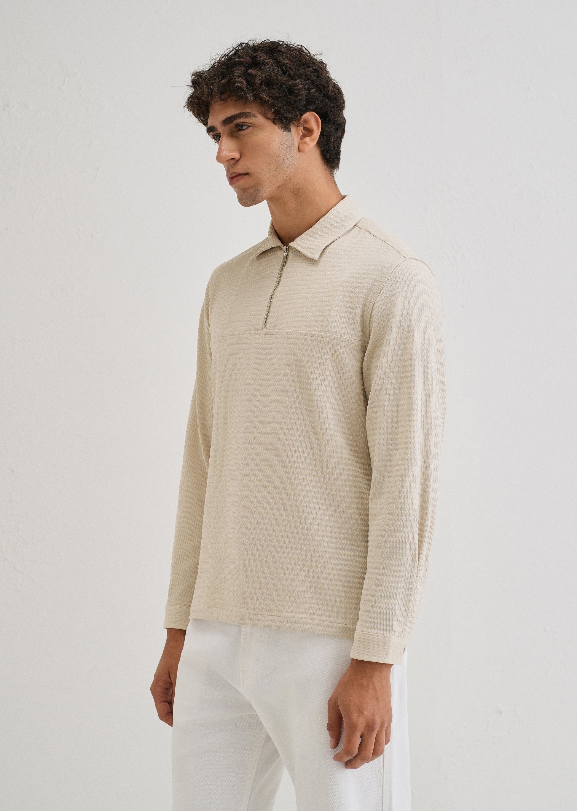 This versatile half-zip polo T-shirt. Designed in a textured knit fabric, it brings a refined yet relaxed edge to your everyday style. Crafted from poly blend interlock, this long-sleeve piece strikes the right balance between comfort and style. The classic polo collar with a sleek zip-up detail adds a modern twist, making it easy to dress up.