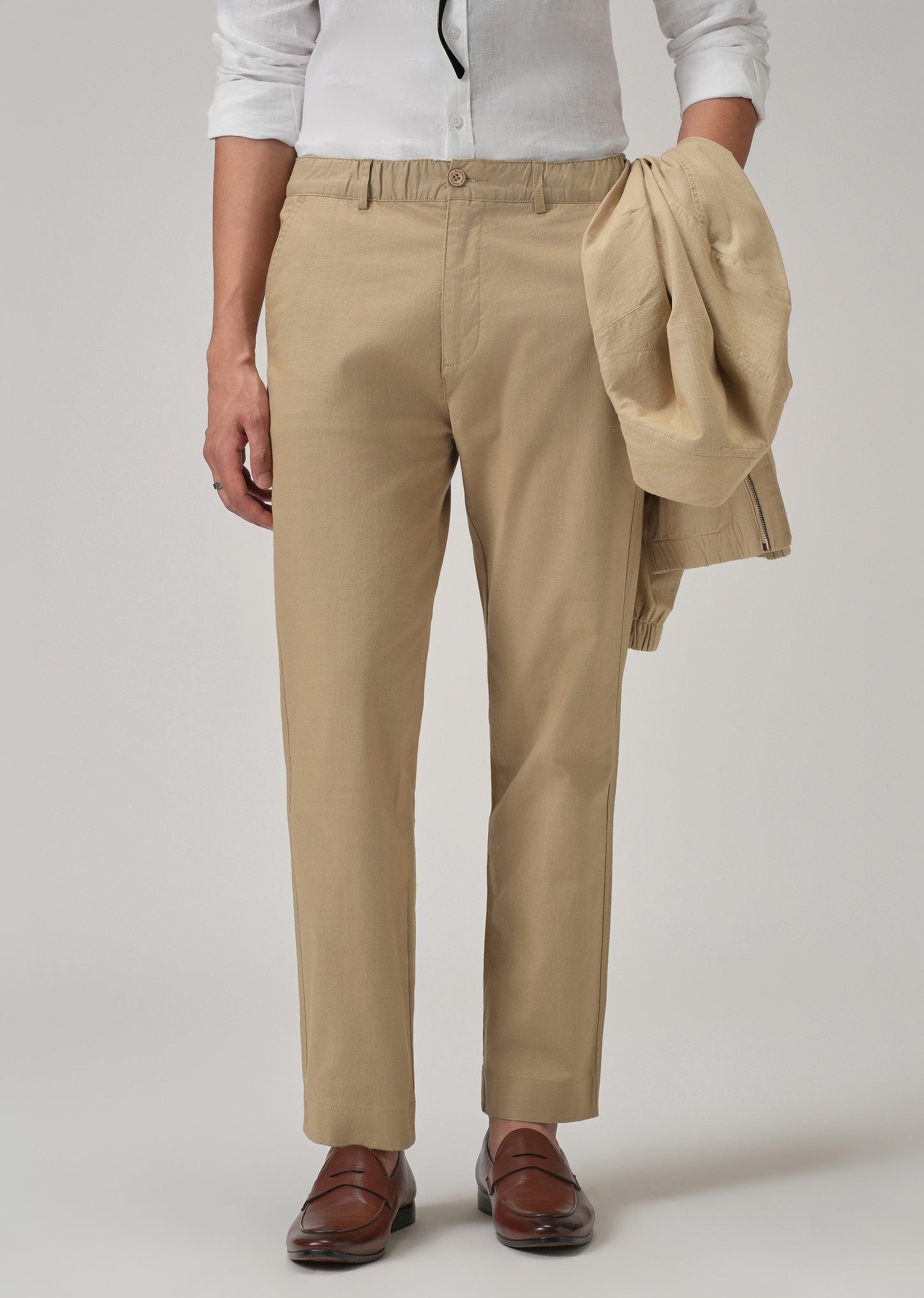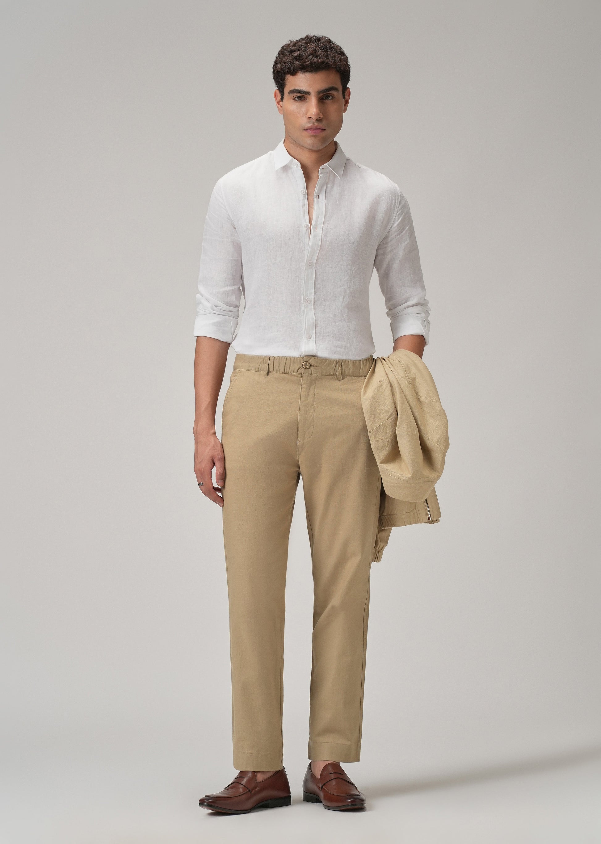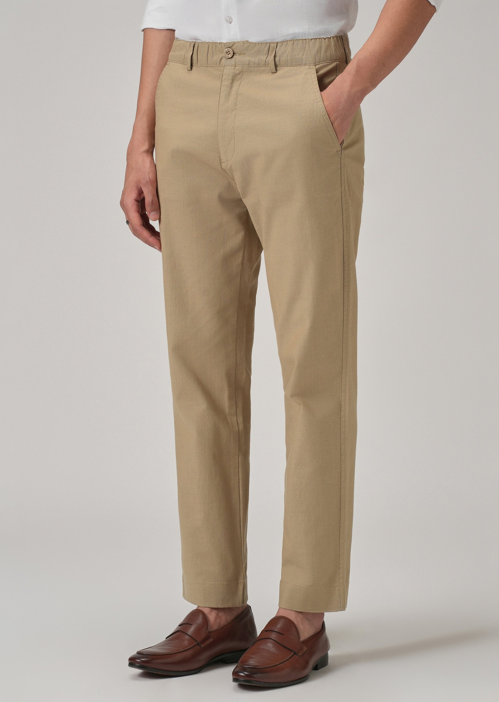 Relaxed, refined, and ready for wherever the day takes you. Designed for everyday comfort with a clean silhouette, these cotton trousers are a versatile wardrobe essential. The concealed zipper adds a seamless touch, while the elasticated waistband ensures ease without sacrificing structure.